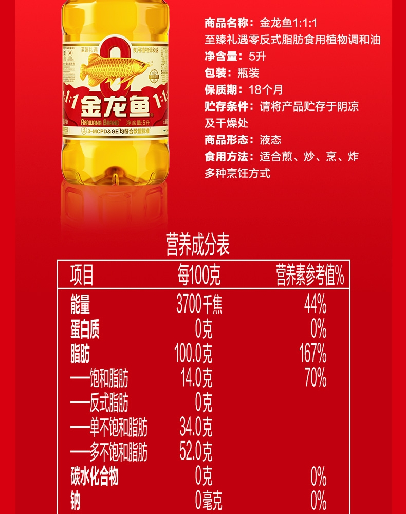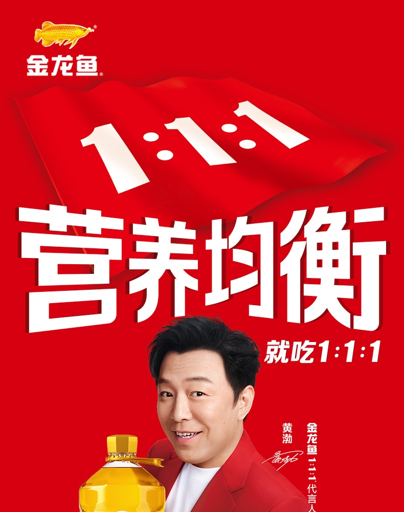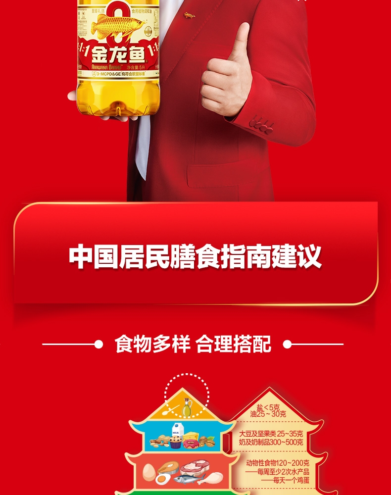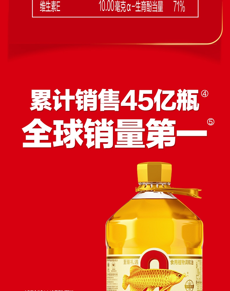 食用油位于平衡膳宝塔塔尖对健康很重要 ;金龙鱼1:1:1黄金比例食用植物调和油科学的配比;富含维生素E,维生素E有抗氧化作用
