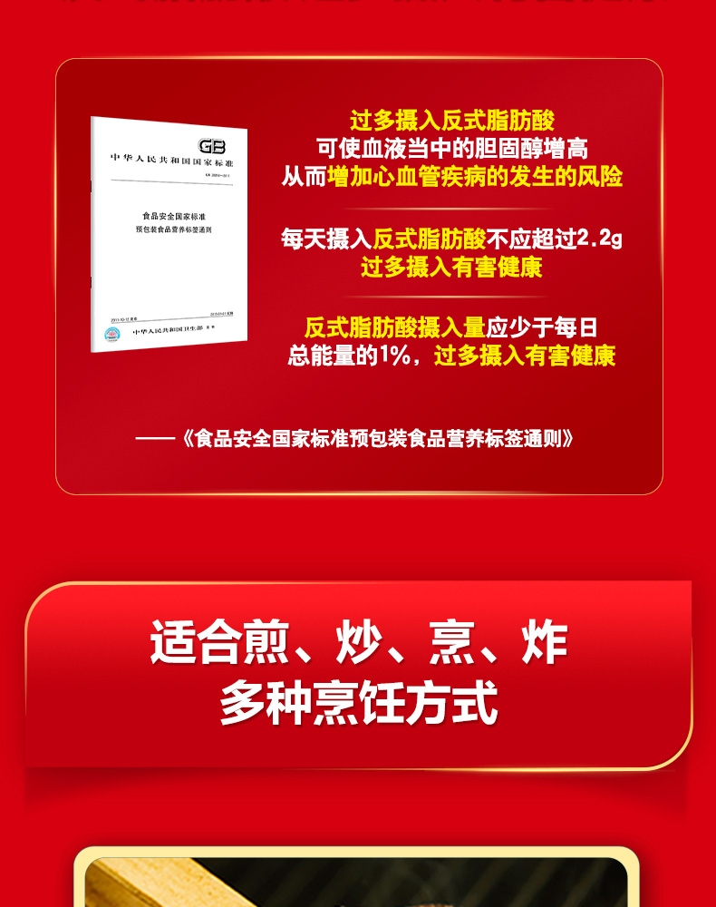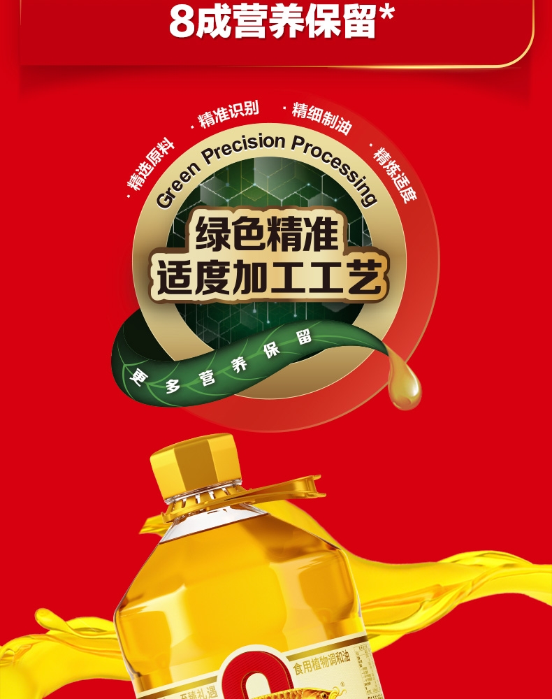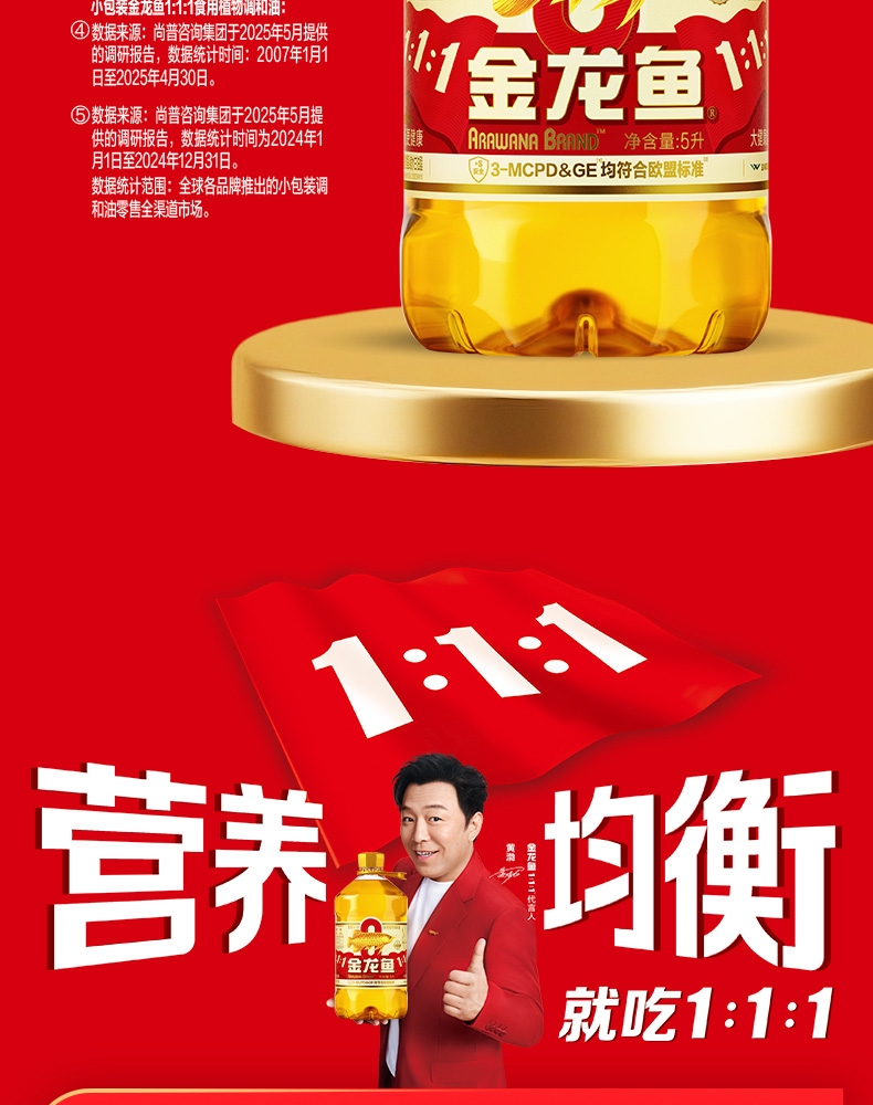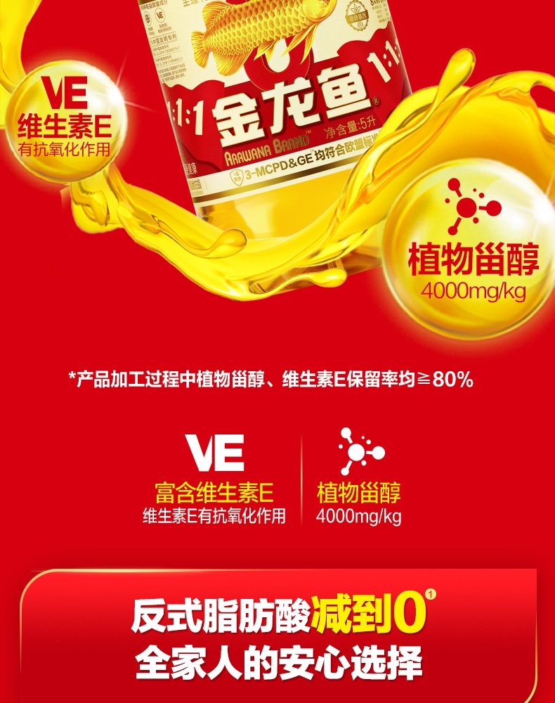 食用油位于平衡膳宝塔塔尖对健康很重要 ;金龙鱼1:1:1黄金比例食用植物调和油科学的配比;富含维生素E,维生素E有抗氧化作用