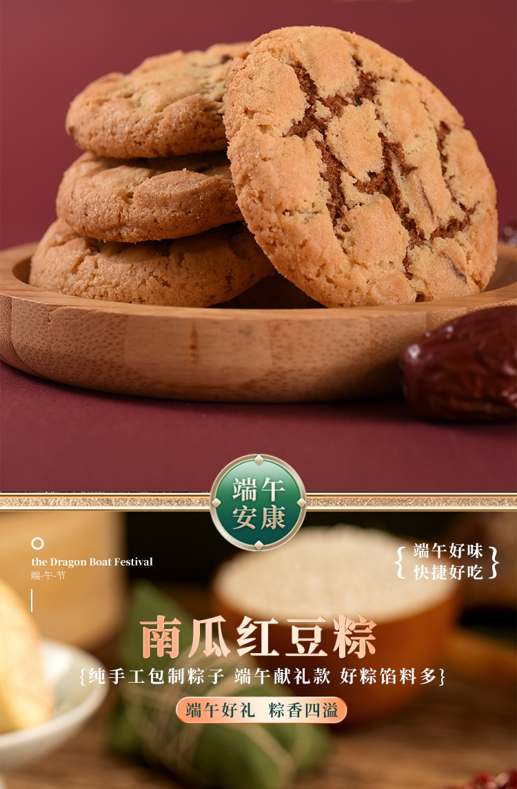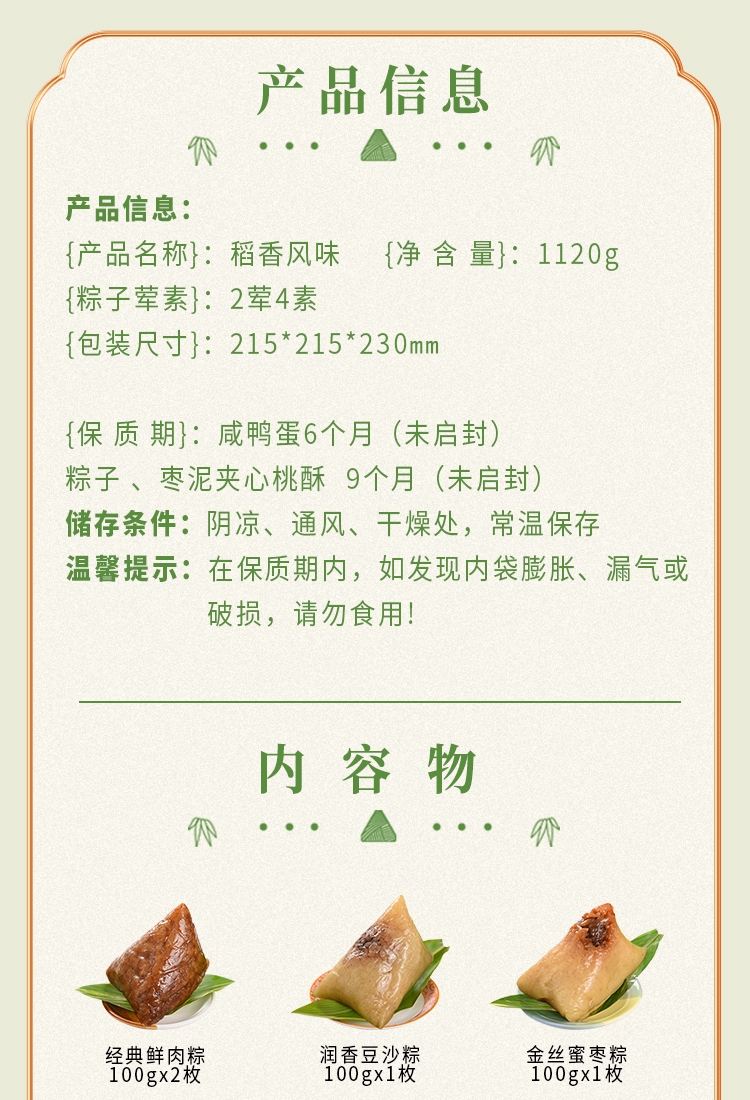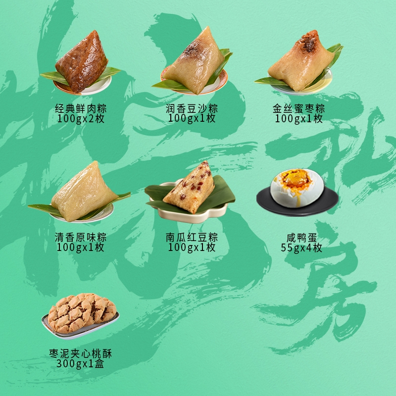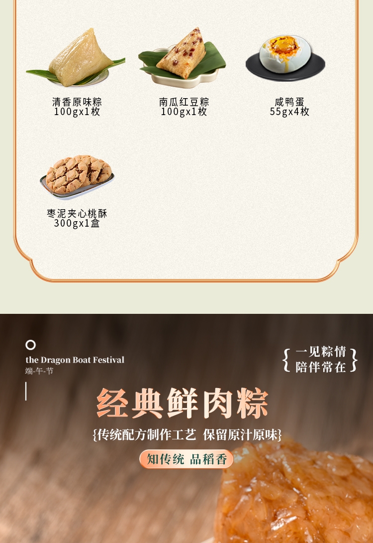 配置:经典鲜肉粽100g*2枚 润香豆沙粽100g*1枚 南瓜红豆粽100g*1枚 金丝蜜枣粽100g*1枚 清香原味粽100g*1枚 咸鸭蛋55g*4枚*1盒 枣泥夹心桃酥300g*1盒