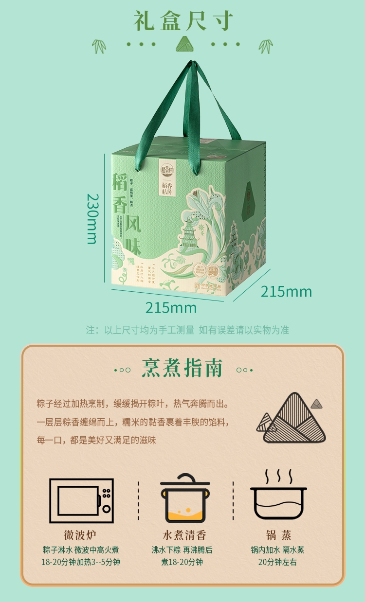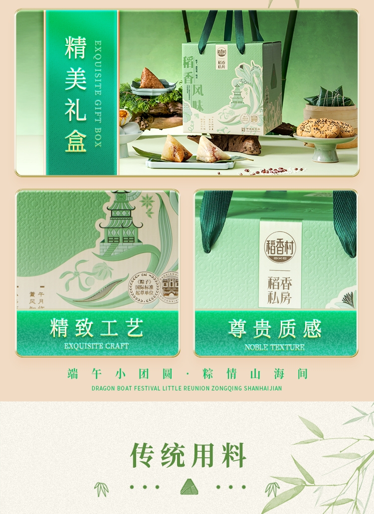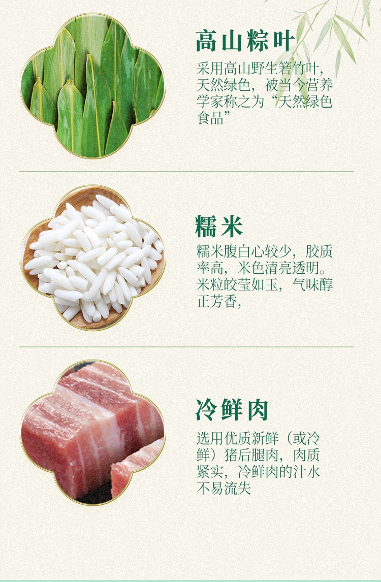 内馅丰富,粒粒饱满 端午好味 快捷好吃;缤纷鲜粽 咸甜荟萃 ;精致工艺 尊贵质感