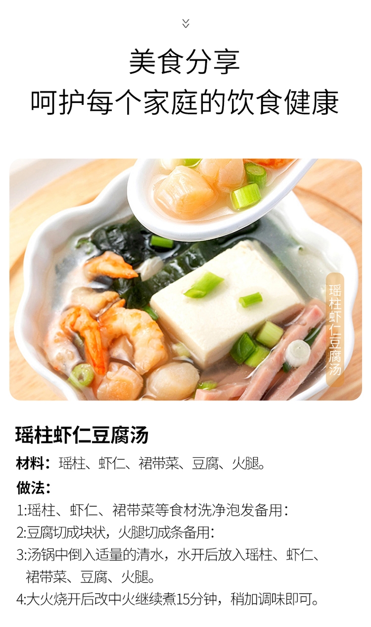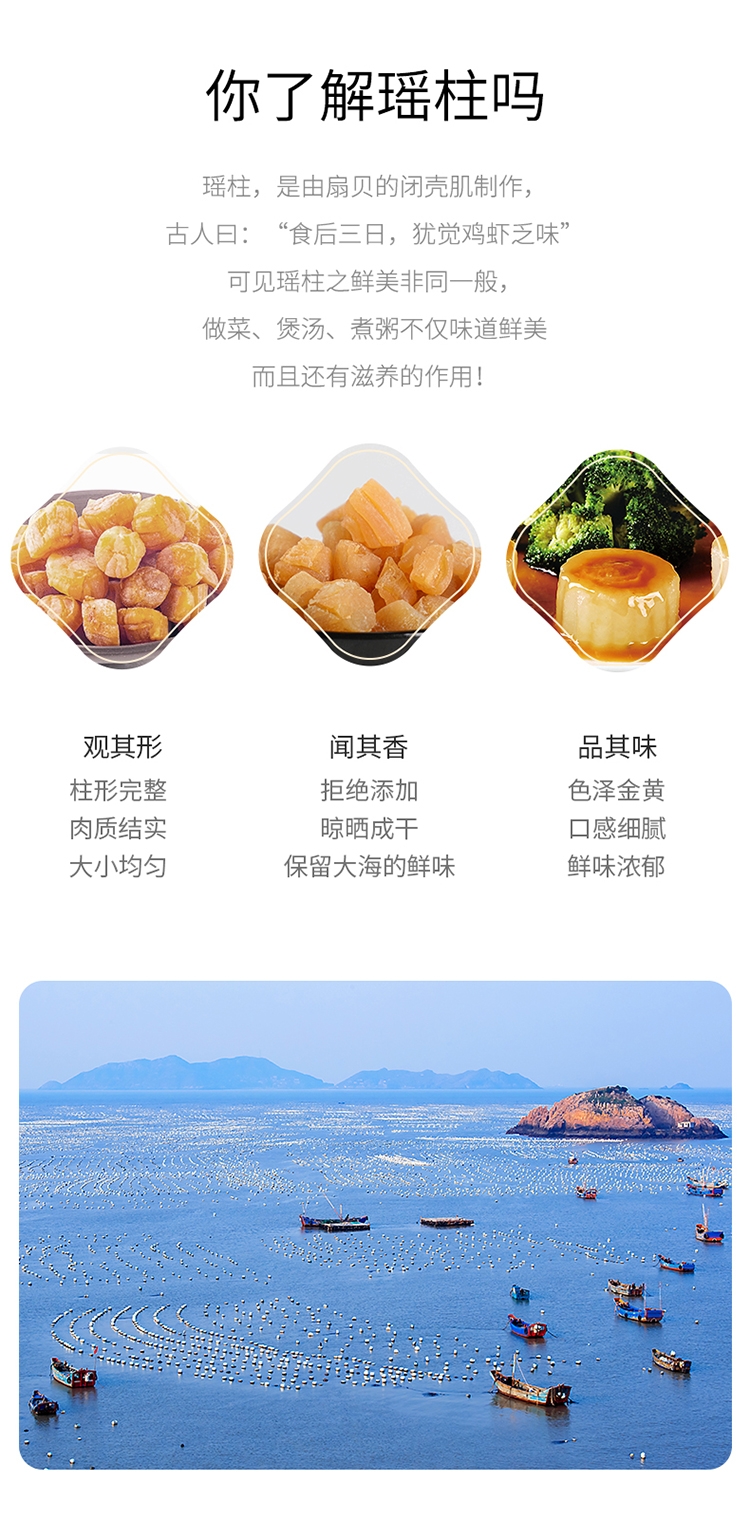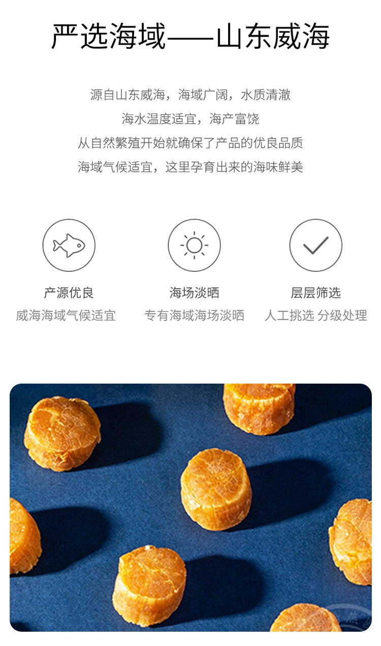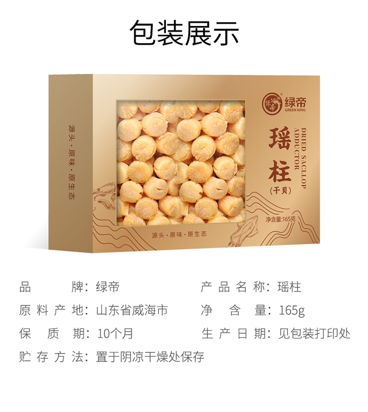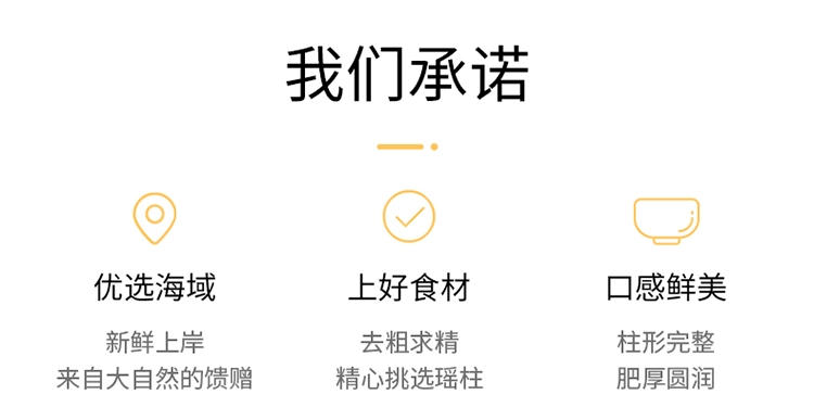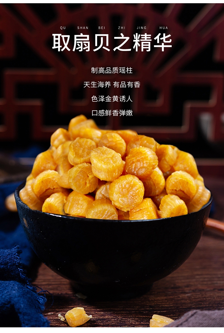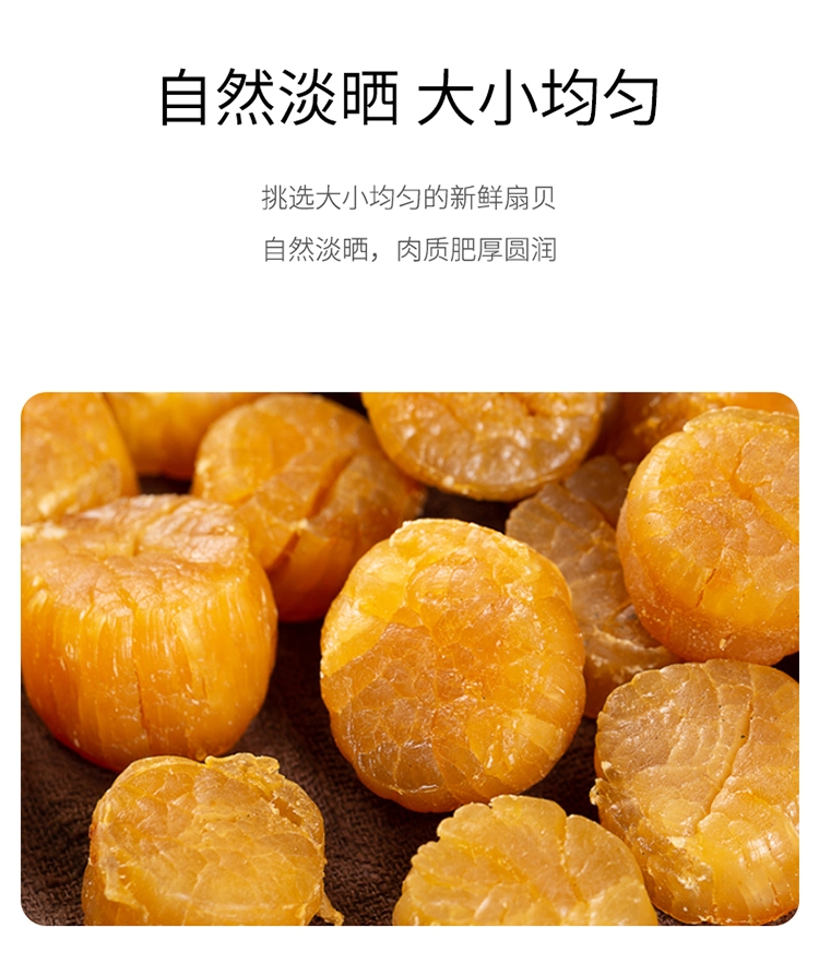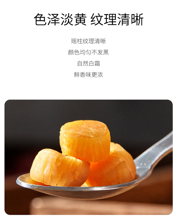 干贝饱满,鲜醇无腥;淡干无盐,煲汤鲜甜;165g 精装,品质瑶柱