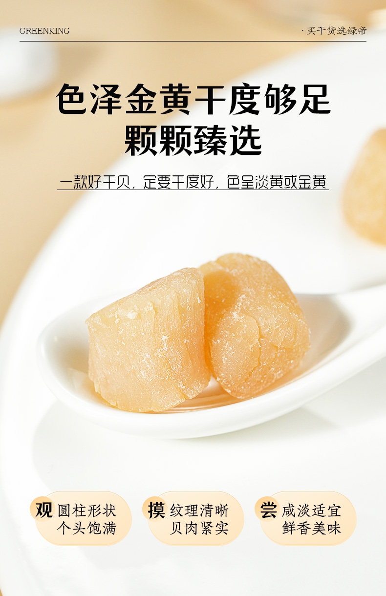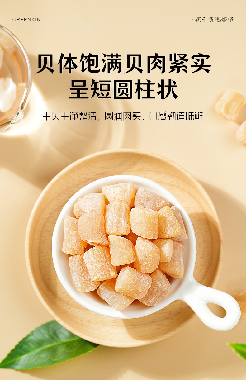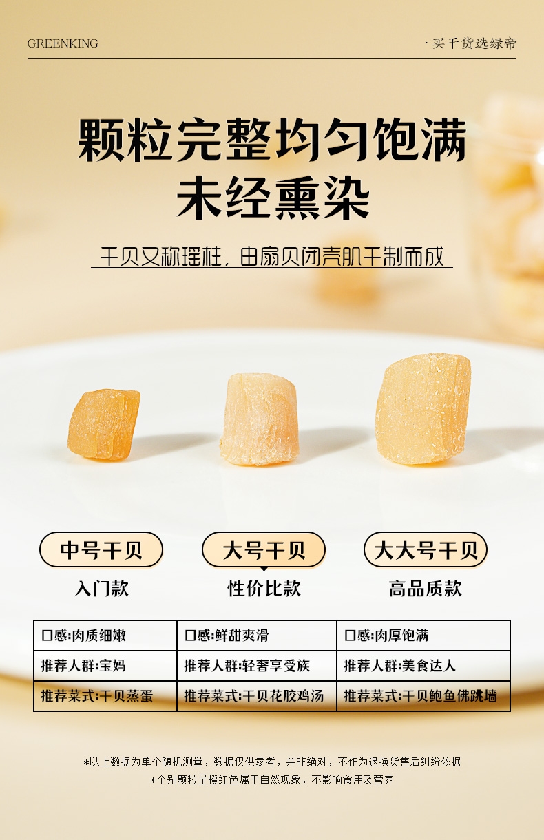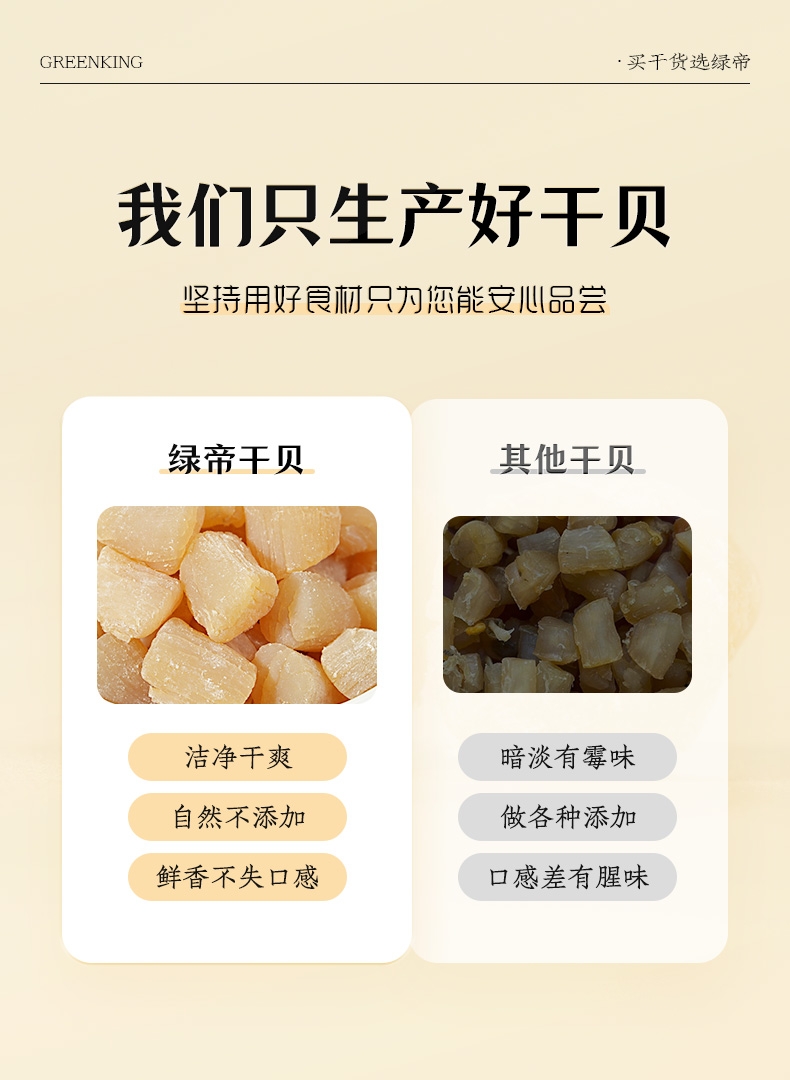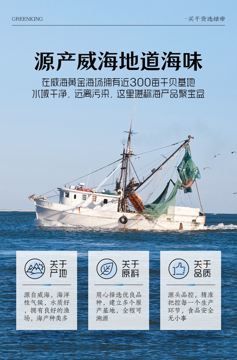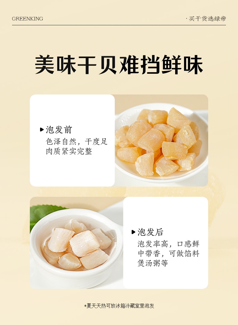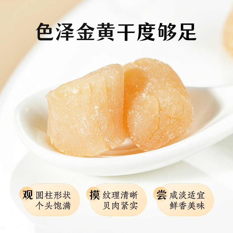 足干淡晒,肉质紧实;颗颗精选,无碎无杂;海味浓郁,鲜香纯正