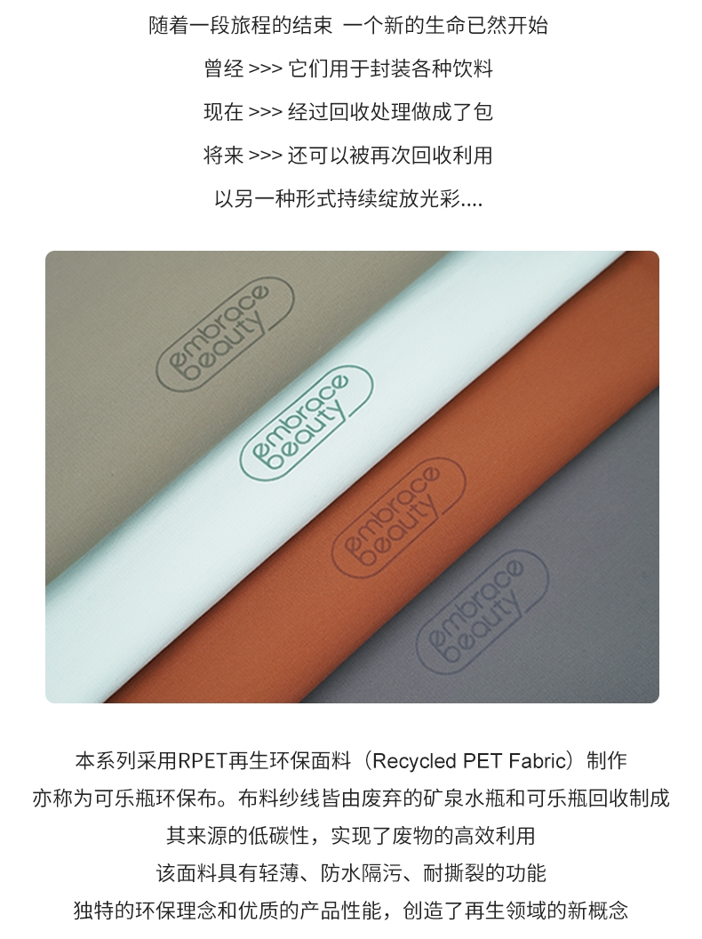 材质:RPET环保再生聚酯纤维、防水斜纹聚酯纤维