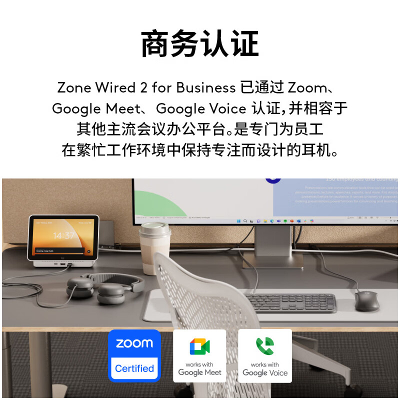 通过zoom、google商务认证;可自动调节式主动降噪;双降噪麦克风可有效抑制背景噪音