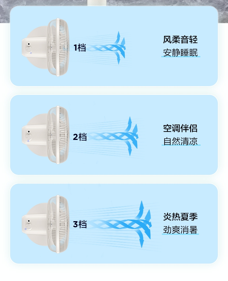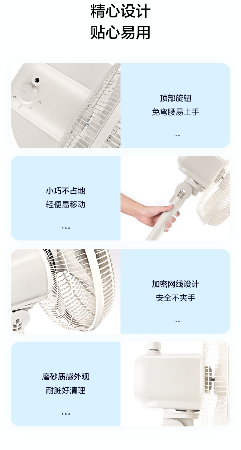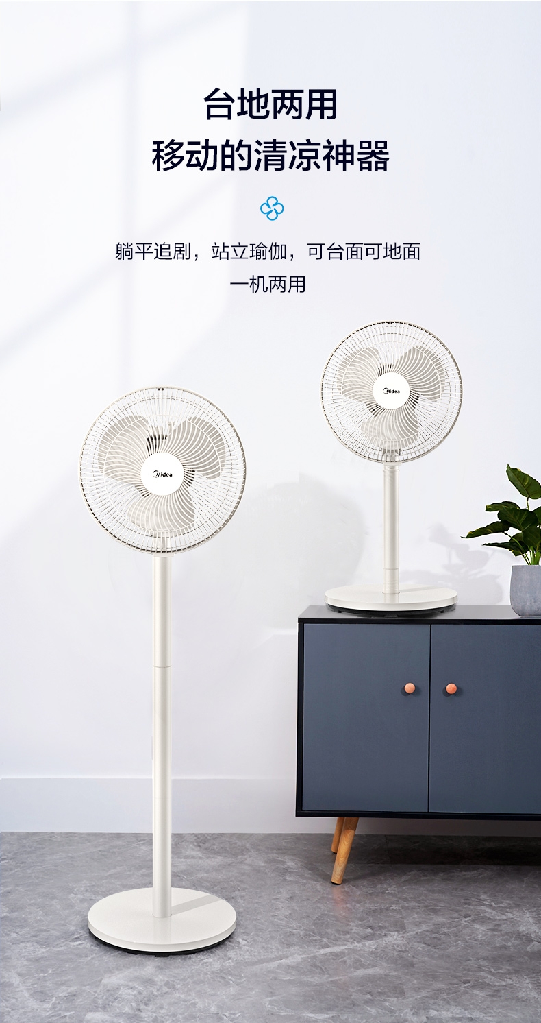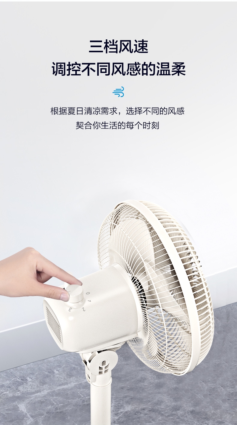 立柱可自由拼接,台地两用;;电机10年质保,品质可靠;;三片风叶,三档风速;