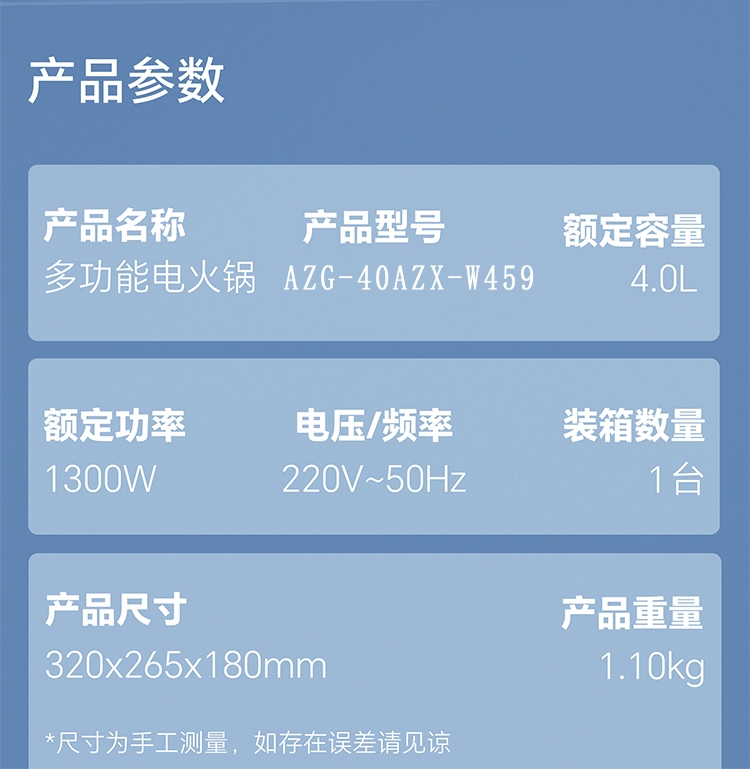 一锅多用,煎/炒/焖/煮/炖/涮;4L容量,可1-4人使用;1300W两档火力可调;麦饭石色粘涂层,易清洁不粘锅;