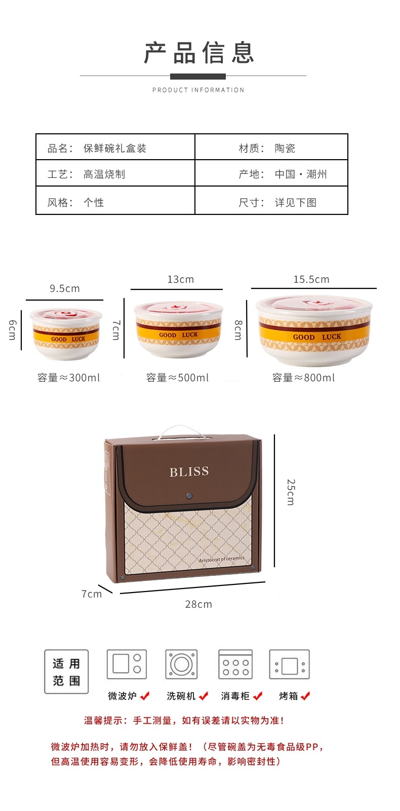 以高温淬炼瓷质,以精致诠释格调;可微波可机洗,锁鲜不串味;大中小三个尺寸,从带饭到保鲜全搞定;密封盖一盖,剩菜、食材直接锁鲜,冰箱再也不串味了;乔迁新居、节日送礼、员工福利的好选择