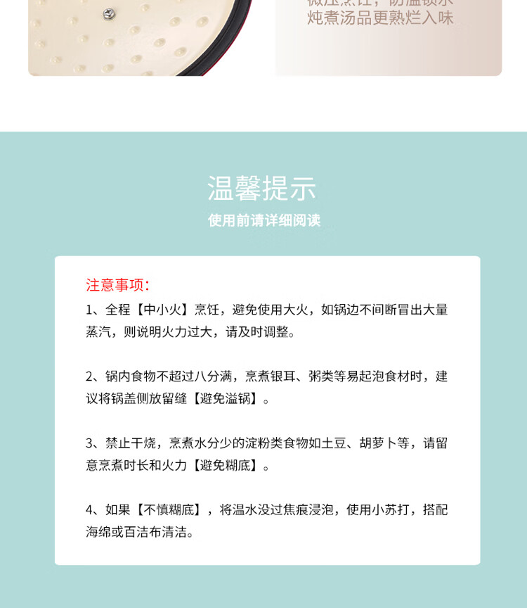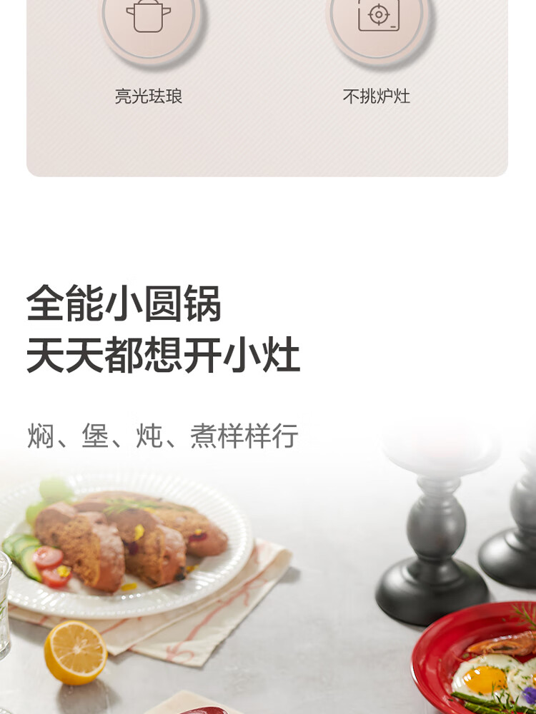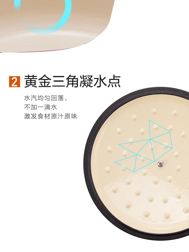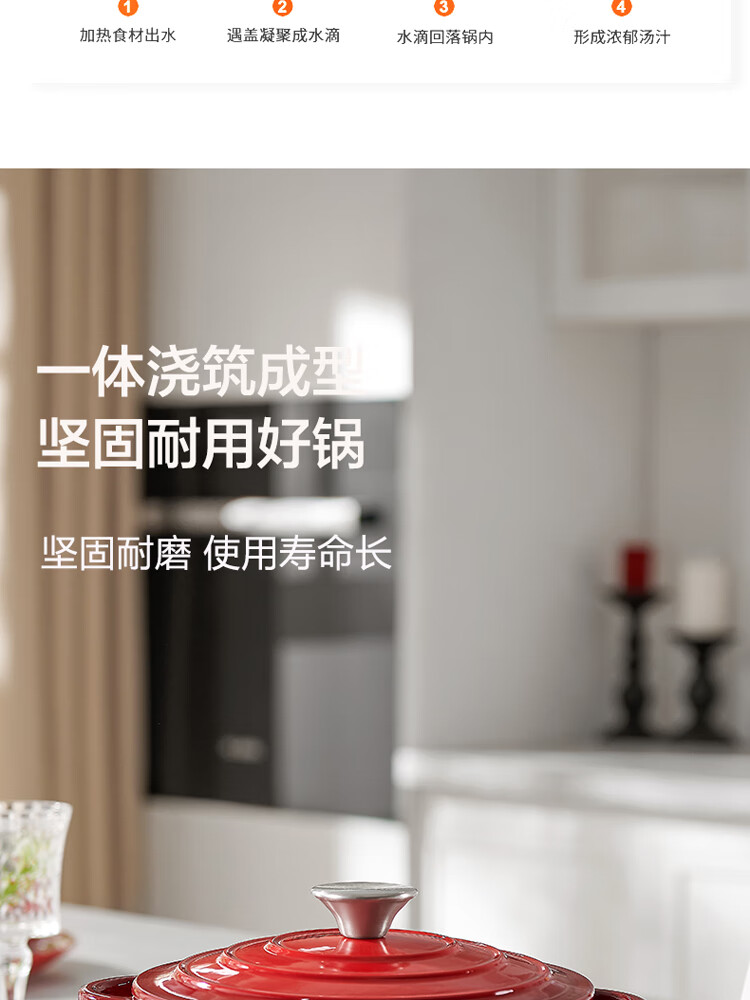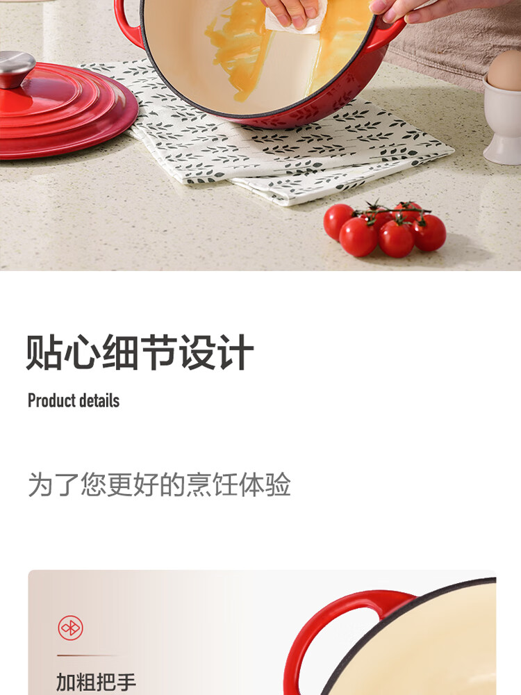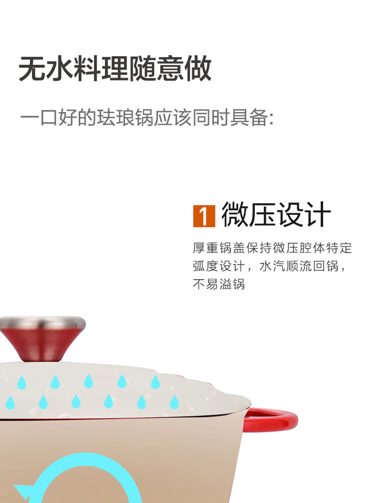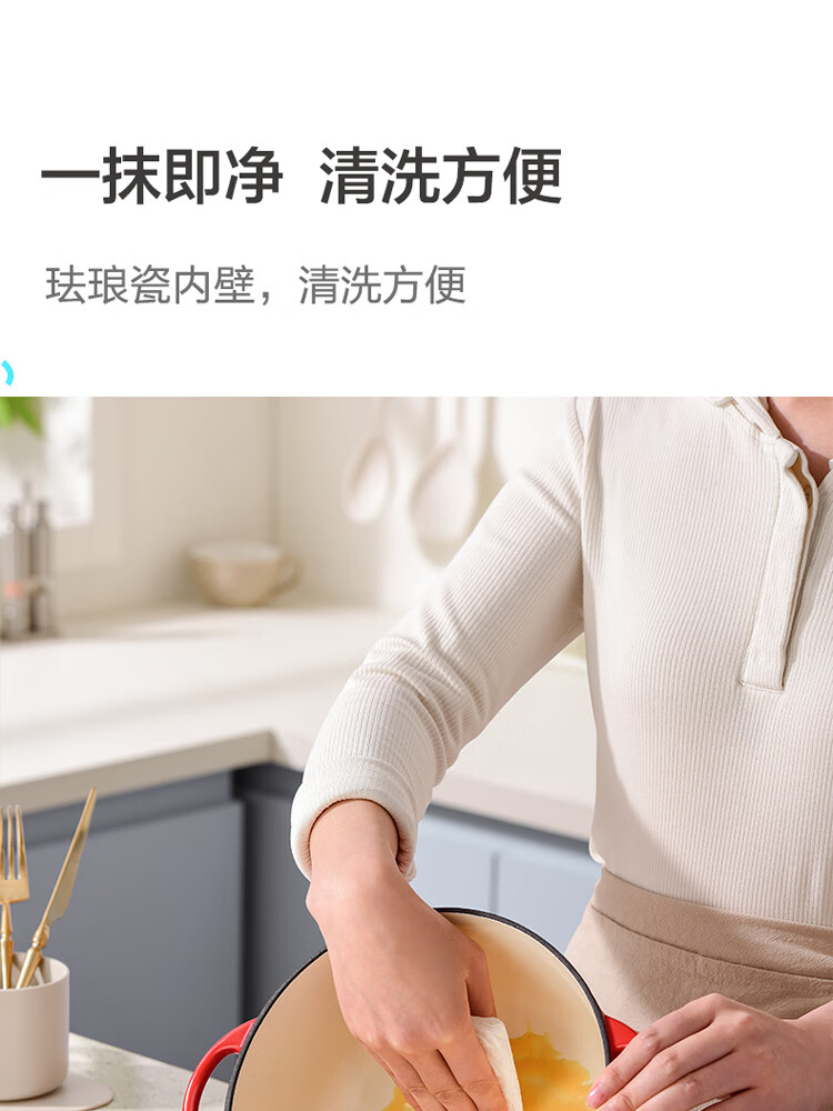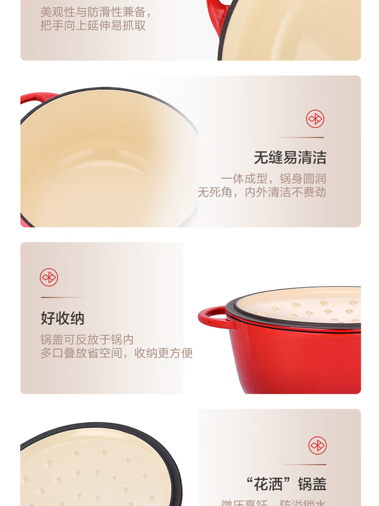 铸铁材质,一体成型,敦实锅体;细火慢炖,充分释放食材美味;珐琅瓷内壁,亮光珐琅涂层,色彩典雅,光滑美观