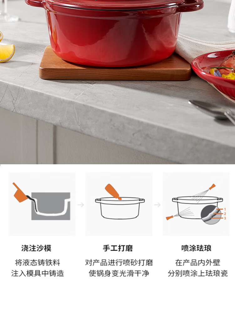 材质:铸铁+搪瓷(珐琅)食品接触用