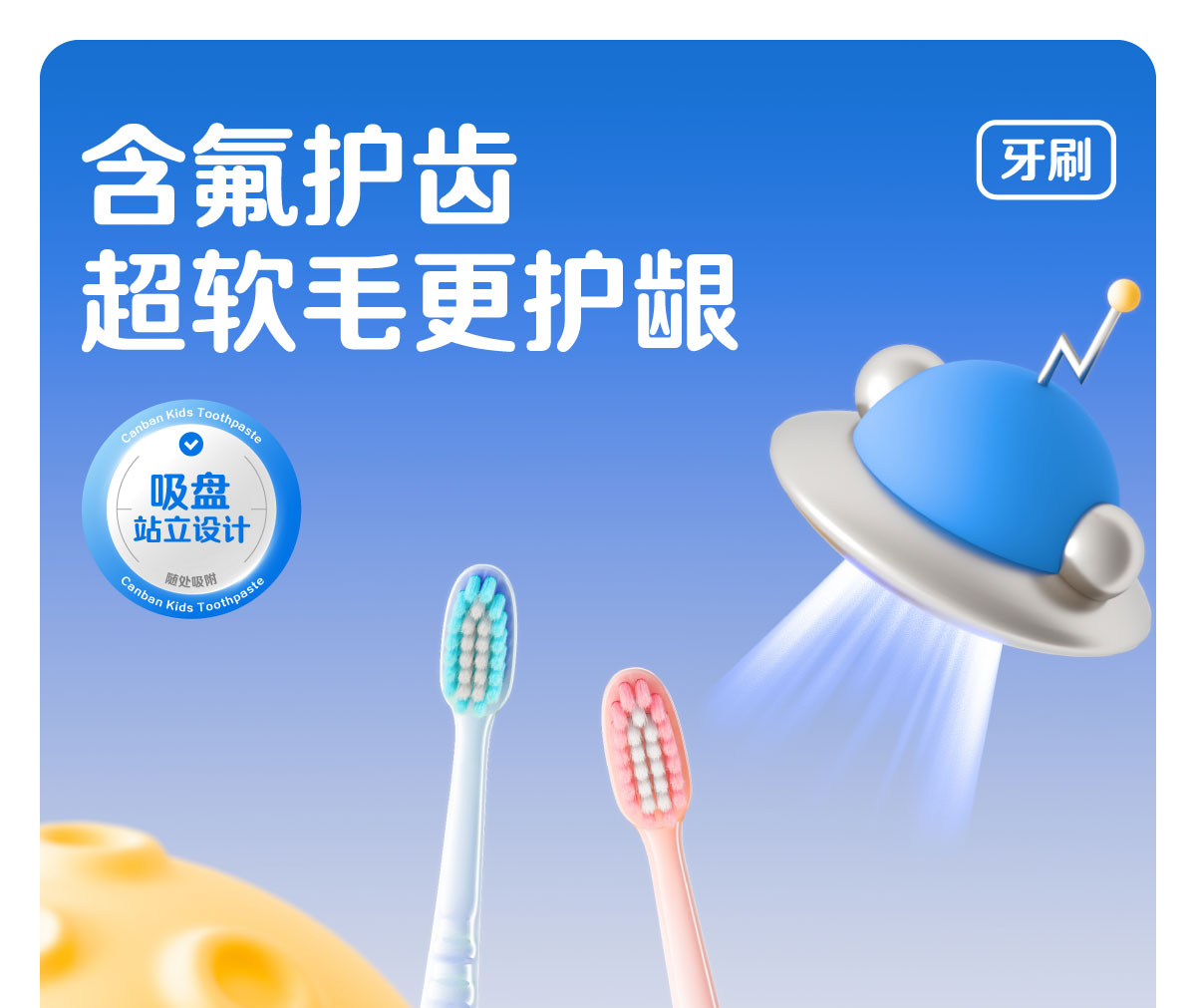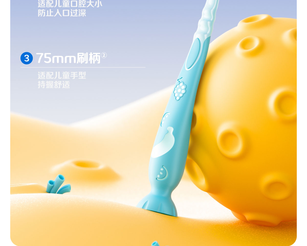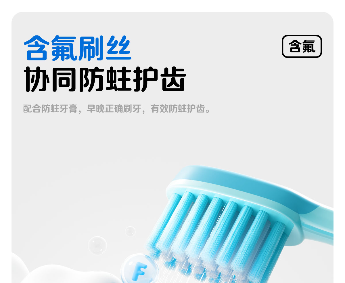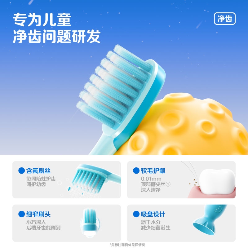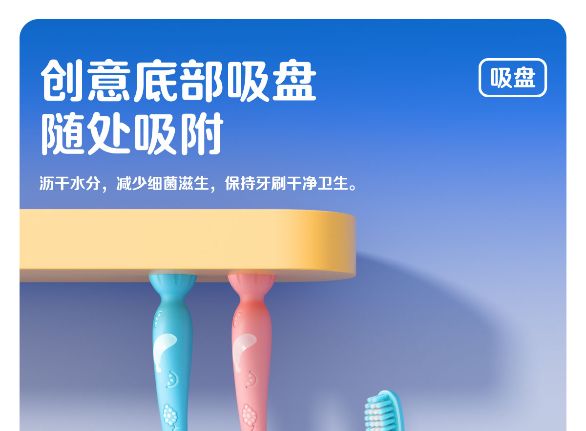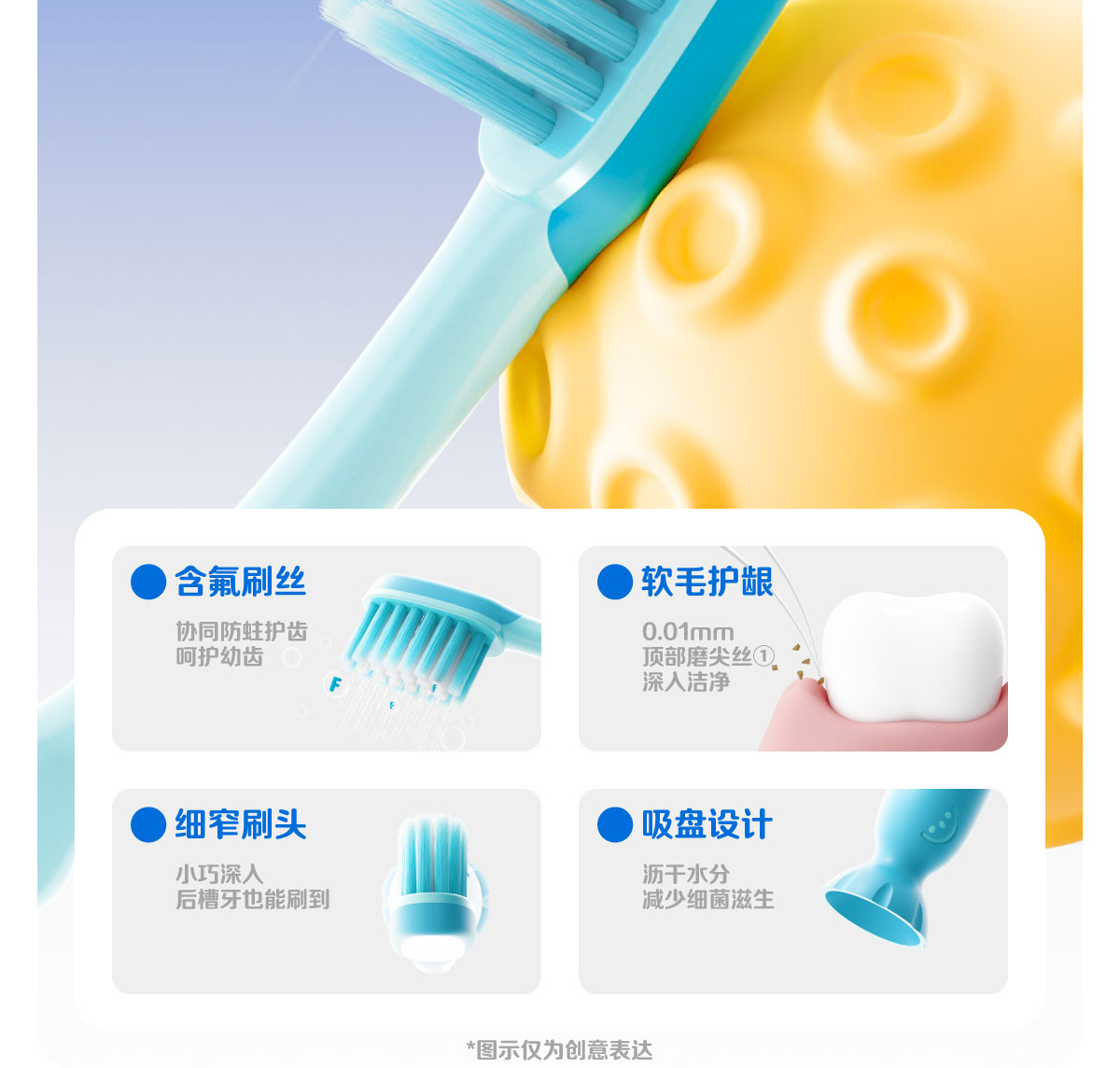 超软细密刷毛,温和护龈,轻柔呵护宝宝幼嫩牙齿;含氟护齿配方,有效防蛀防龋,坚固牙釉质;可爱吸盘底座,摆放干净卫生,宝宝爱刷牙