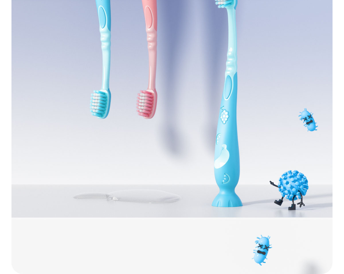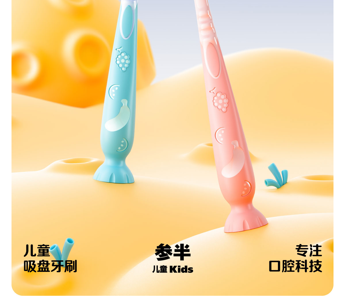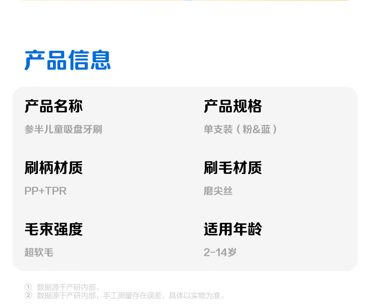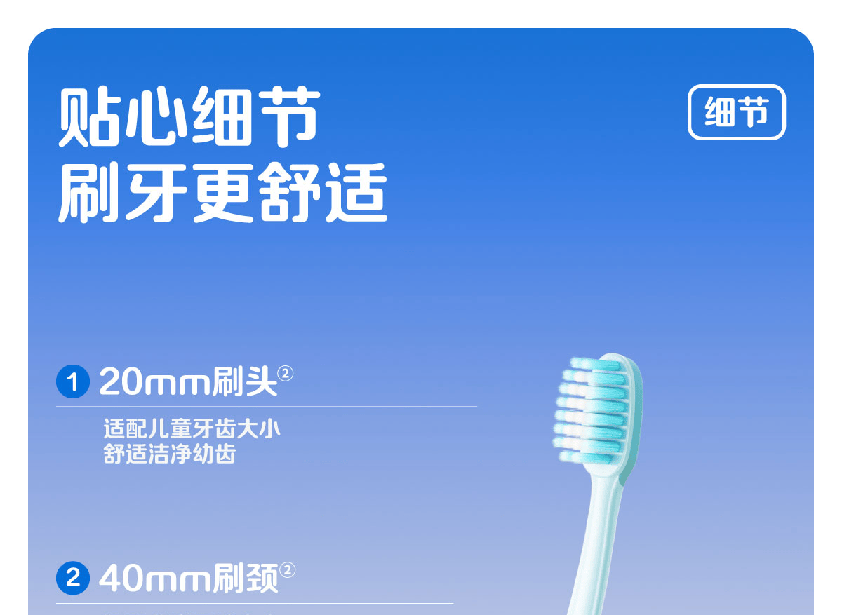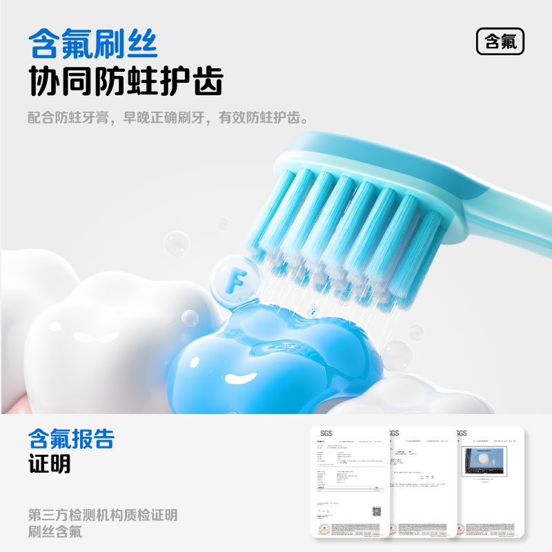超软细密刷毛,温和护龈,轻柔呵护宝宝幼嫩牙齿;含氟护齿配方,有效防蛀防龋,坚固牙釉质;可爱吸盘底座,摆放干净卫生,宝宝爱刷牙