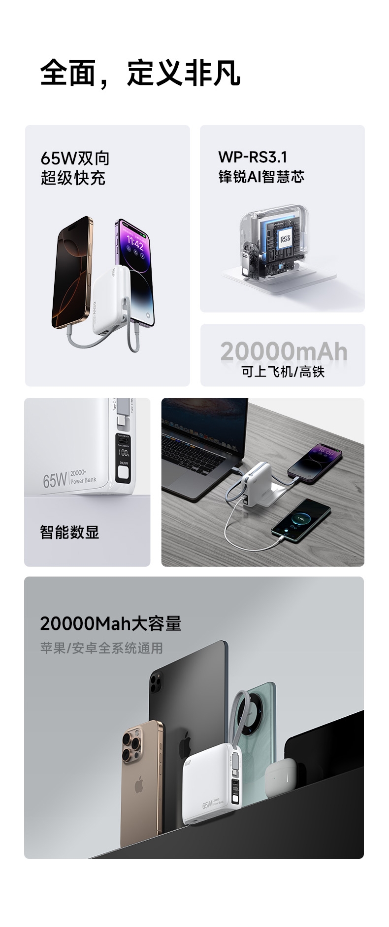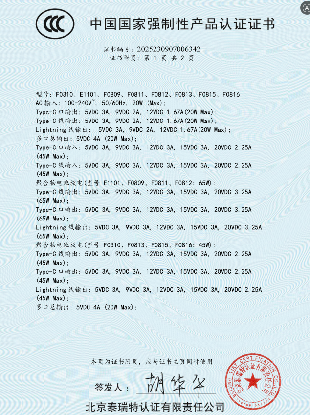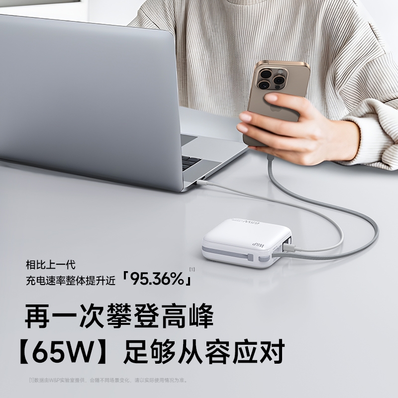自带隐藏式AC插头和双快充线;65W双快充,LED数显电量;符合国家3C认证,放心品质无忧