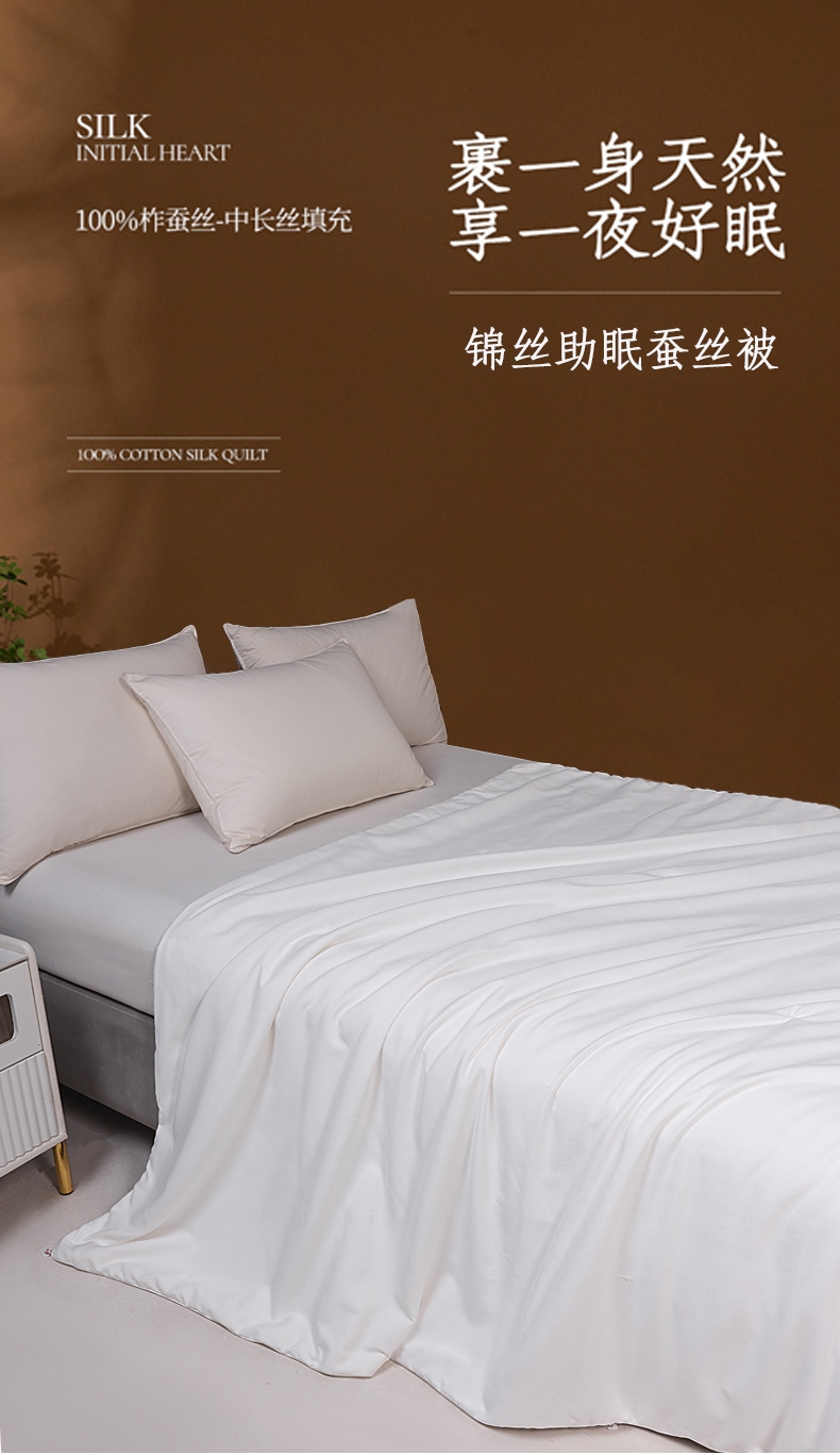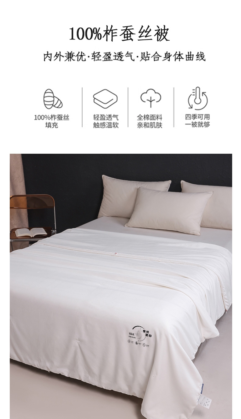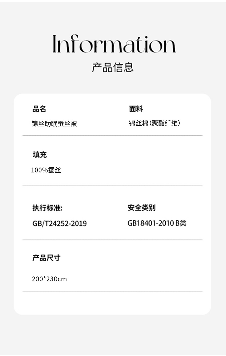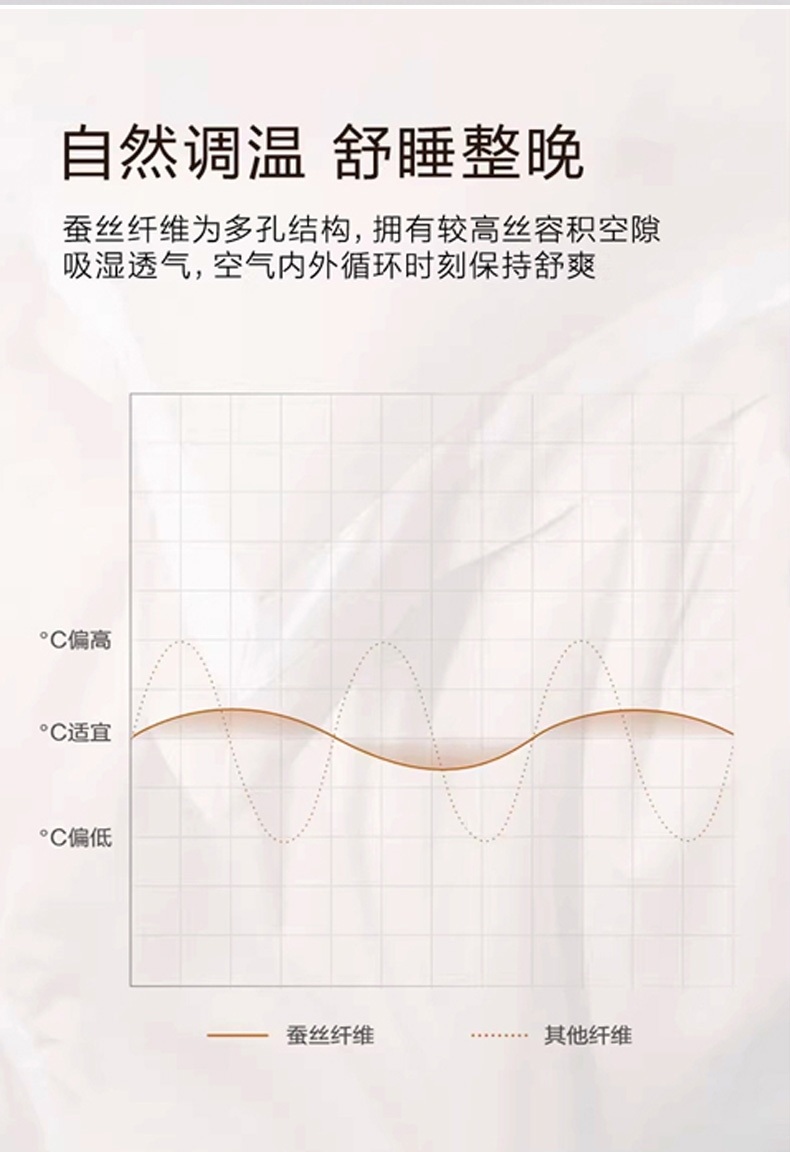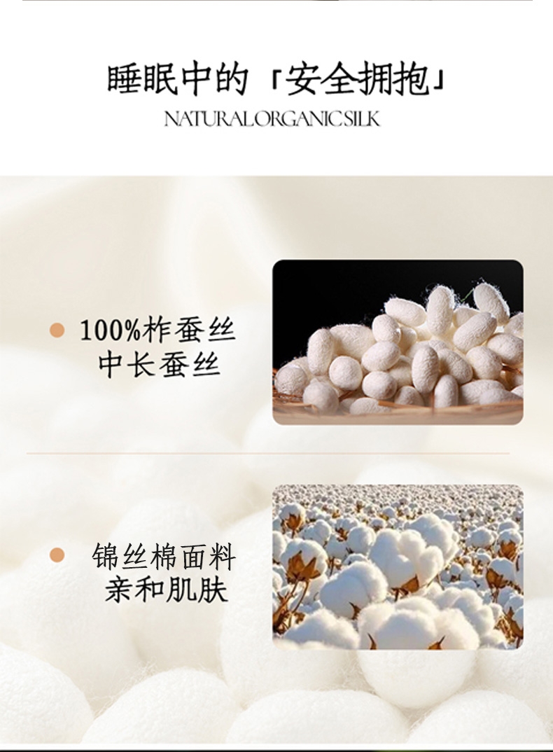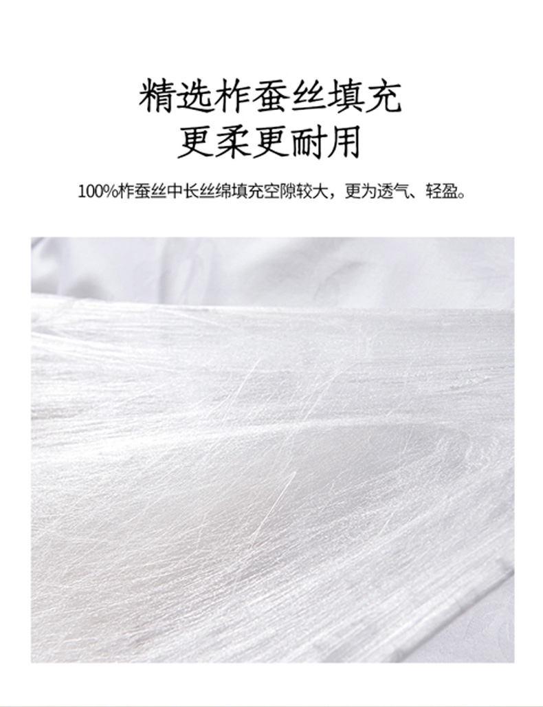 填充100%蚕丝;锦丝棉天然纤维,轻盈软糯;给肌肤云朵般的舒适包裹感,有效提升睡眠质量