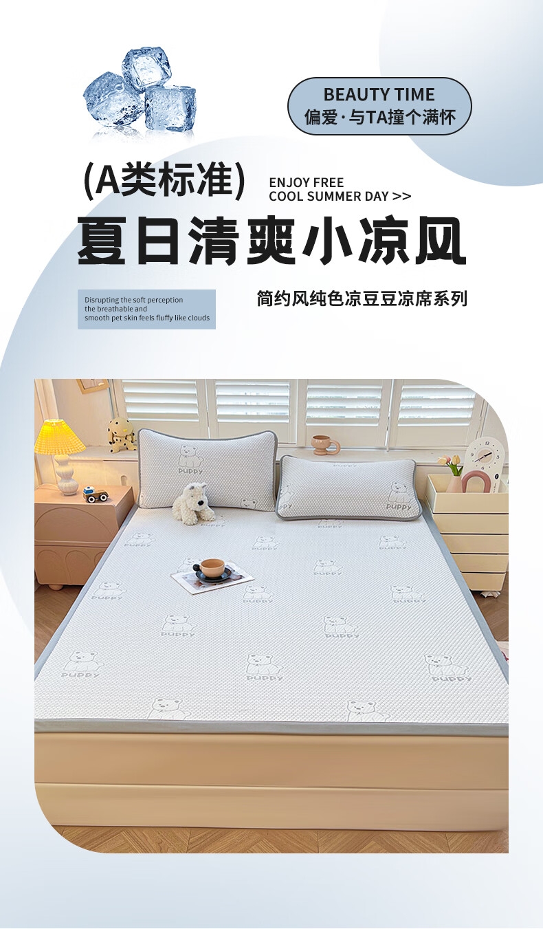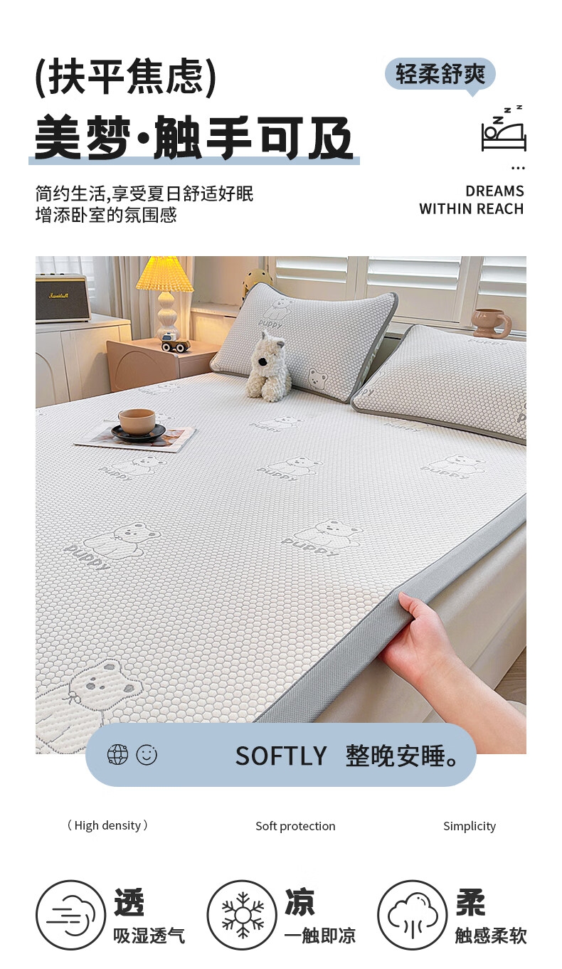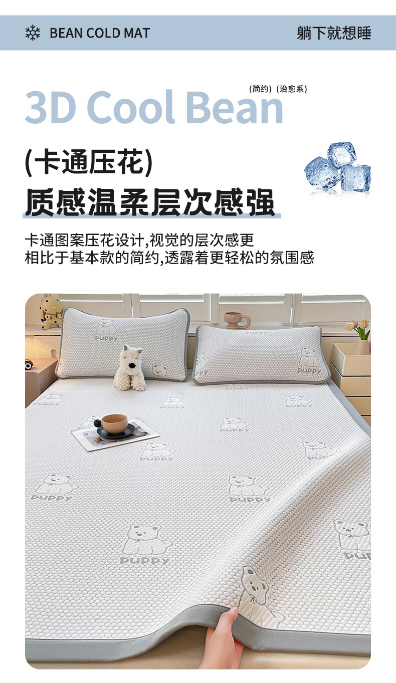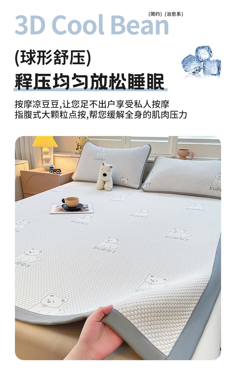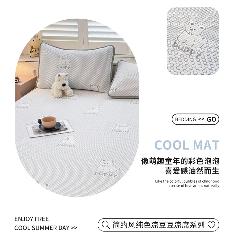 健康活性印染工艺,卡通压花时尚美观;面料顺滑细腻,享受清凉好眠;简约风纯色凉豆豆凉席,透气舒适。不感闷热,