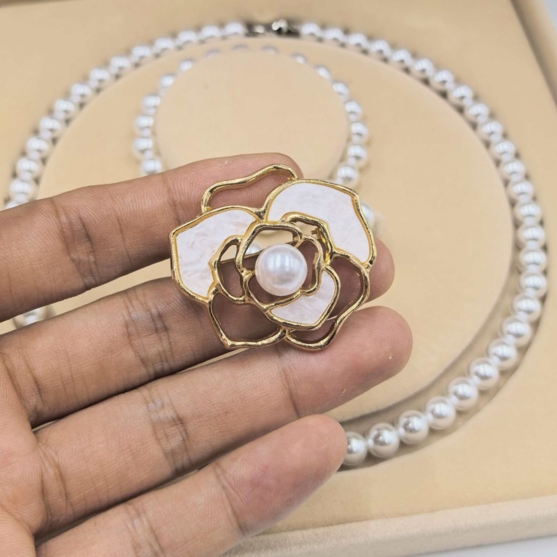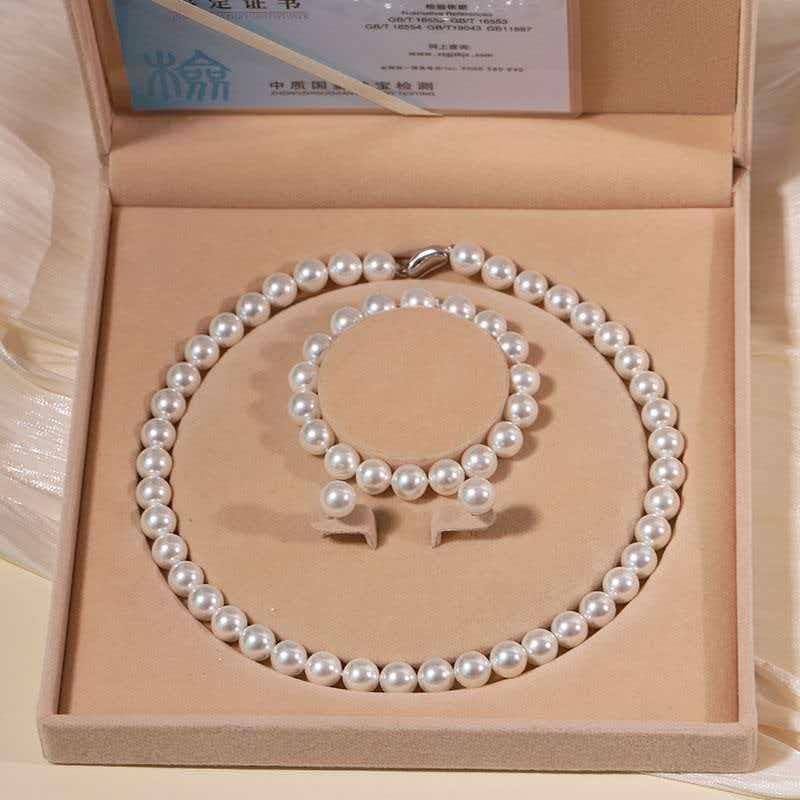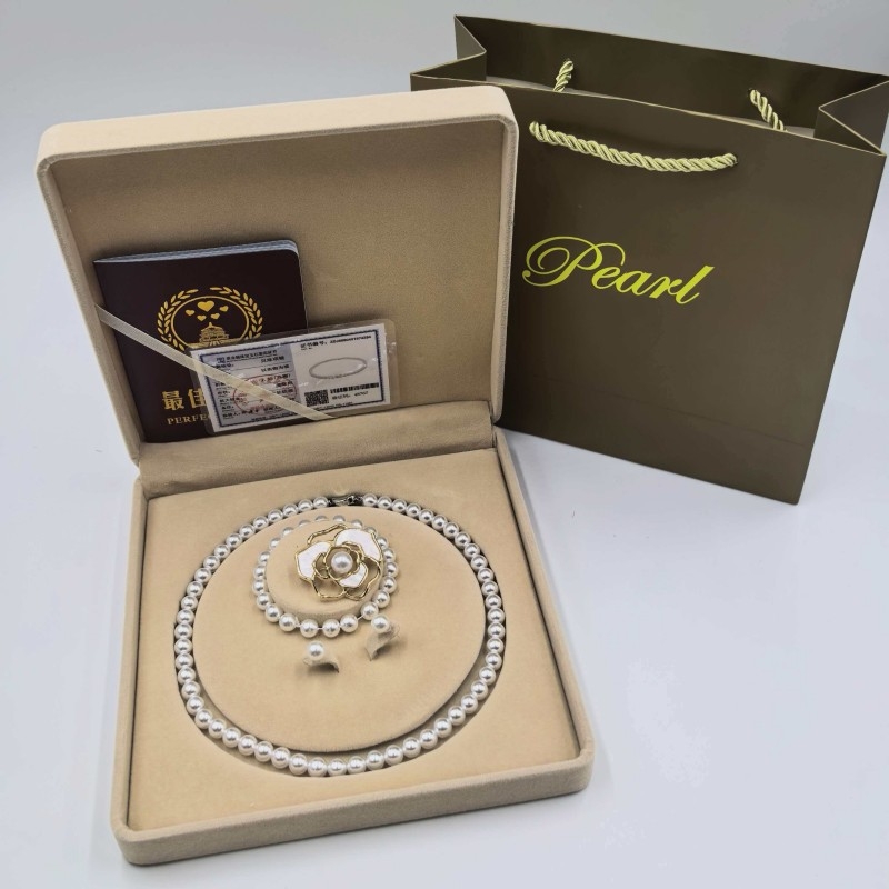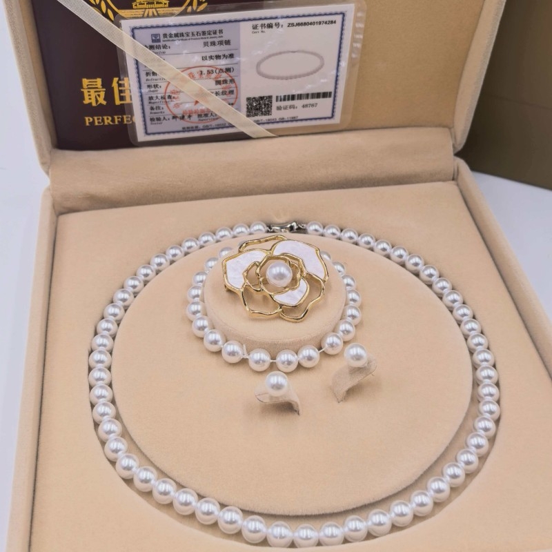项链:精致贝珠,颈间像落了层月光,温润珠光;手串:低调显贵,温柔又大气 日常点缀,瞬间提升穿搭;胸针:山茶花造型+贝珠点缀,别在衣襟/包上都像艺术;耳钉:低调小巧,通勤约会都能戴,悄悄提升精致感;礼盒+证书:丝绒盒+烫金袋,送礼/自留都超有仪式感