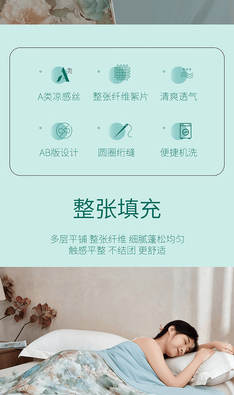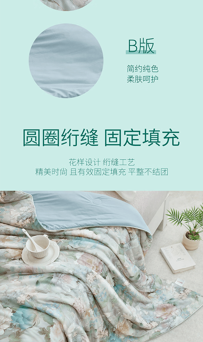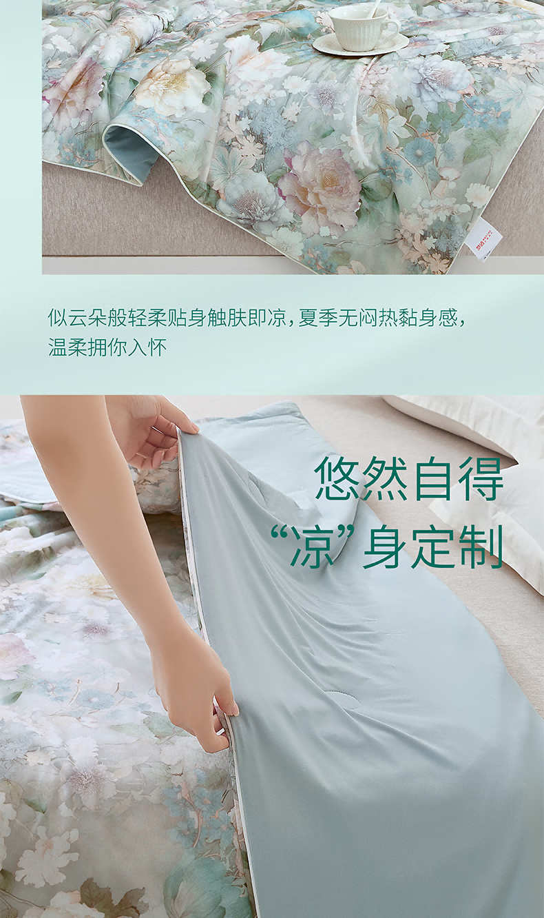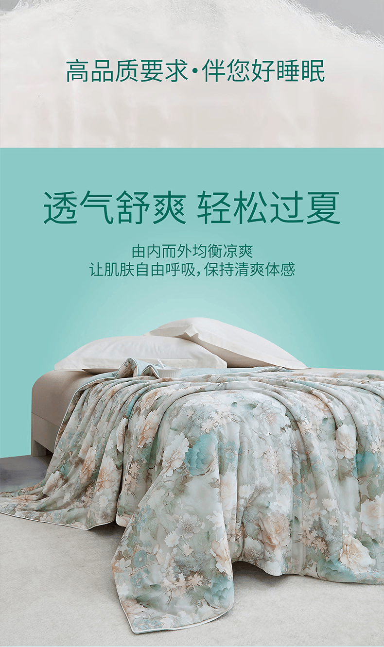以清凉雅致的绿色为底色,缀以简约花纹,优雅高级;柔超薄凉感面料,似云朵般轻柔贴身触肤即凉;蓬松透气的纤维+冰爽凉感的面料,由内而外均衡凉爽;精致筋条,柔软亲肤,贴身安睡,定位绗缝,经久耐用