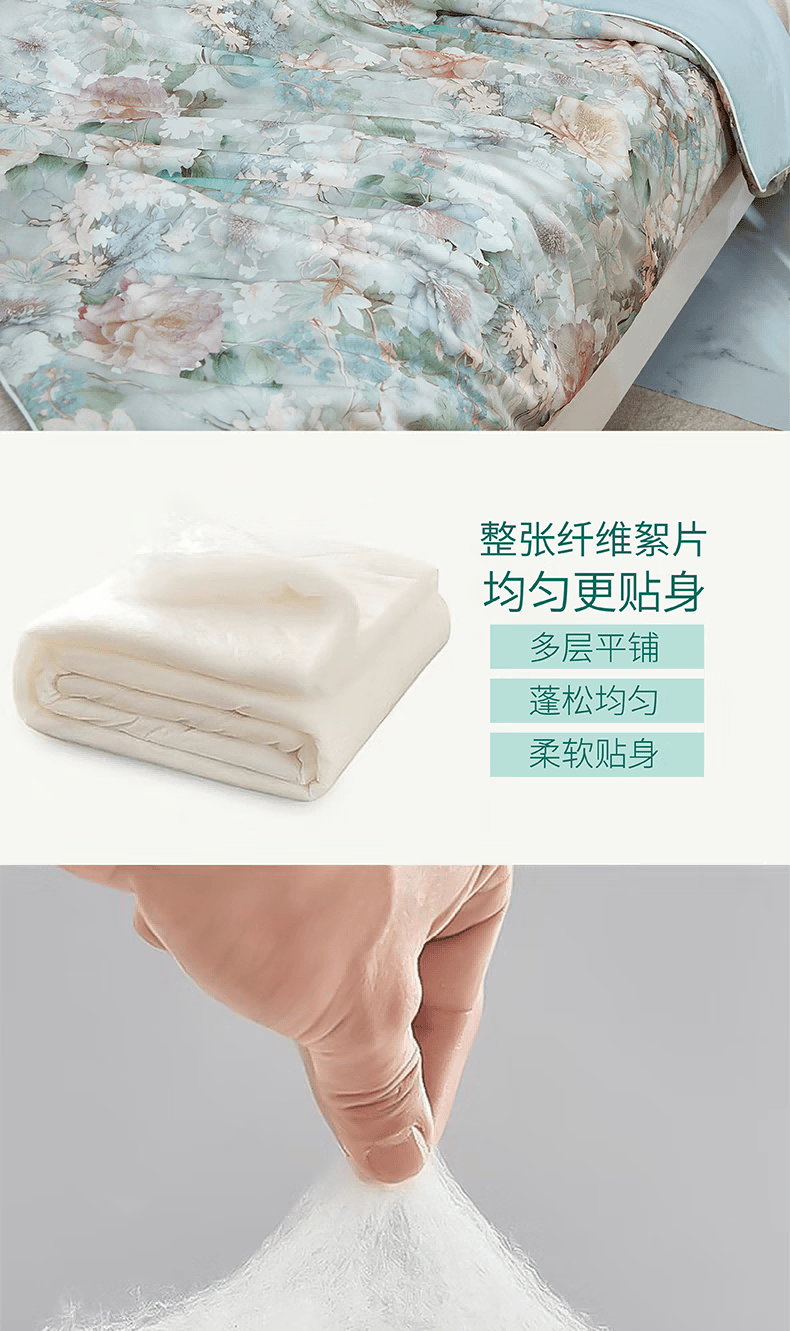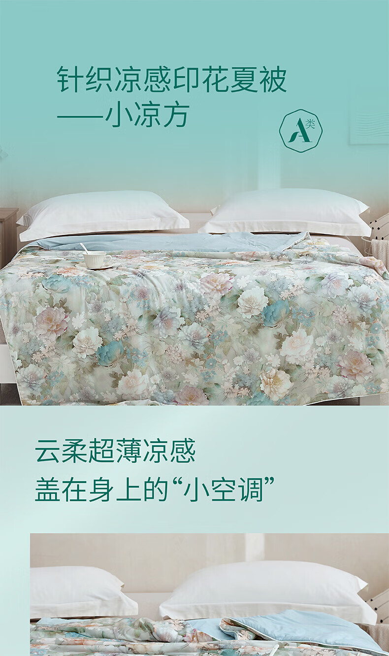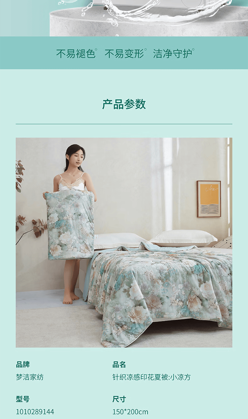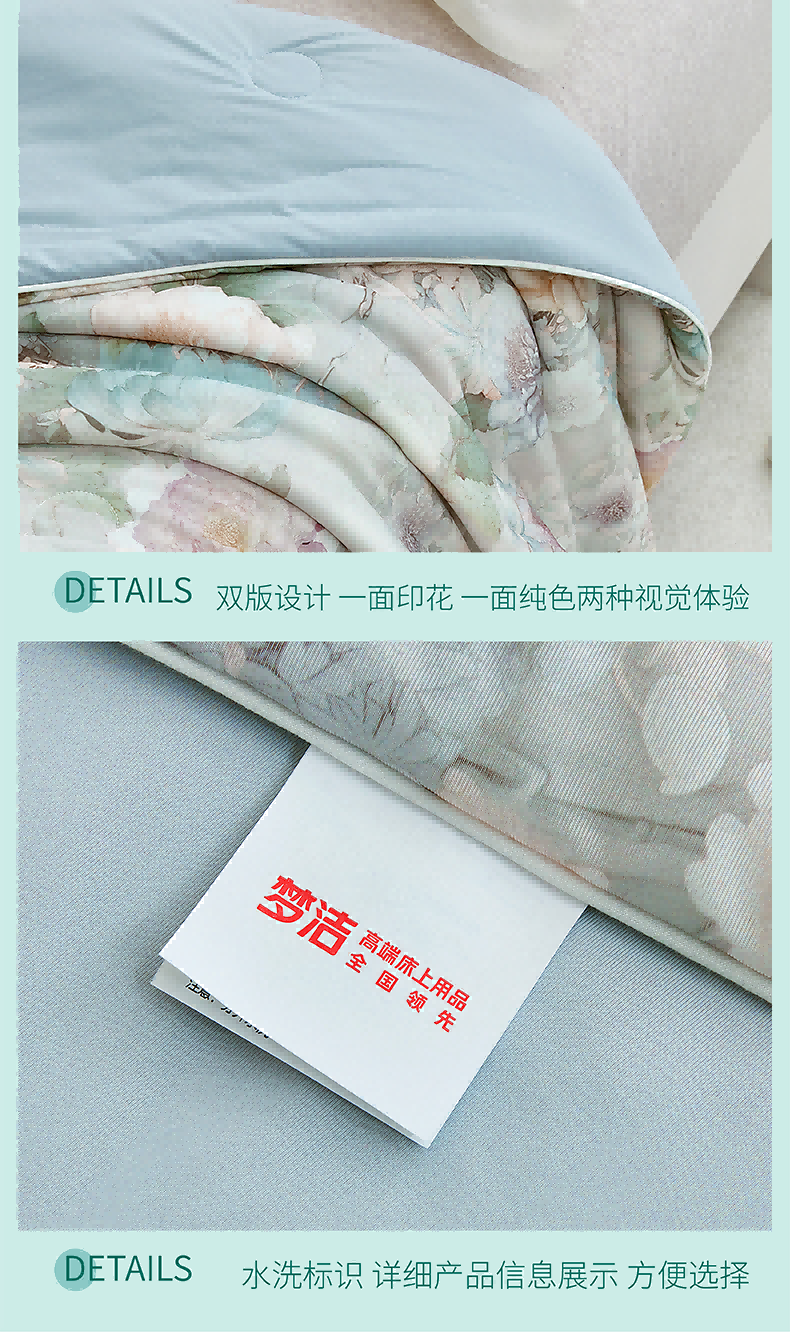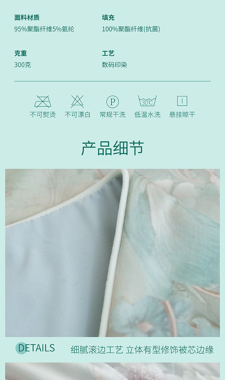 以清凉雅致的绿色为底色,缀以简约花纹,优雅高级;柔超薄凉感面料,似云朵般轻柔贴身触肤即凉;蓬松透气的纤维+冰爽凉感的面料,由内而外均衡凉爽;精致筋条,柔软亲肤,贴身安睡,定位绗缝,经久耐用
