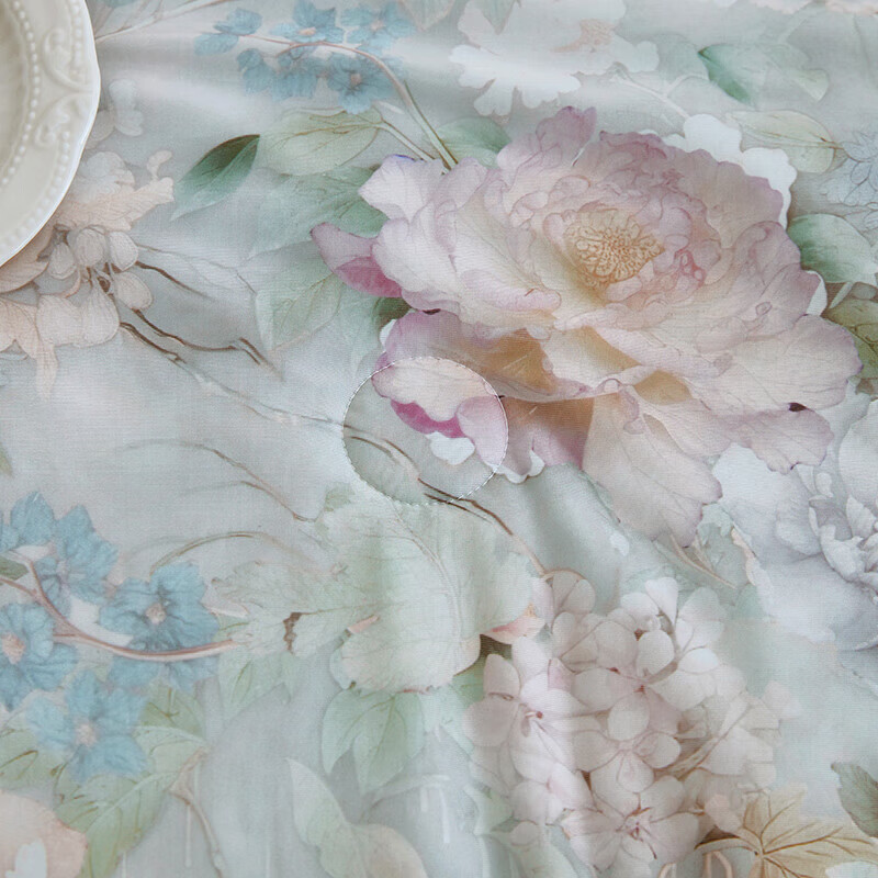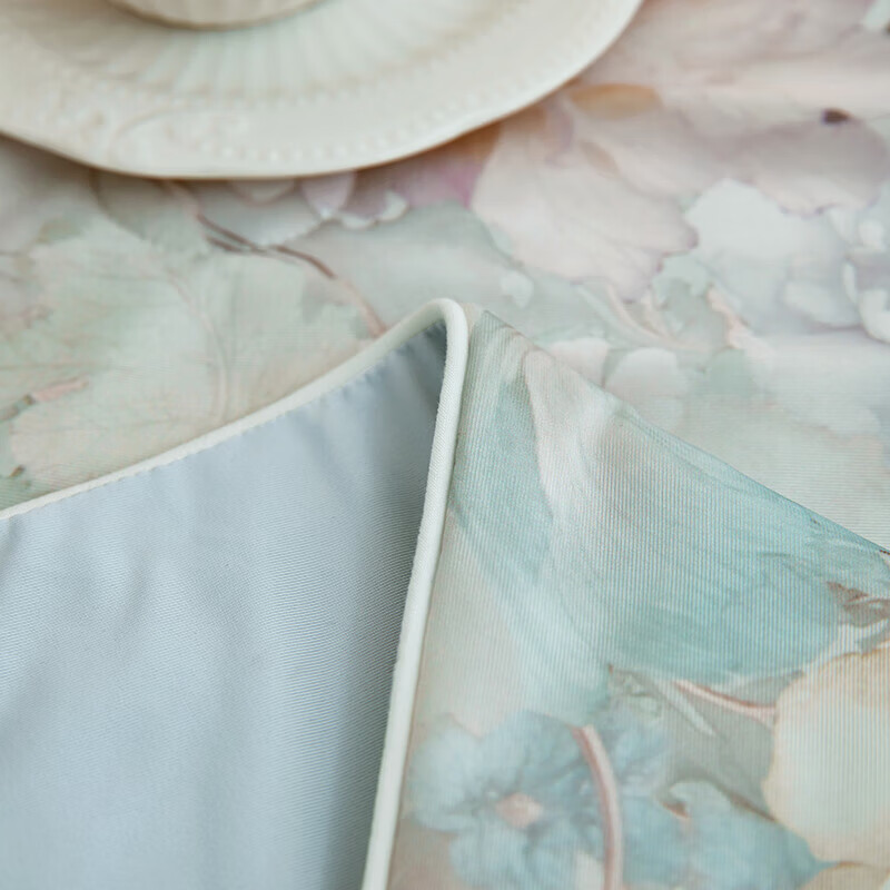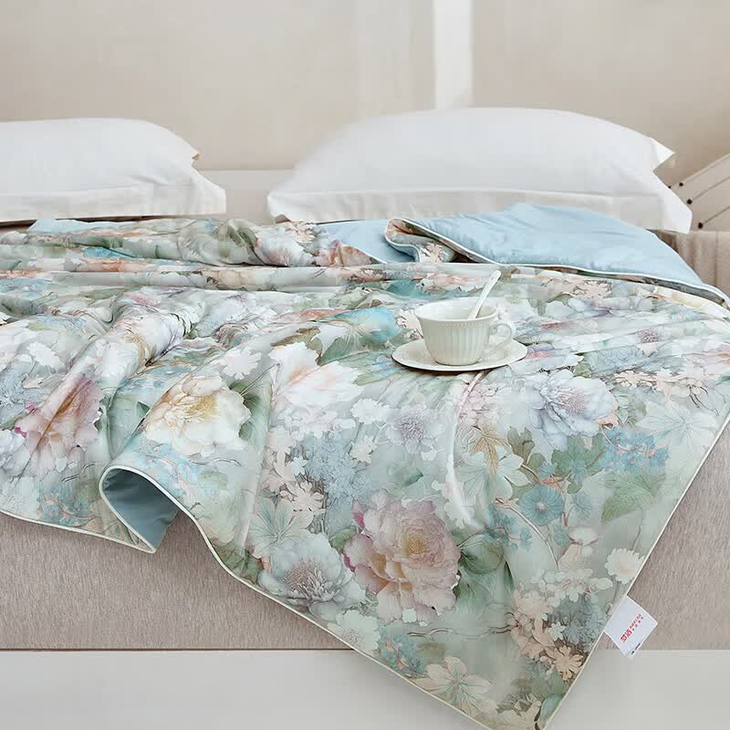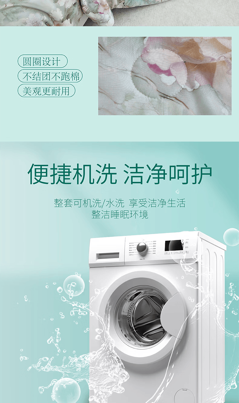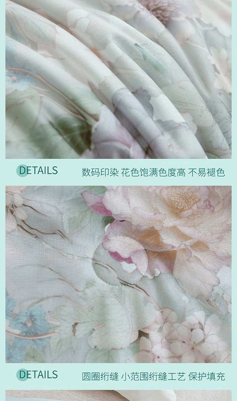 以清凉雅致的绿色为底色,缀以简约花纹,优雅高级;柔超薄凉感面料,似云朵般轻柔贴身触肤即凉;蓬松透气的纤维+冰爽凉感的面料,由内而外均衡凉爽;精致筋条,柔软亲肤,贴身安睡,定位绗缝,经久耐用