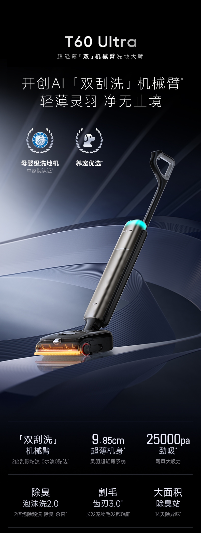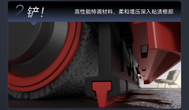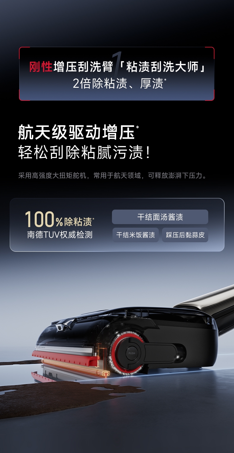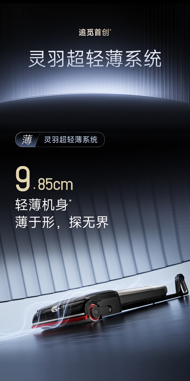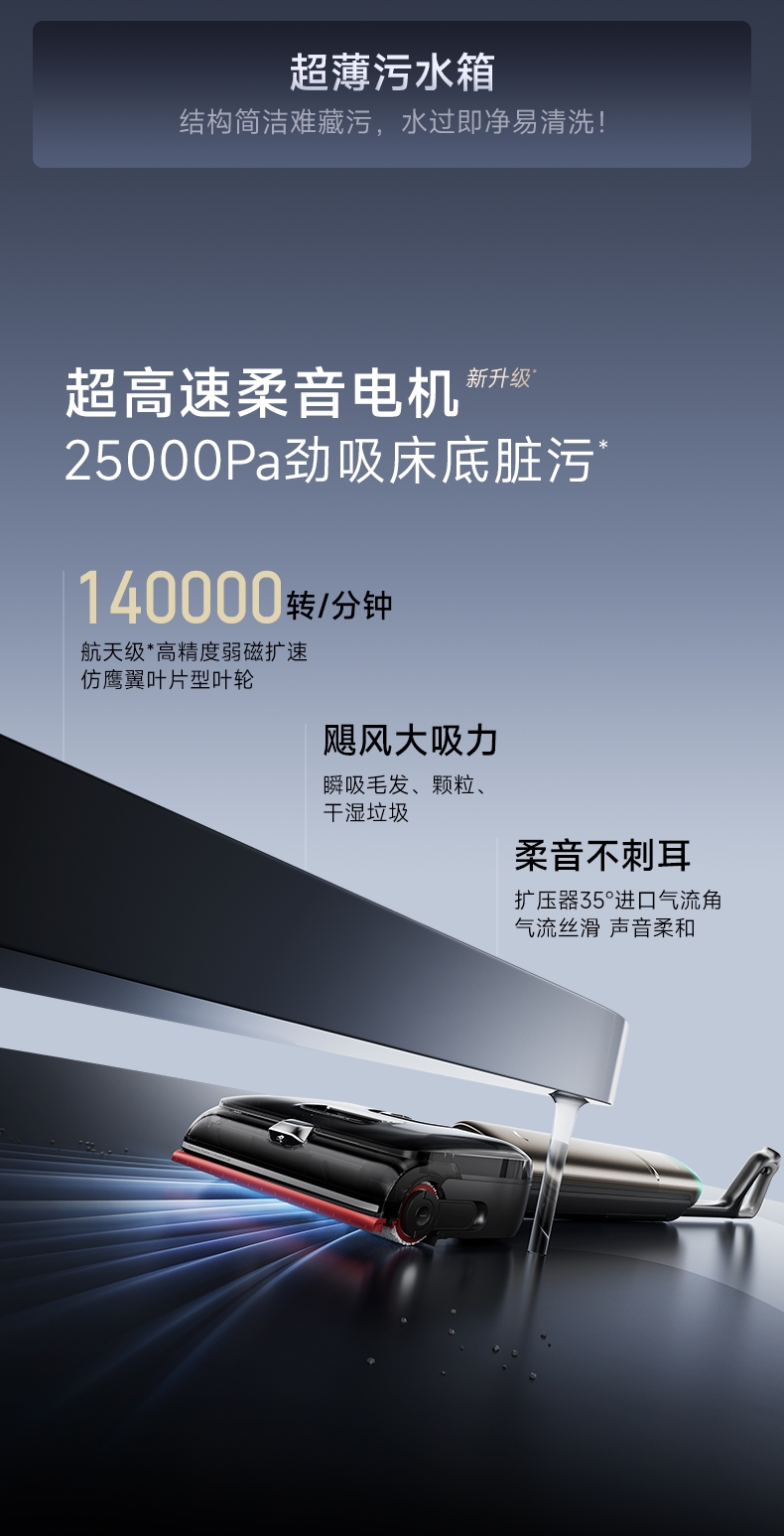 2倍刮除粘渍,0水渍0贴边;9.85cm超薄机身;25000pa飓风大吸力