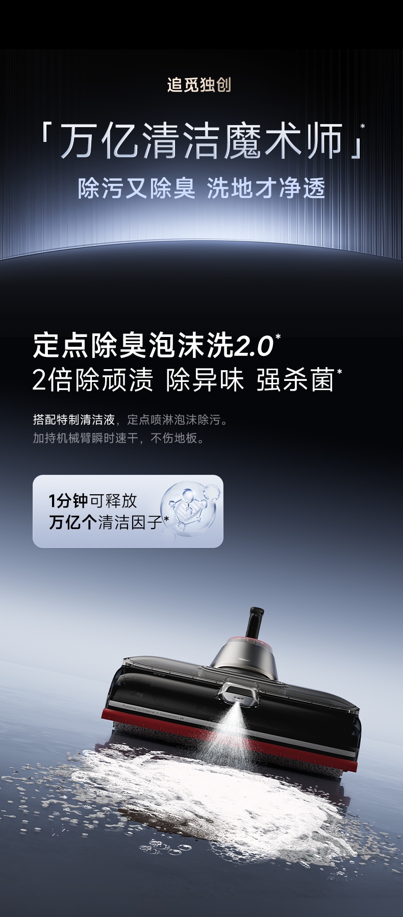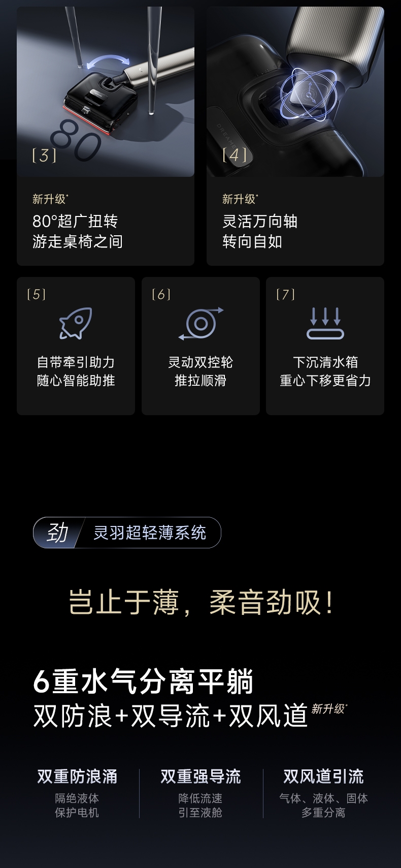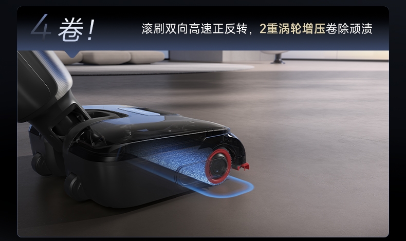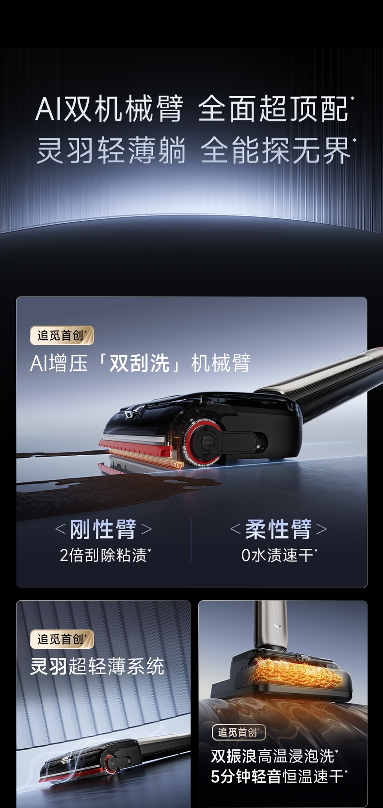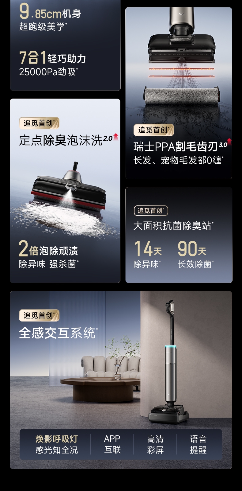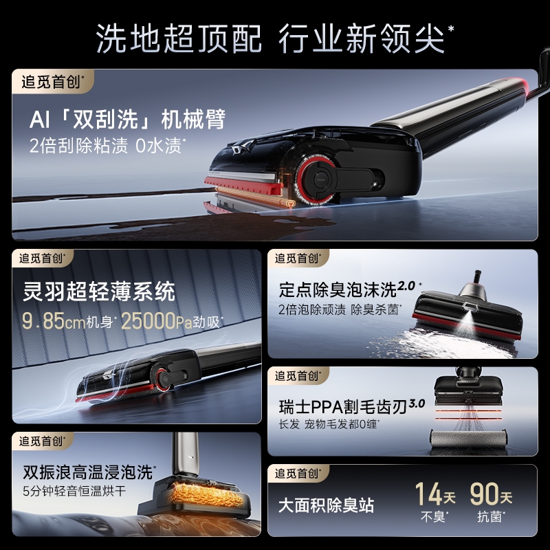 2倍刮除粘渍,0水渍0贴边;9.85cm超薄机身;25000pa飓风大吸力