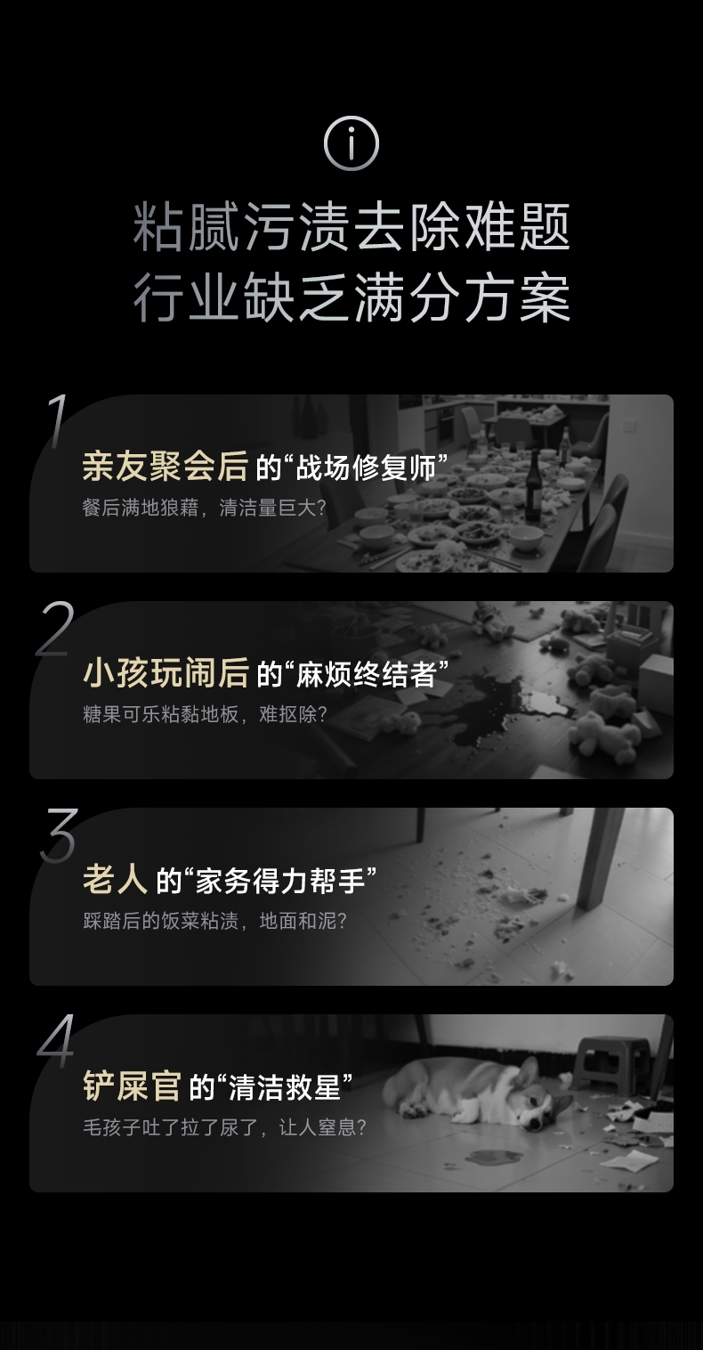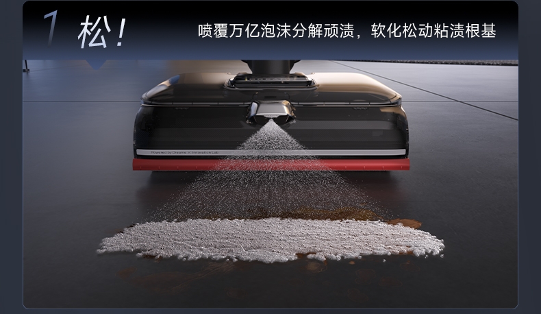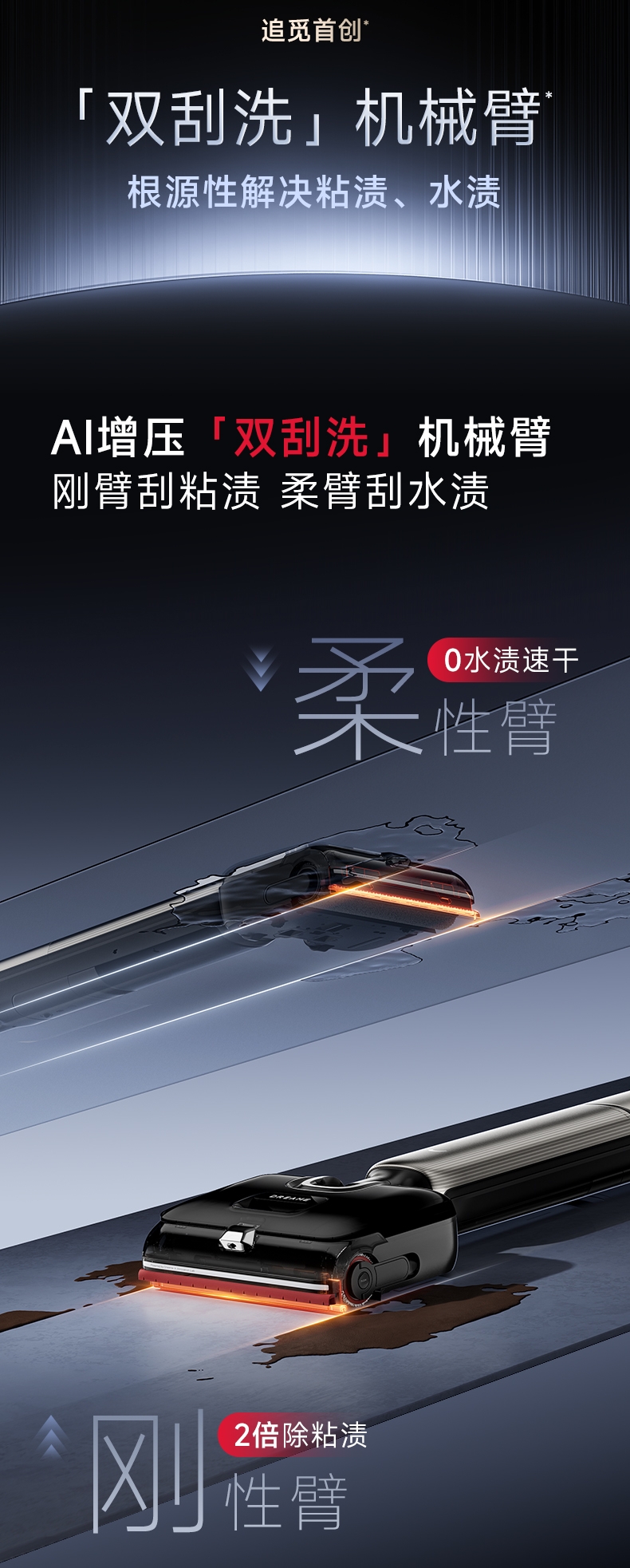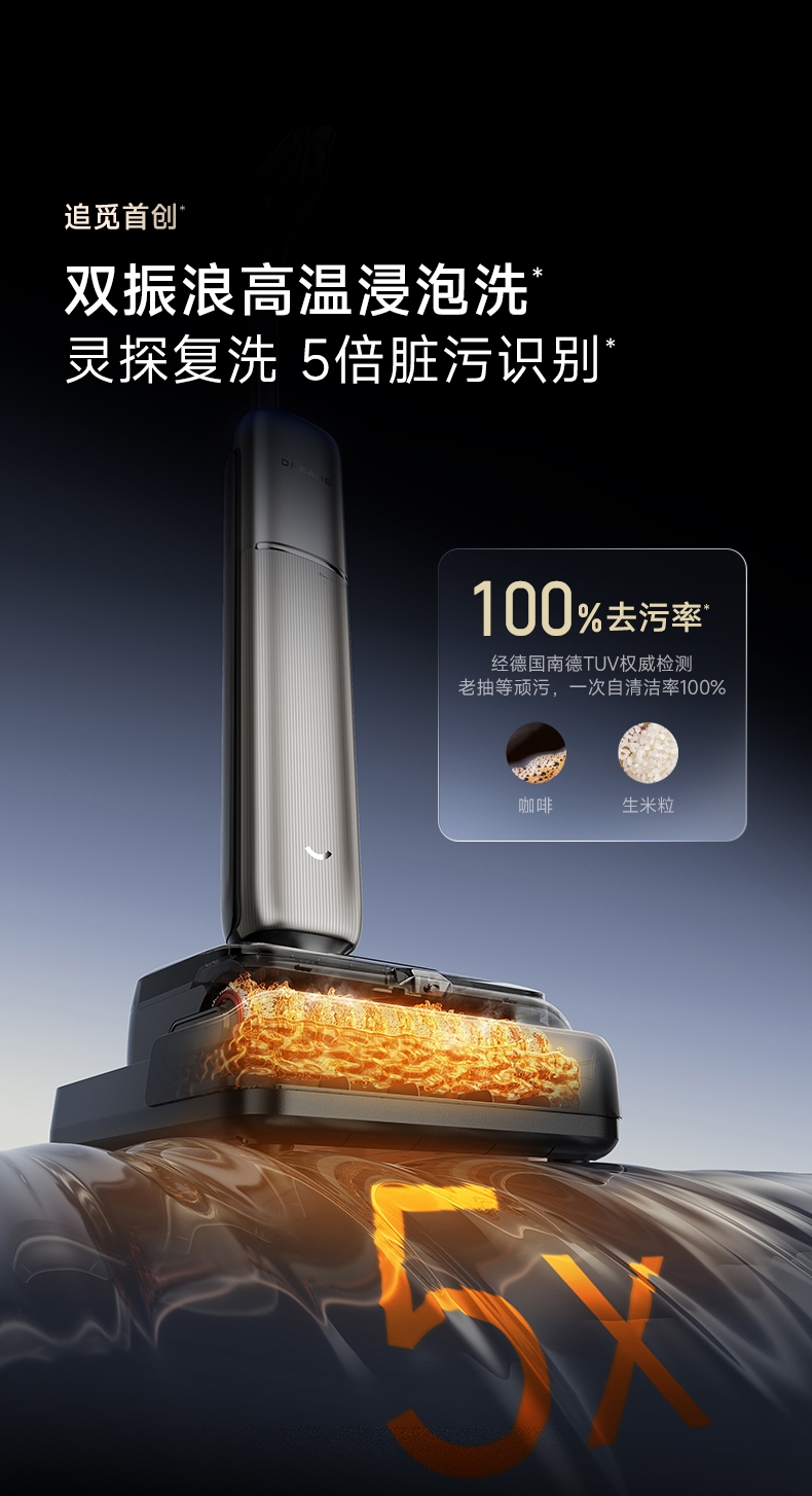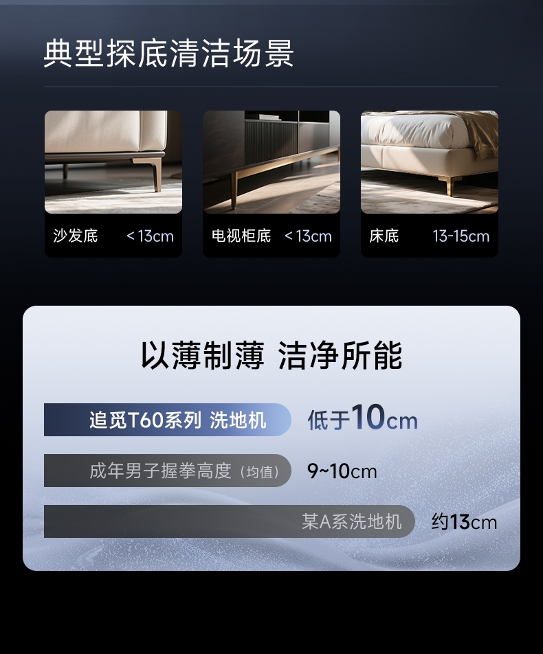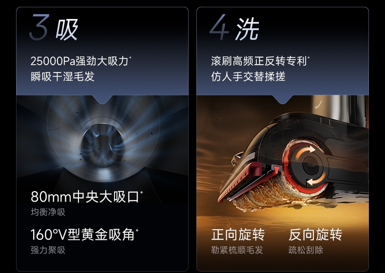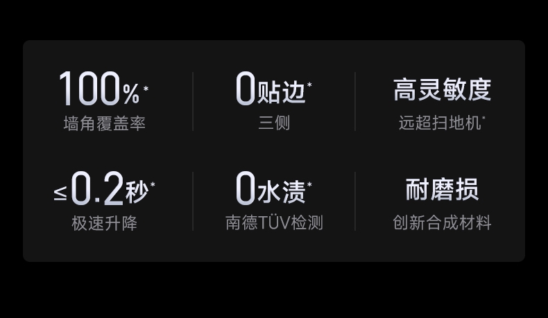 2倍刮除粘渍,0水渍0贴边;9.85cm超薄机身;25000pa飓风大吸力