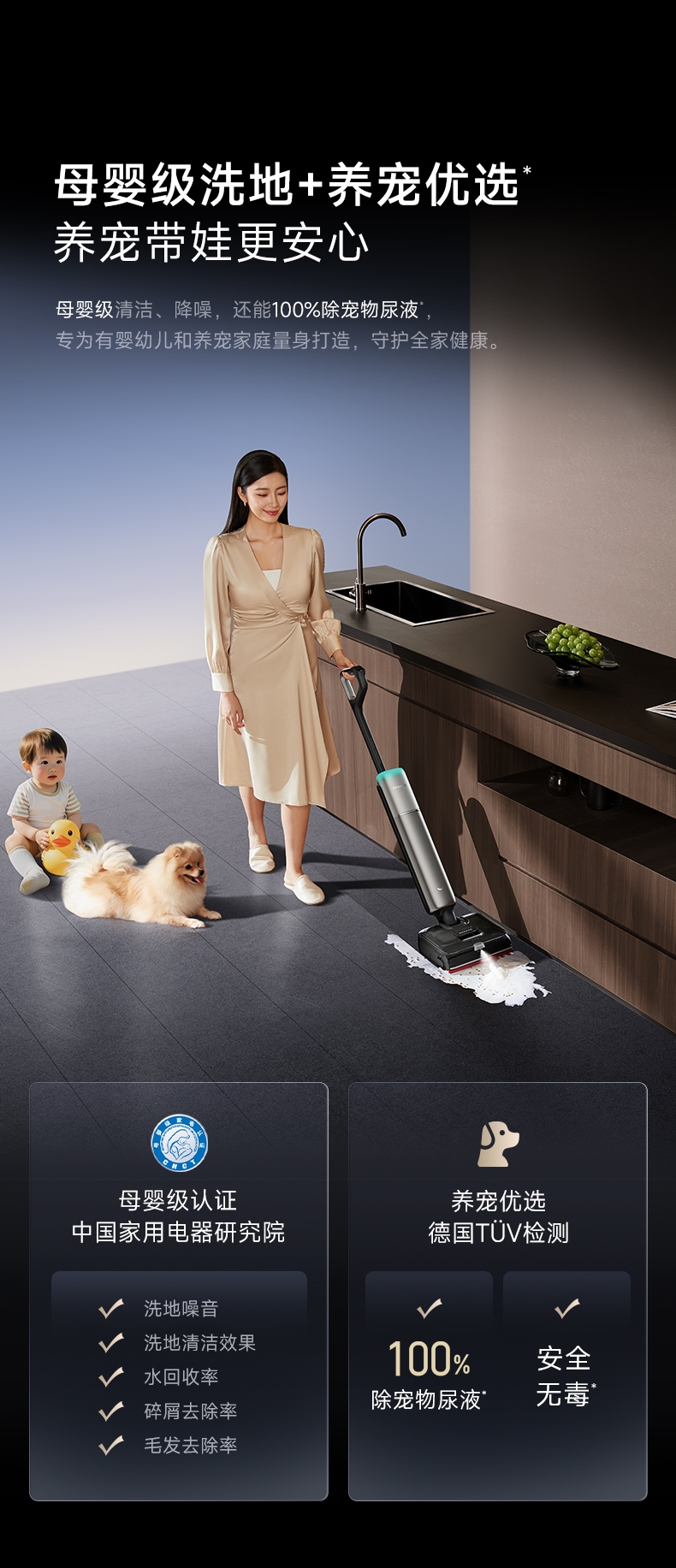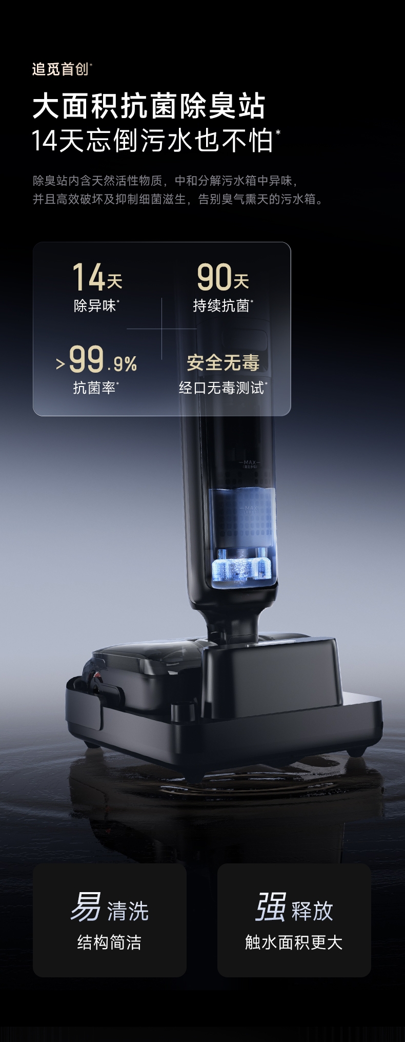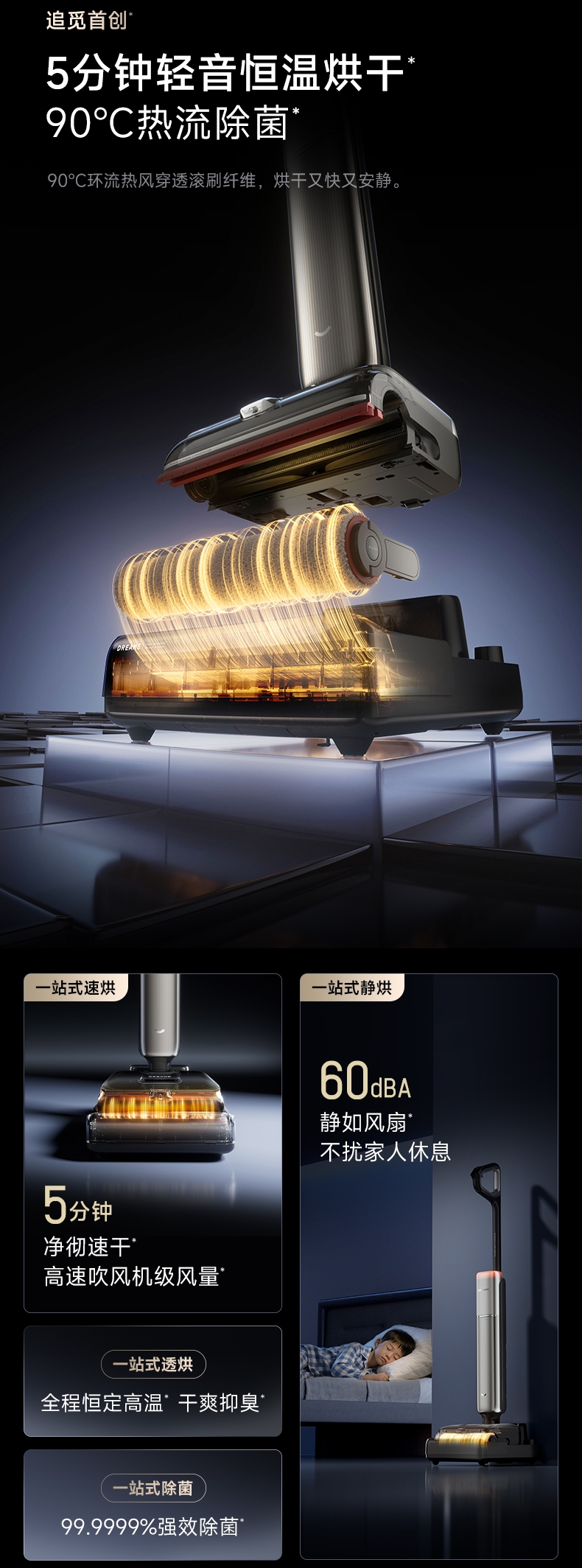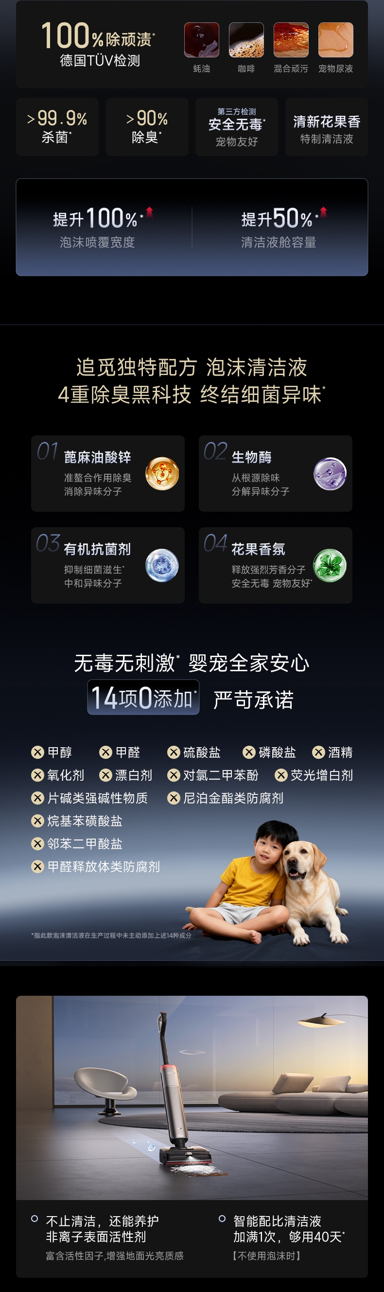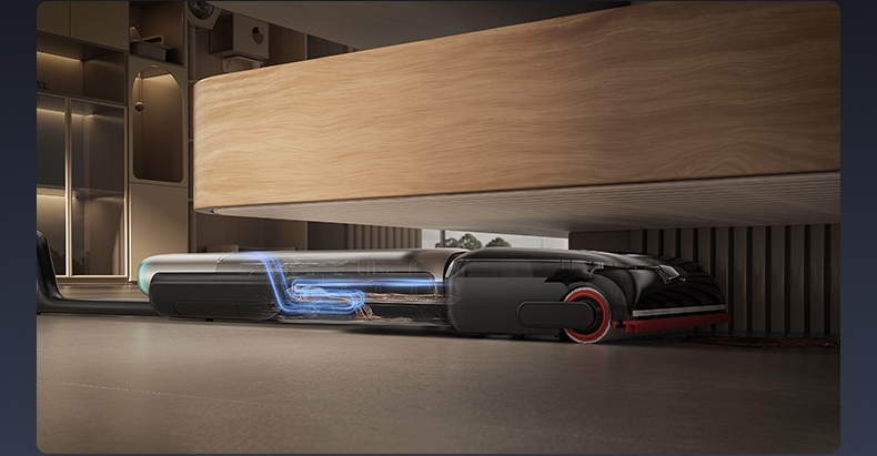 2倍刮除粘渍,0水渍0贴边;9.85cm超薄机身;25000pa飓风大吸力