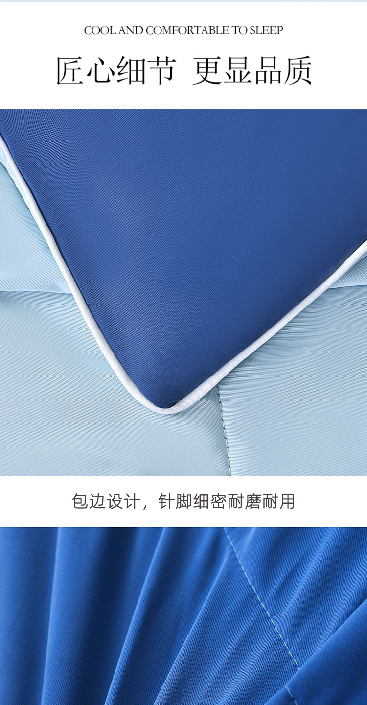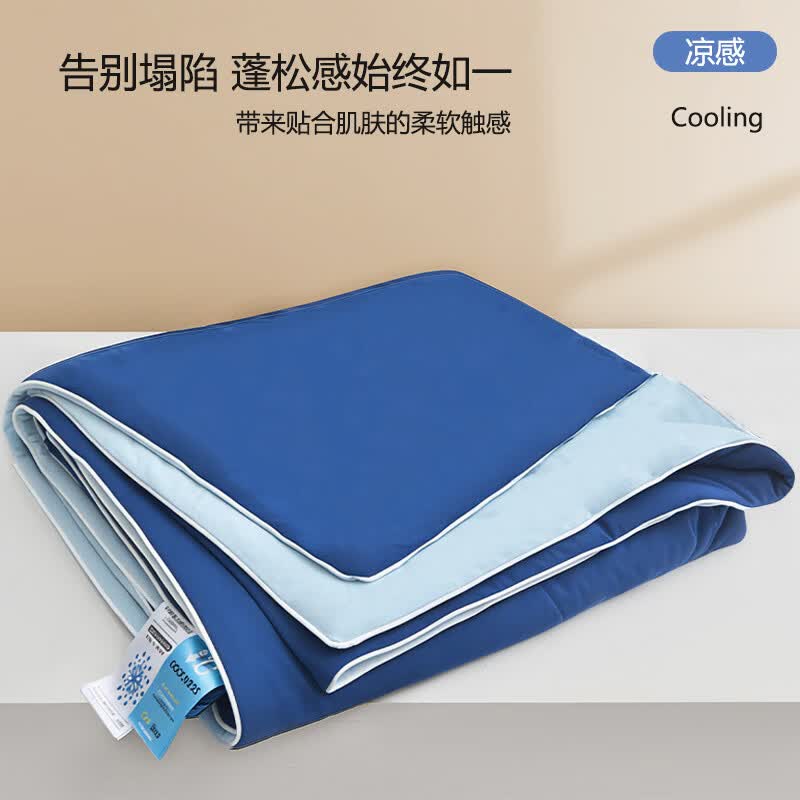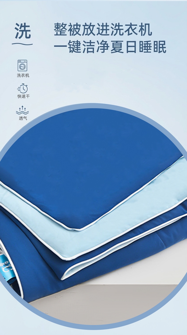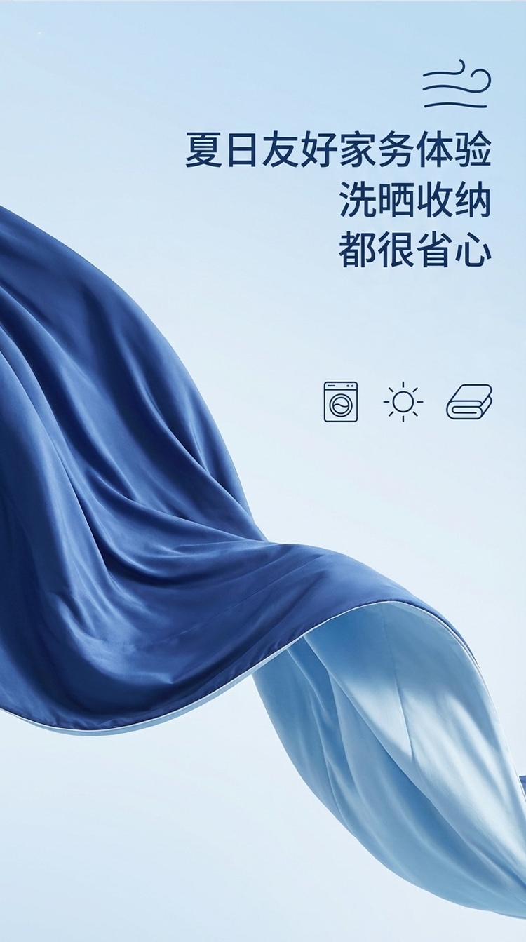 A 面深雾蓝与 B 面浅雾蓝均搭载冰感纤维科技;填充高蓬松透气纤维,轻盈如云朵;可机洗不变形,洗后依旧蓬松柔软,冰感持久在线