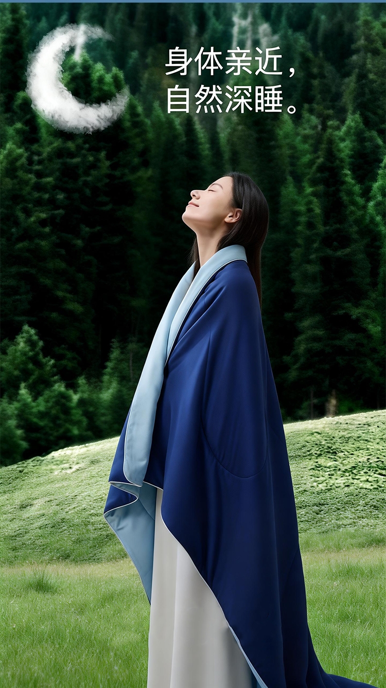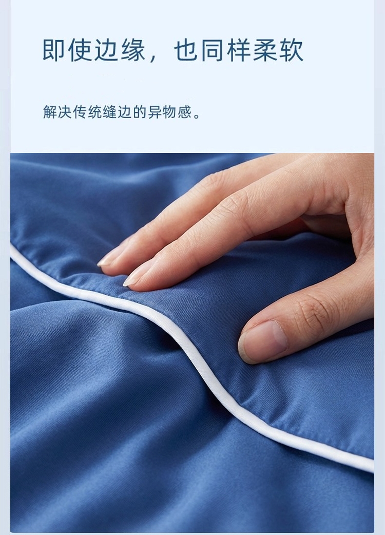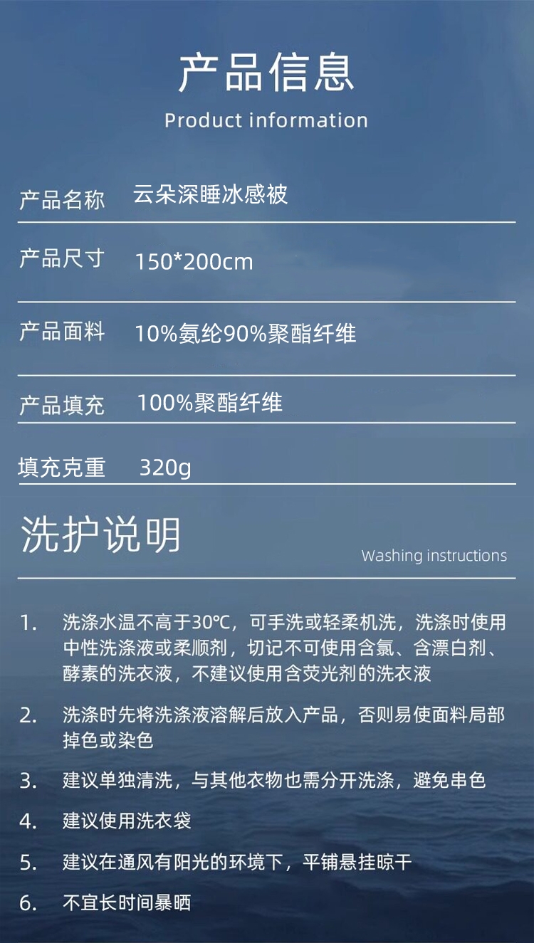 A 面深雾蓝与 B 面浅雾蓝均搭载冰感纤维科技;填充高蓬松透气纤维,轻盈如云朵;可机洗不变形,洗后依旧蓬松柔软,冰感持久在线