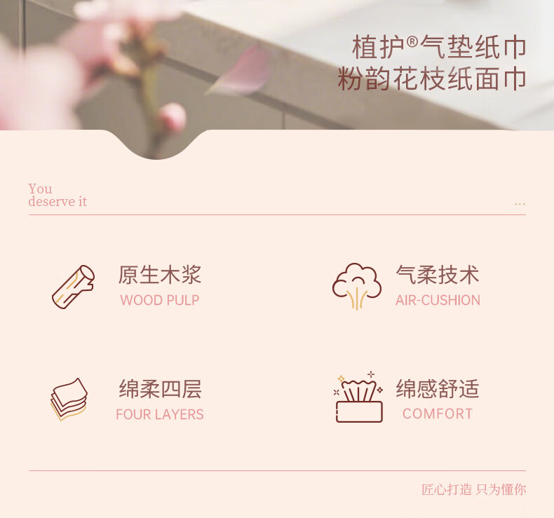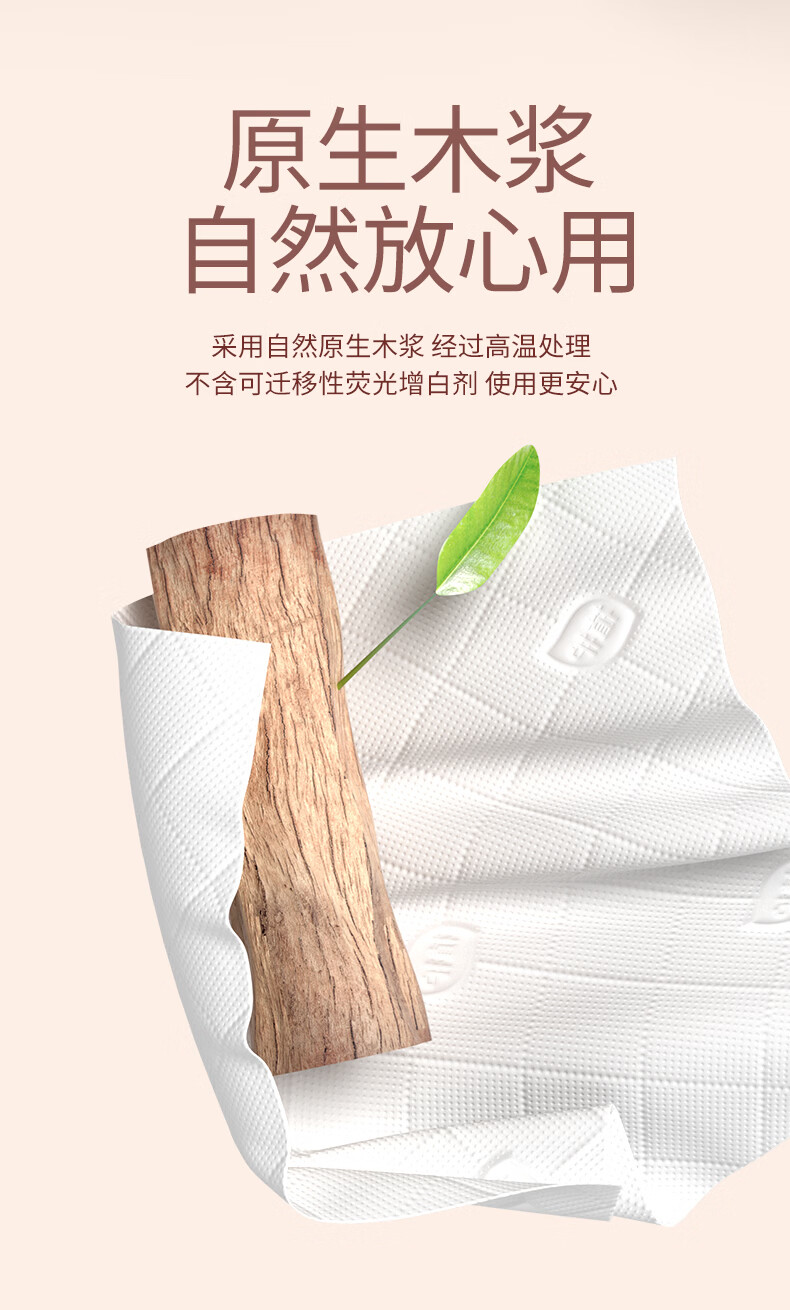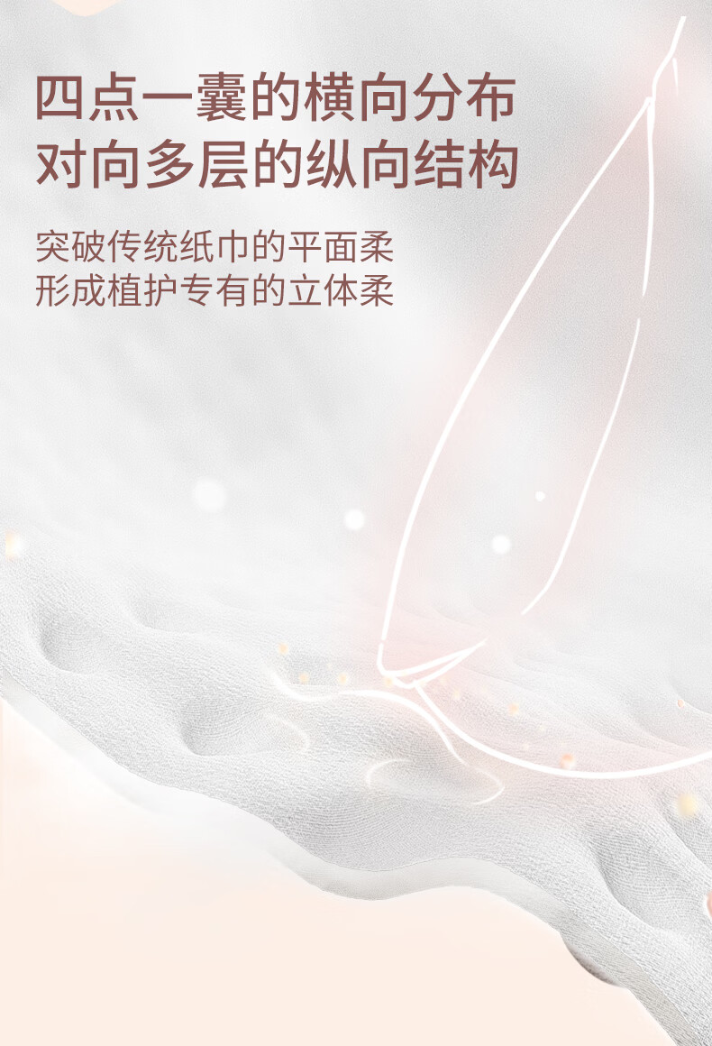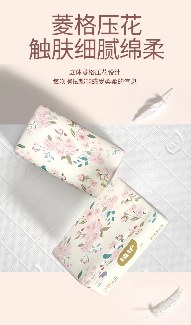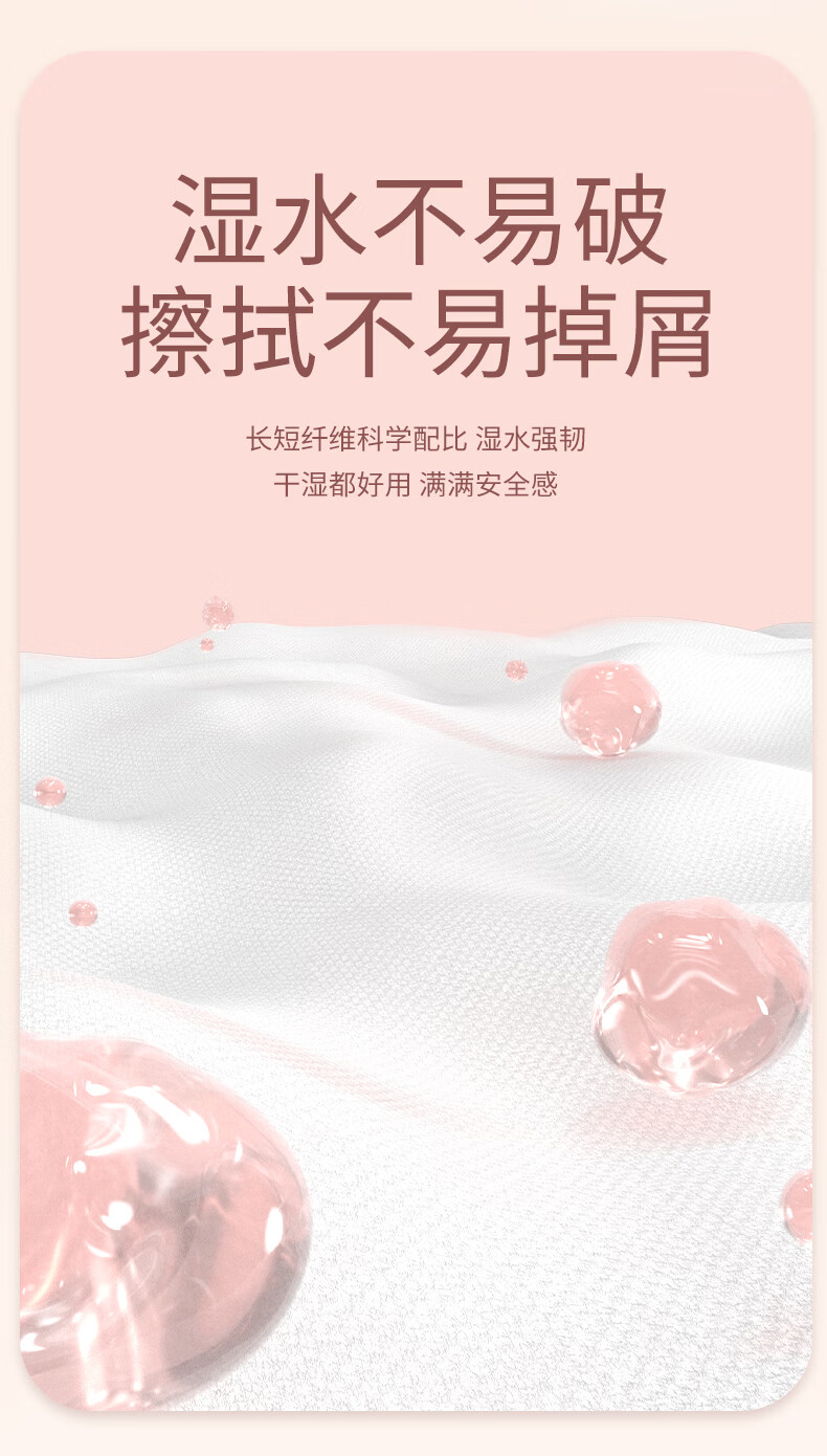 原生木浆 进口品质;轻盈压花 臻享品质;柔软触感 ,遇水柔韧 擦拭无屑