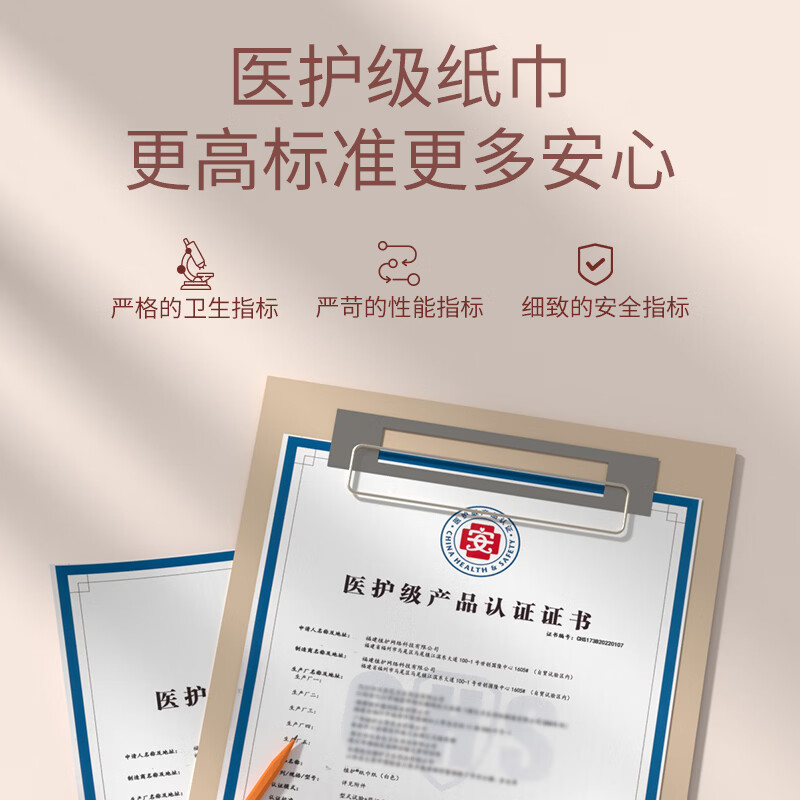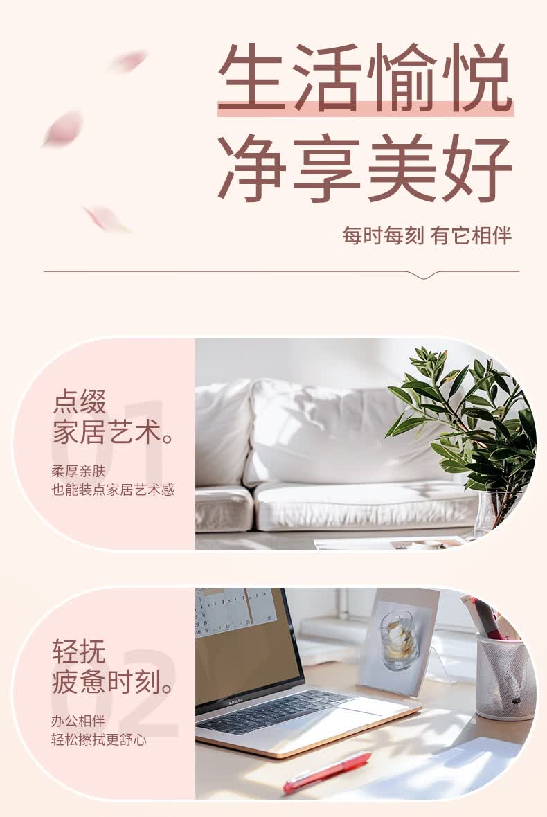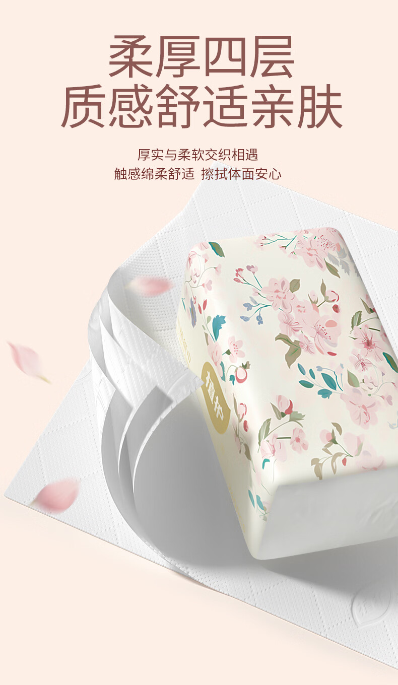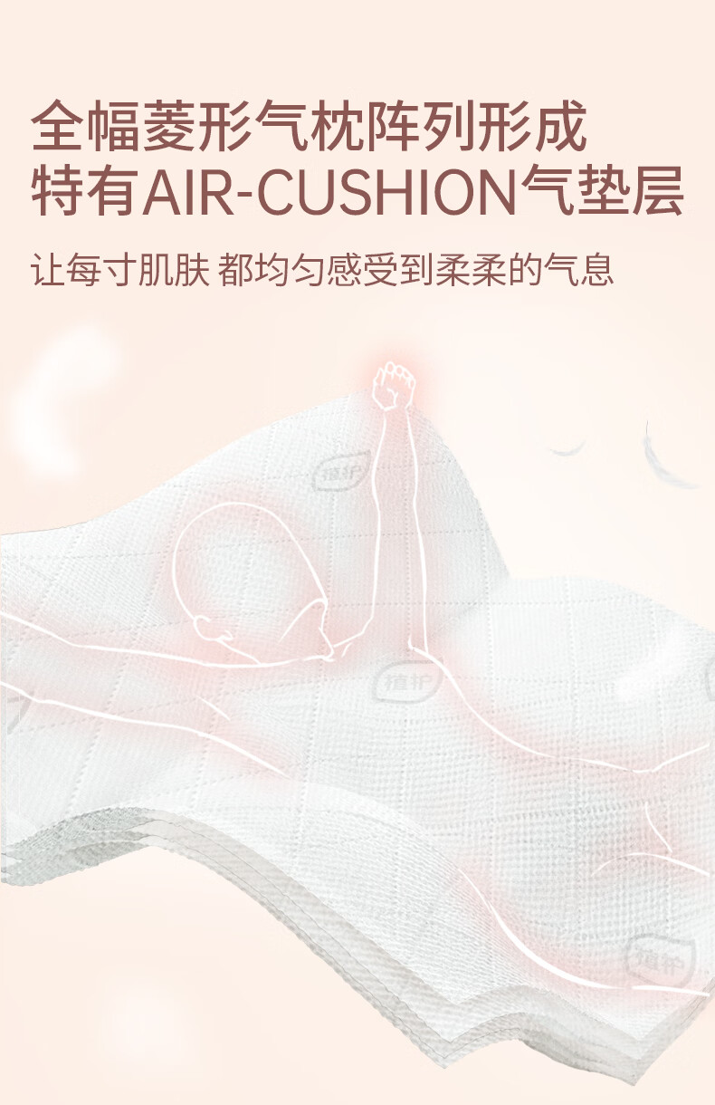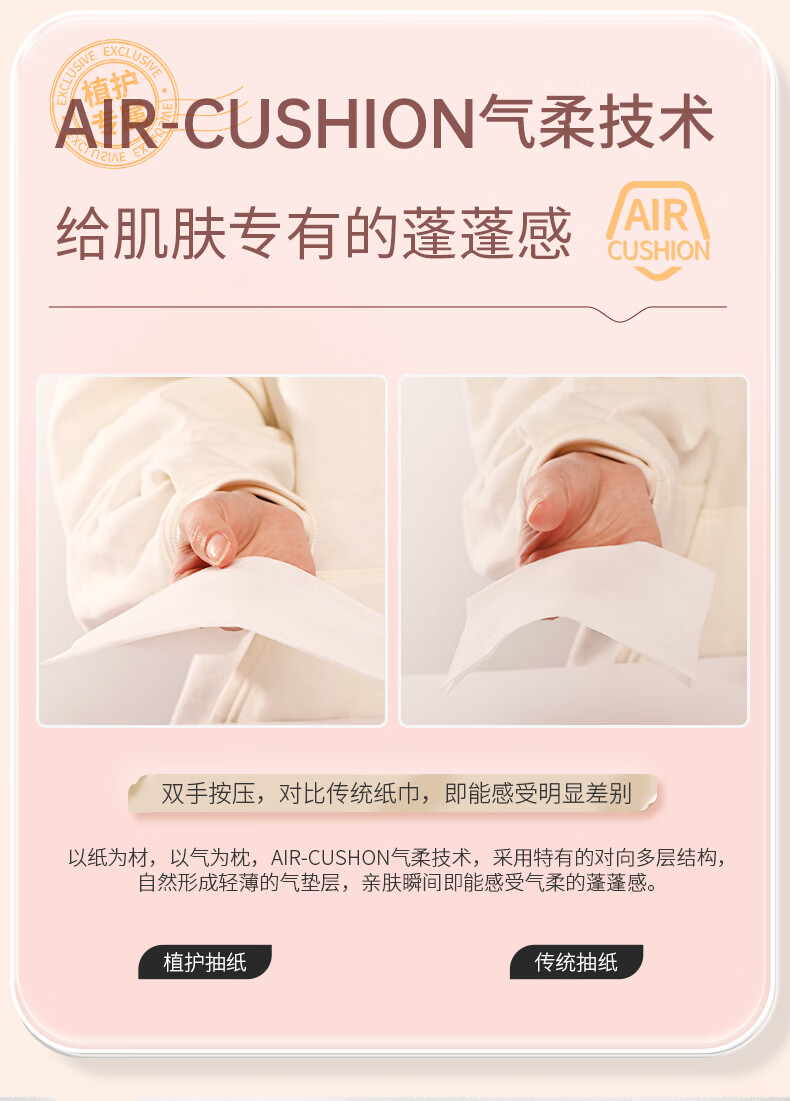 原生木浆 进口品质;轻盈压花 臻享品质;柔软触感 ,遇水柔韧 擦拭无屑