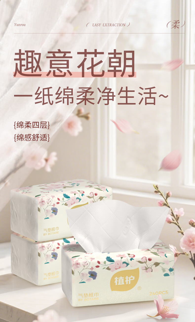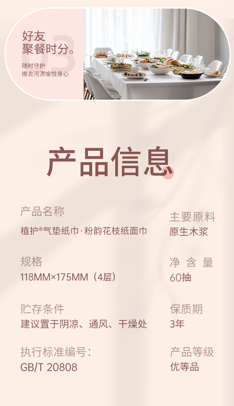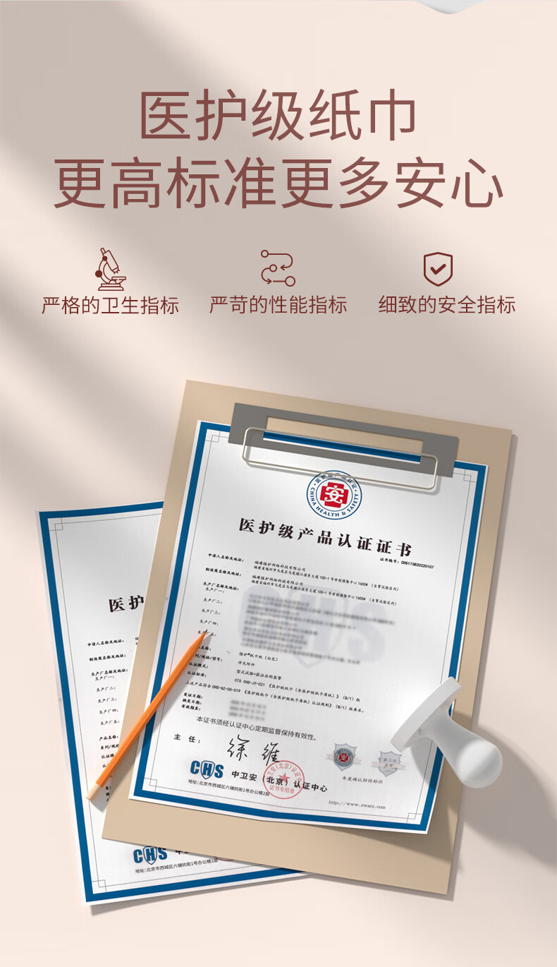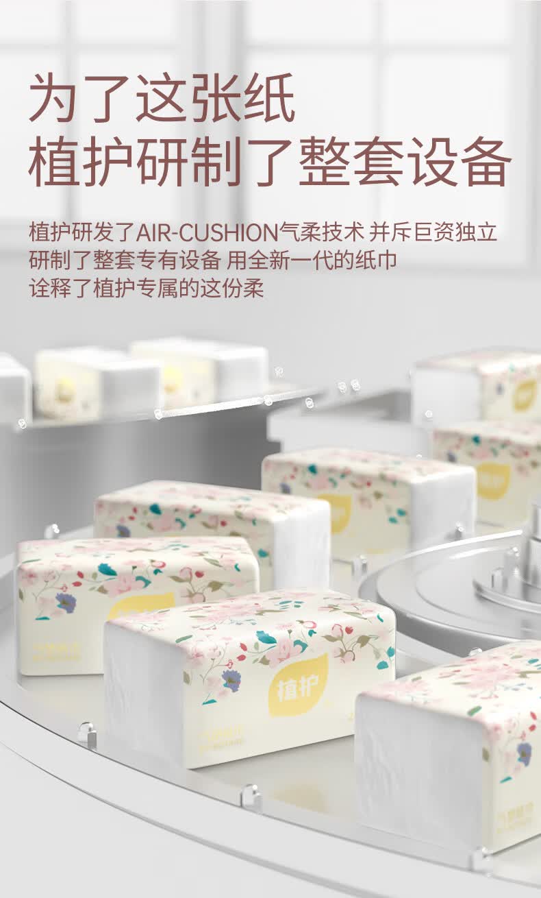 原生木浆 进口品质;轻盈压花 臻享品质;柔软触感 ,遇水柔韧 擦拭无屑