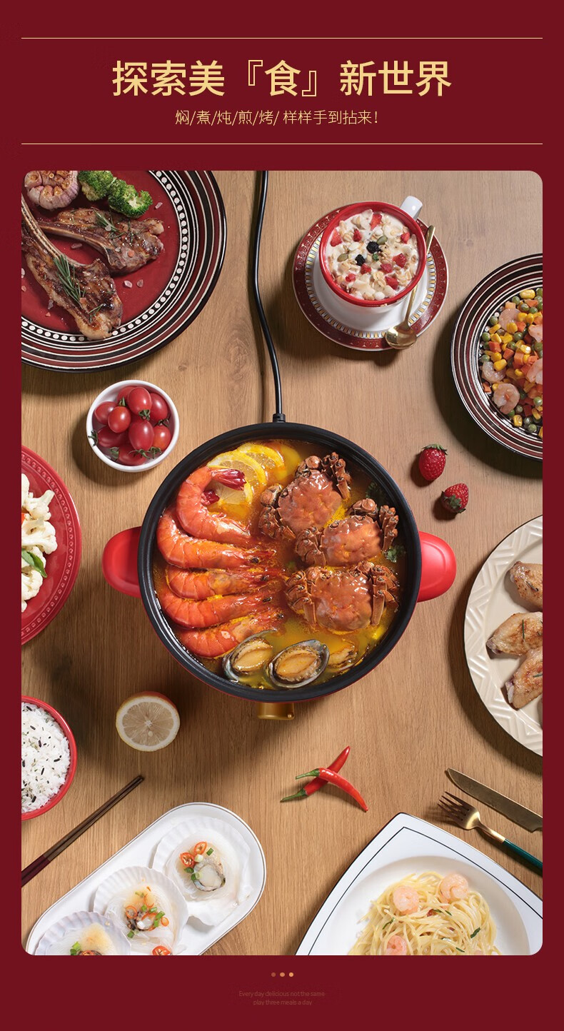 多功能电煮锅 料理锅;断电保护 大口径 加深锅体;涮锅 炖菜 煮食 焖饭 煲汤