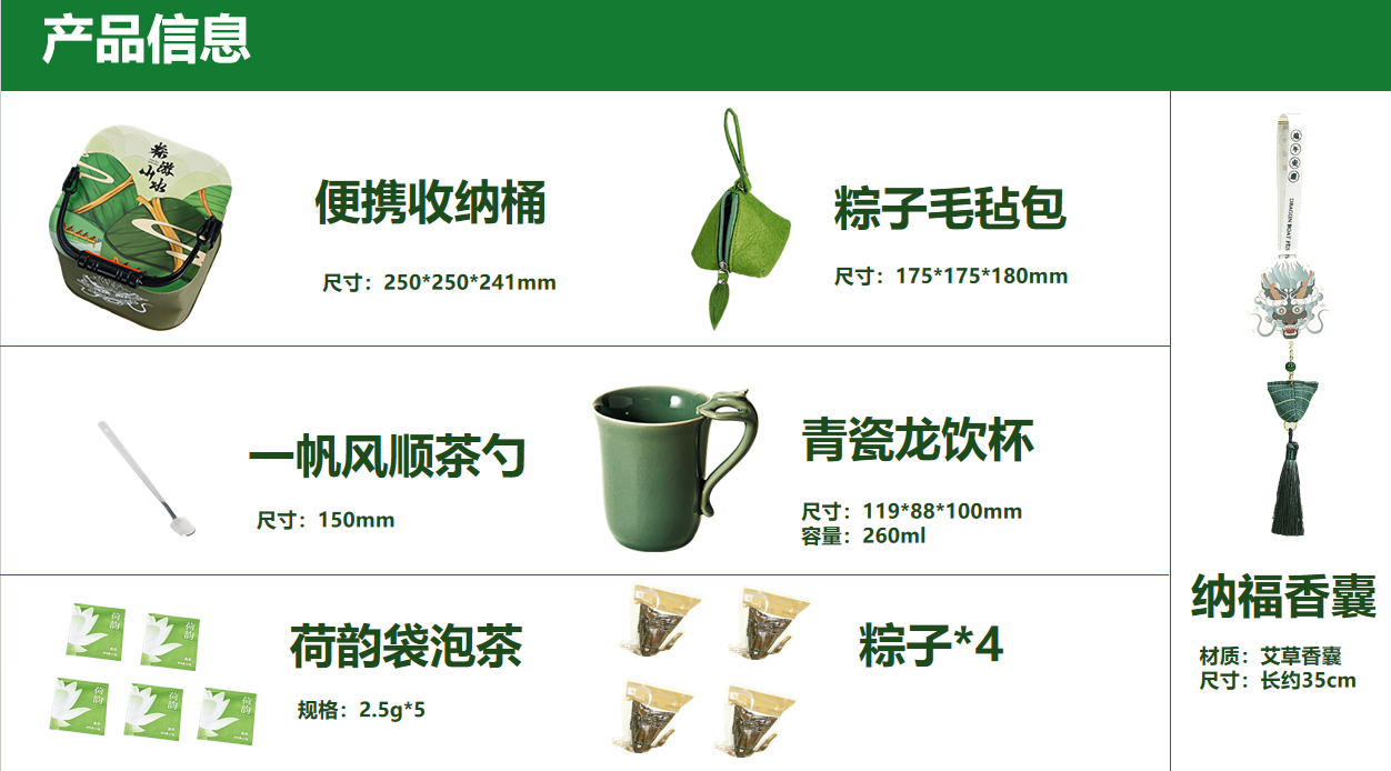 配置:便携收纳桶*1、粽子毛毡包*1、青瓷龙饮杯*1、 一帆风顺茶勺*1、荷韵袋泡茶*5、 纳福香囊*1、真真老老品牌粽 *2
