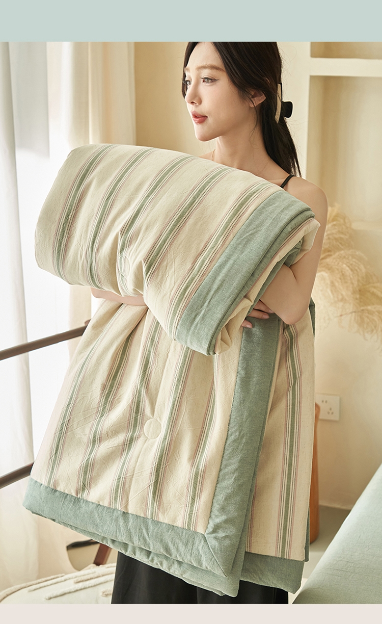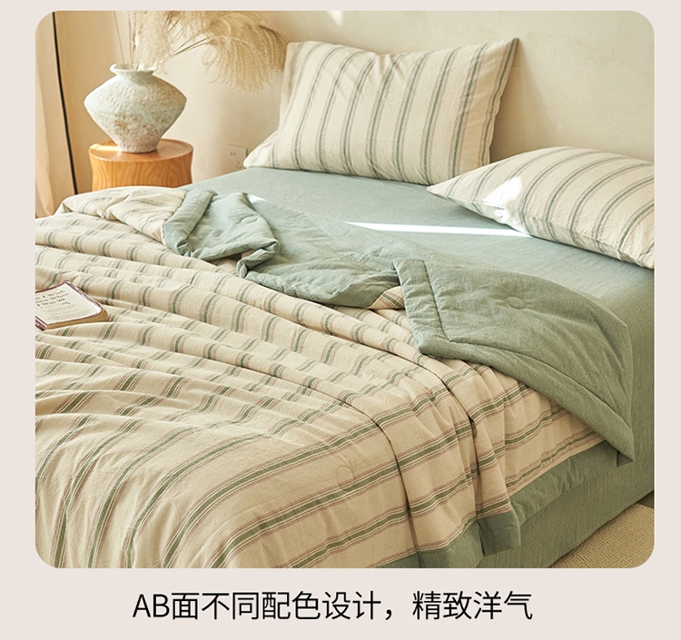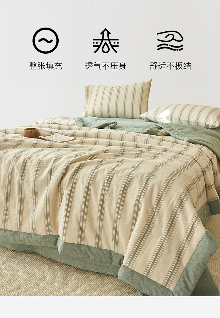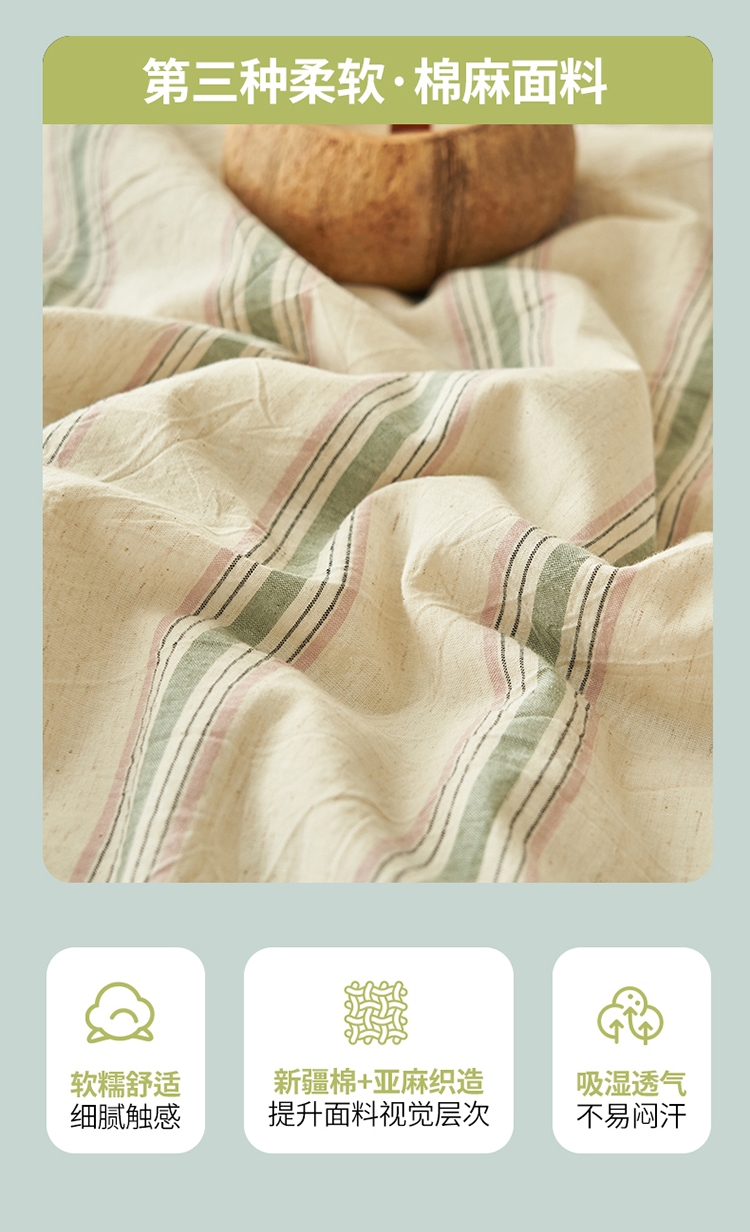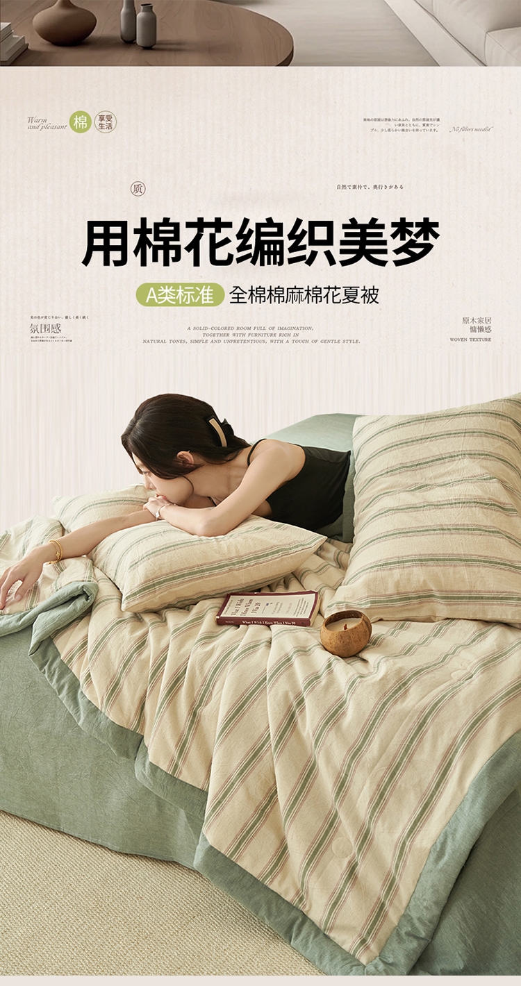 棉麻混纺面料,透气干爽不闷汗,天然亲肤更安心;纯棉花填充,蓬松柔软,轻盈不压身,凉而不冰;吸湿排汗,四季可用,易打理,夏日睡眠好搭档