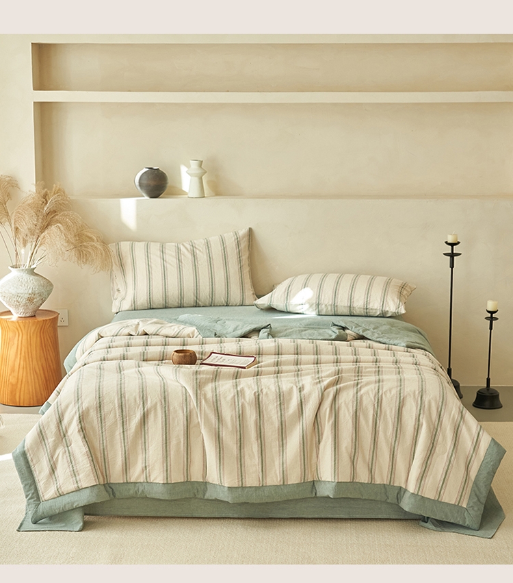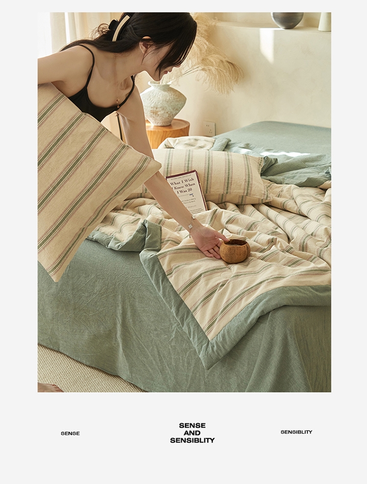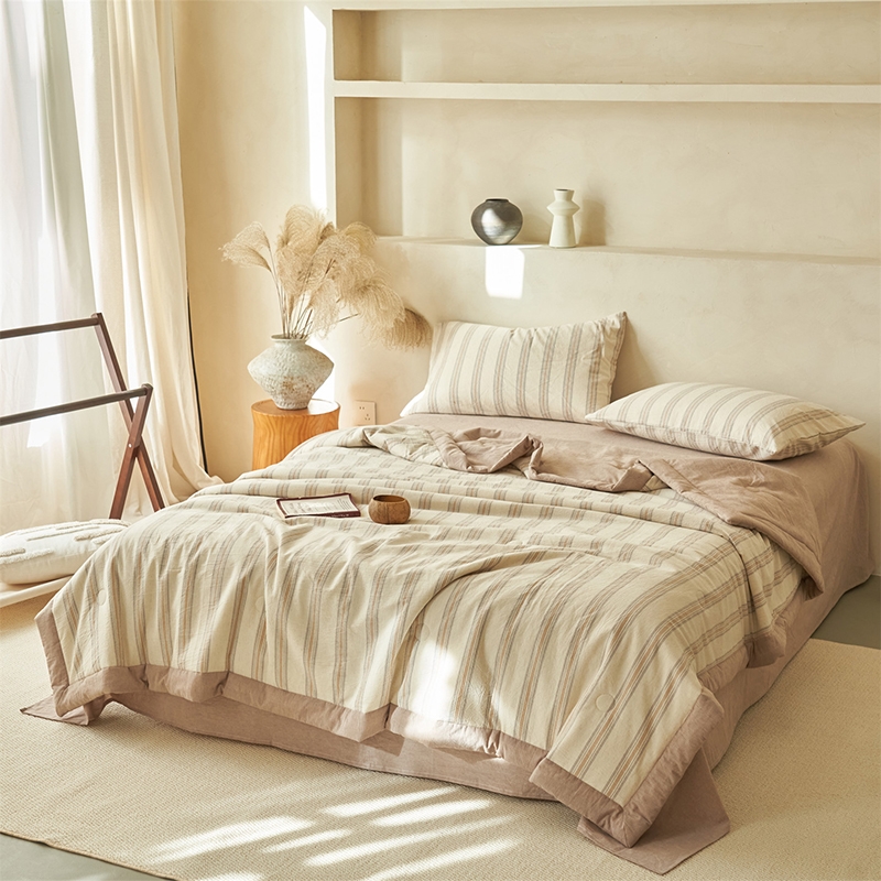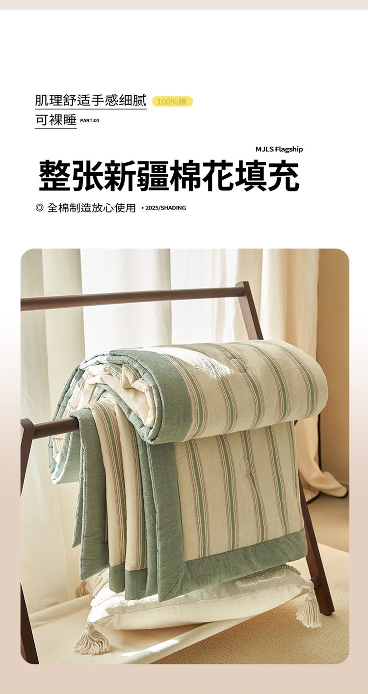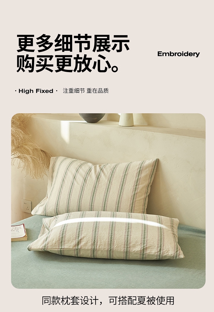 棉麻混纺面料,透气干爽不闷汗,天然亲肤更安心;纯棉花填充,蓬松柔软,轻盈不压身,凉而不冰;吸湿排汗,四季可用,易打理,夏日睡眠好搭档
