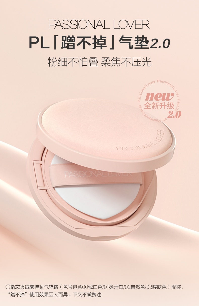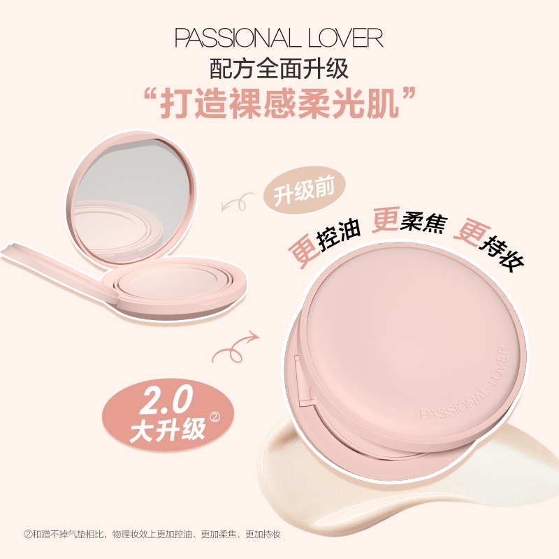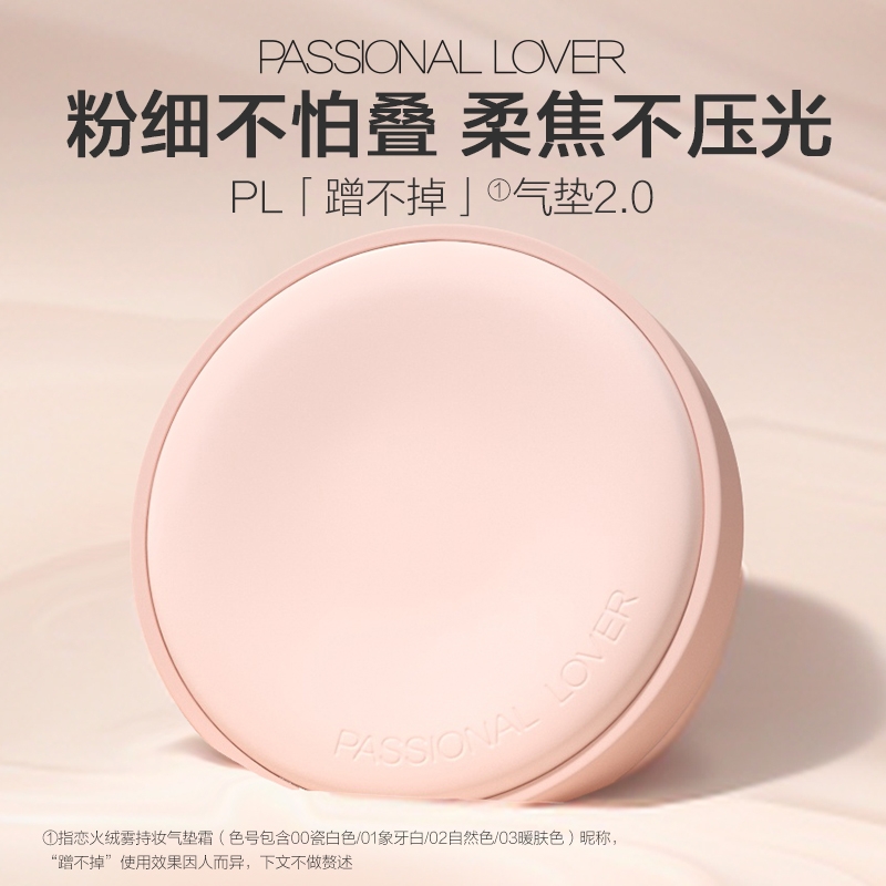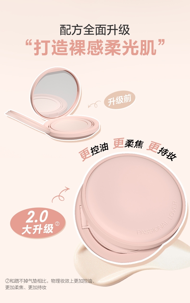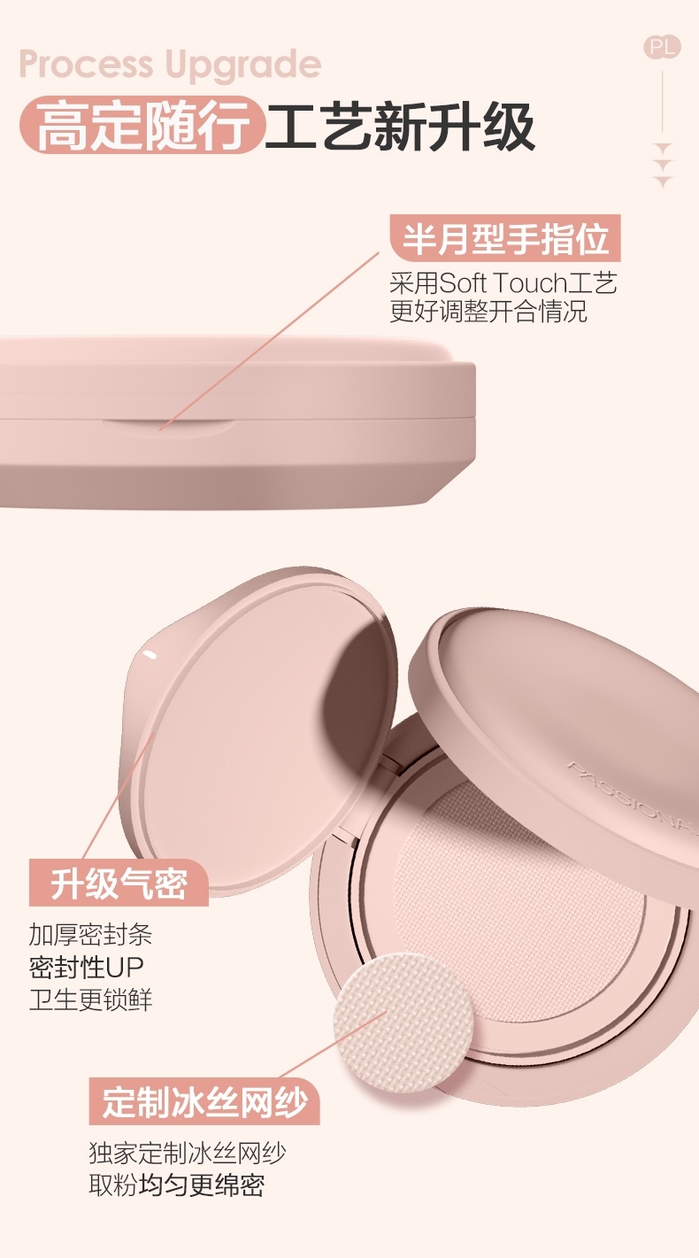 粉细不怕叠,柔焦不压光,PL蹭不掉气垫2.0;配方全面升级,打造裸感柔光肌,更控油,更柔焦、持妆;贴心设计,细节满满,半月型手指位,定制冰丝网纱