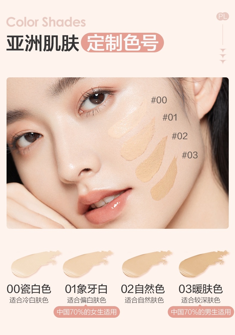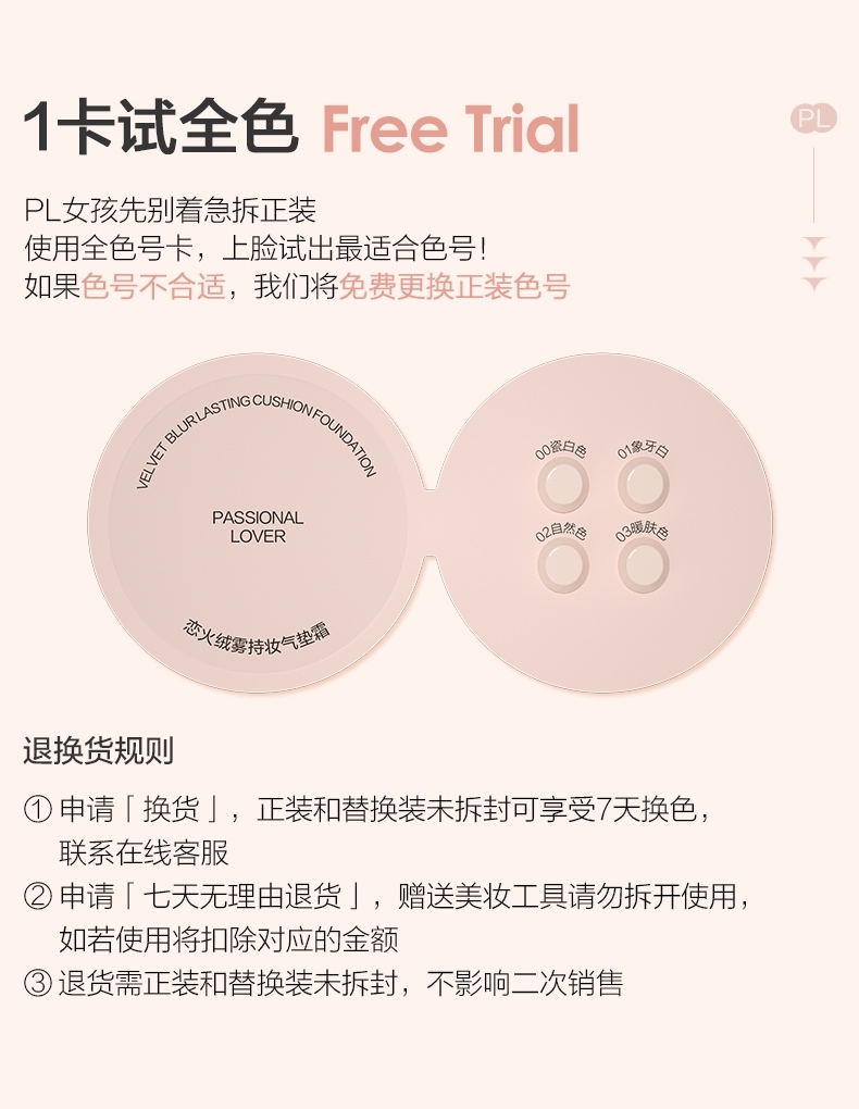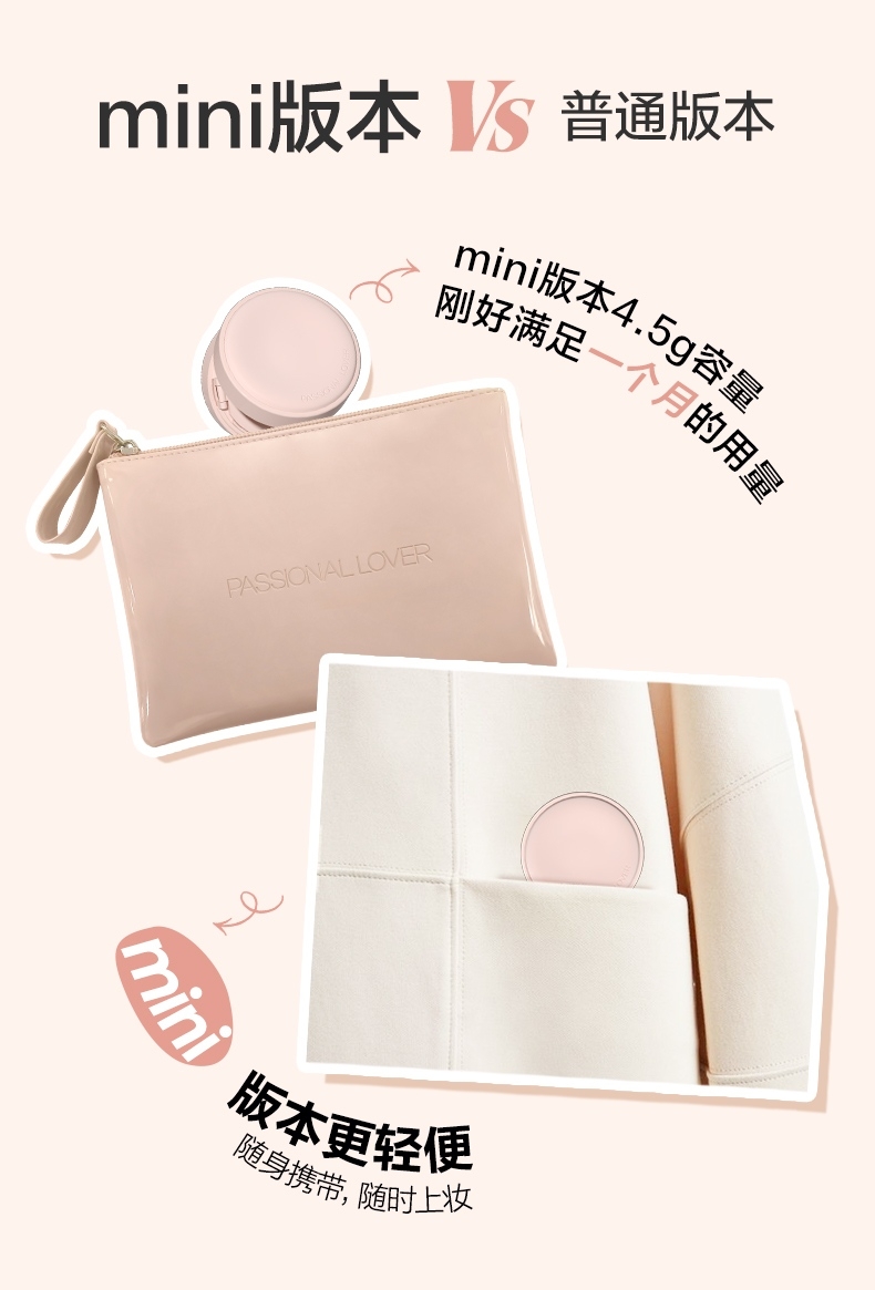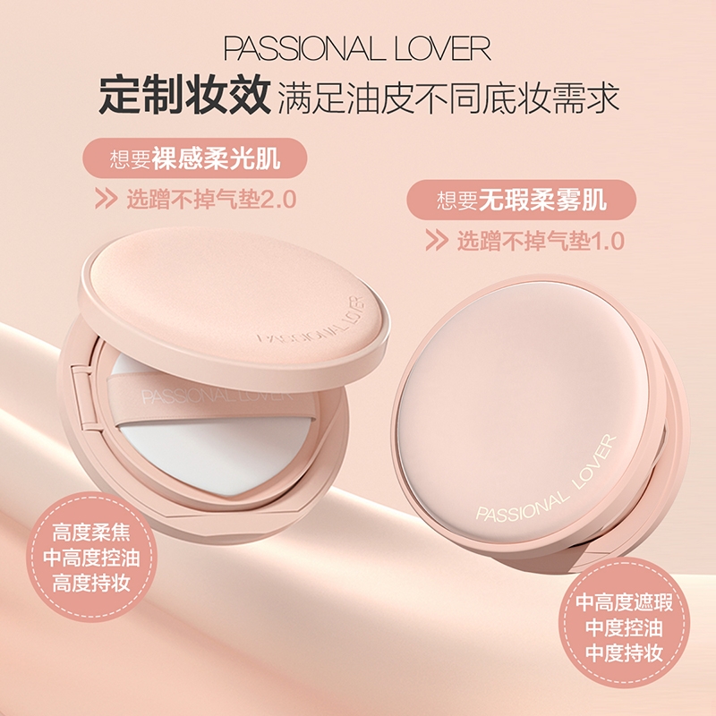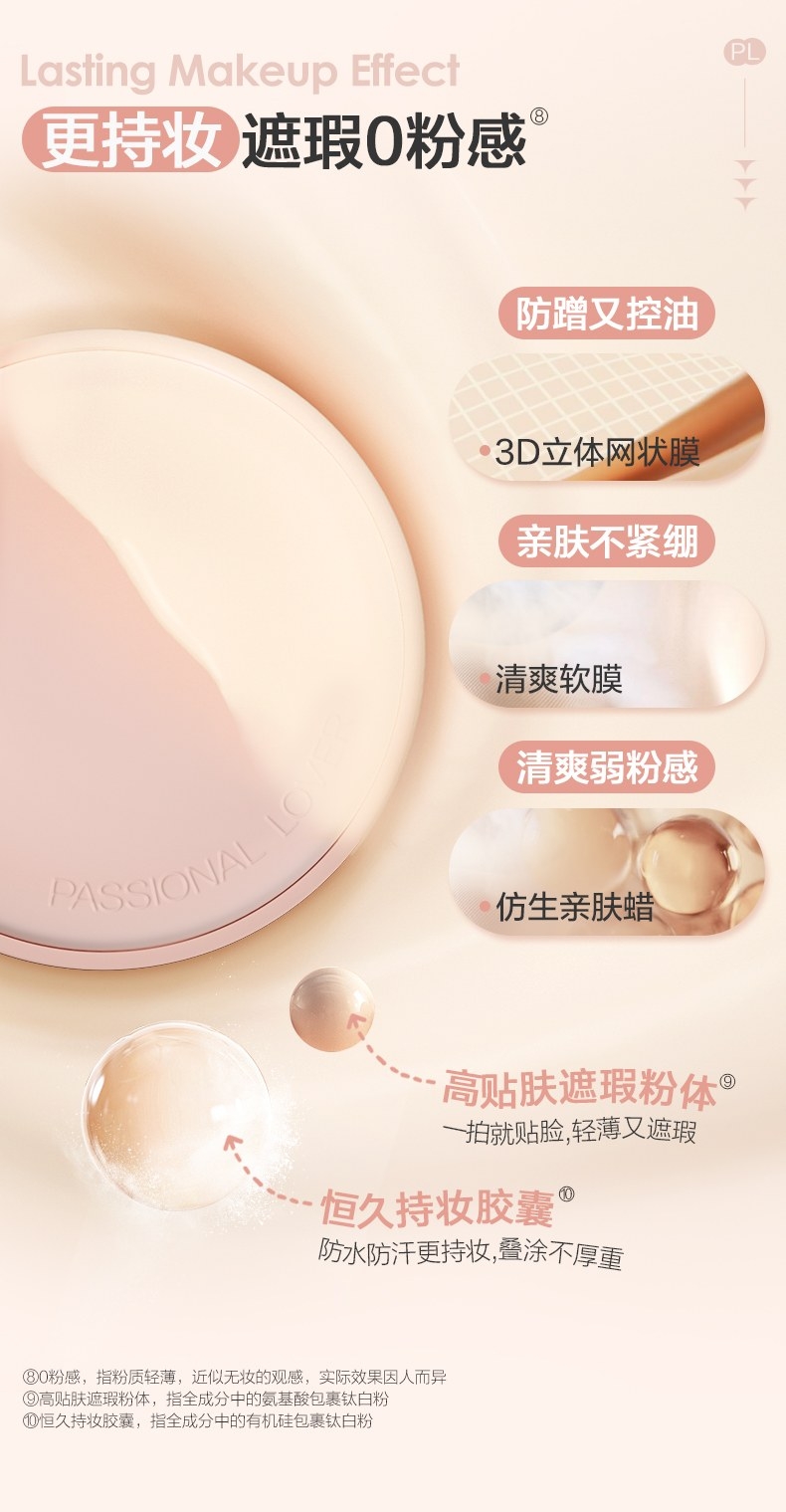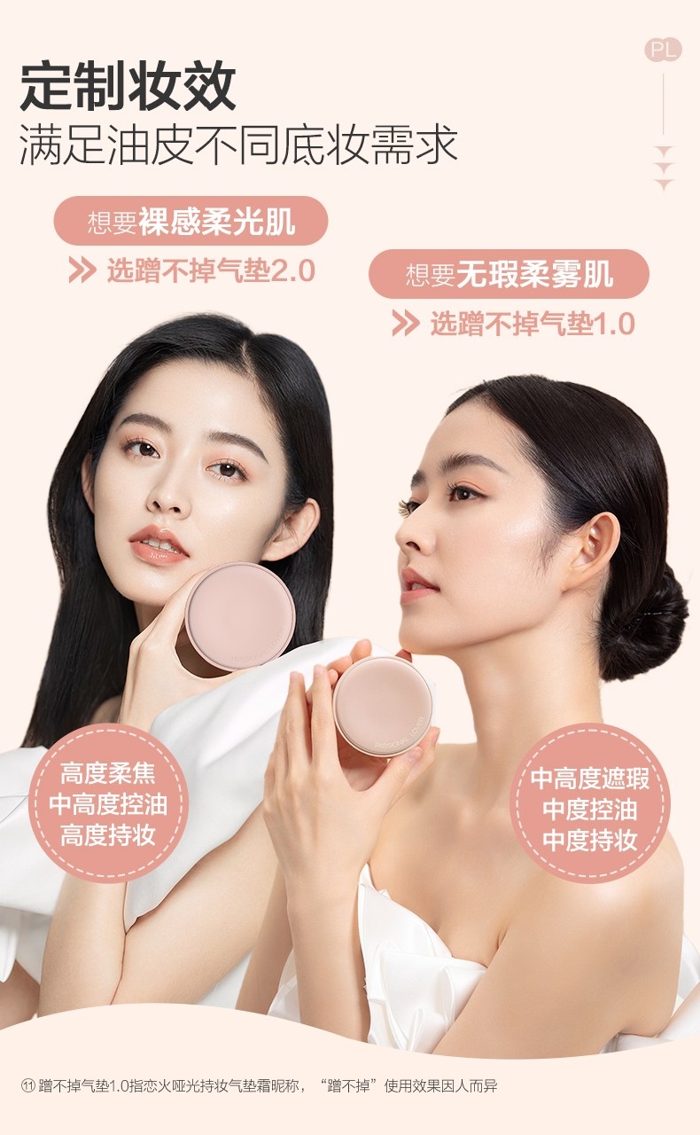粉细不怕叠,柔焦不压光,PL蹭不掉气垫2.0;配方全面升级,打造裸感柔光肌,更控油,更柔焦、持妆;贴心设计,细节满满,半月型手指位,定制冰丝网纱