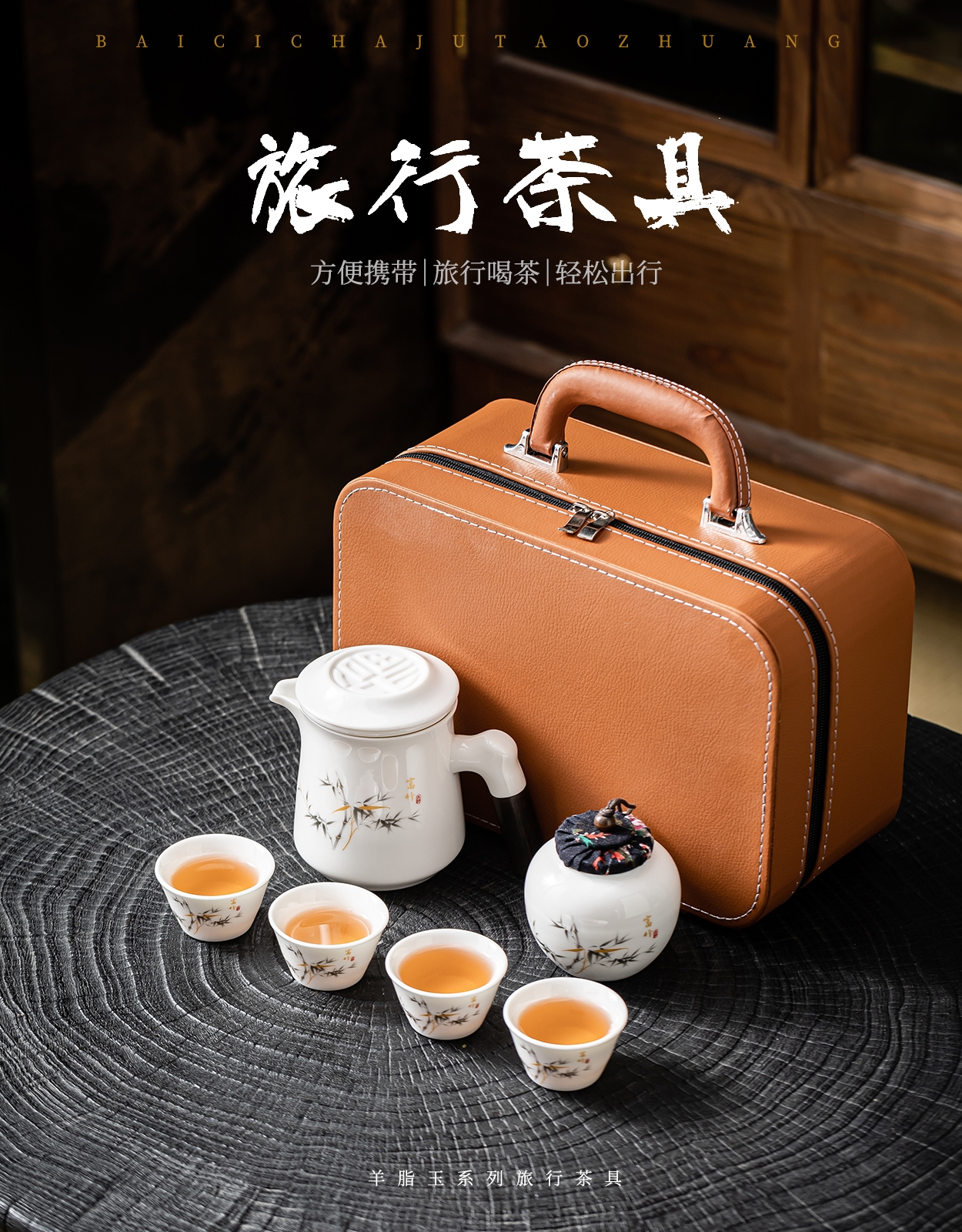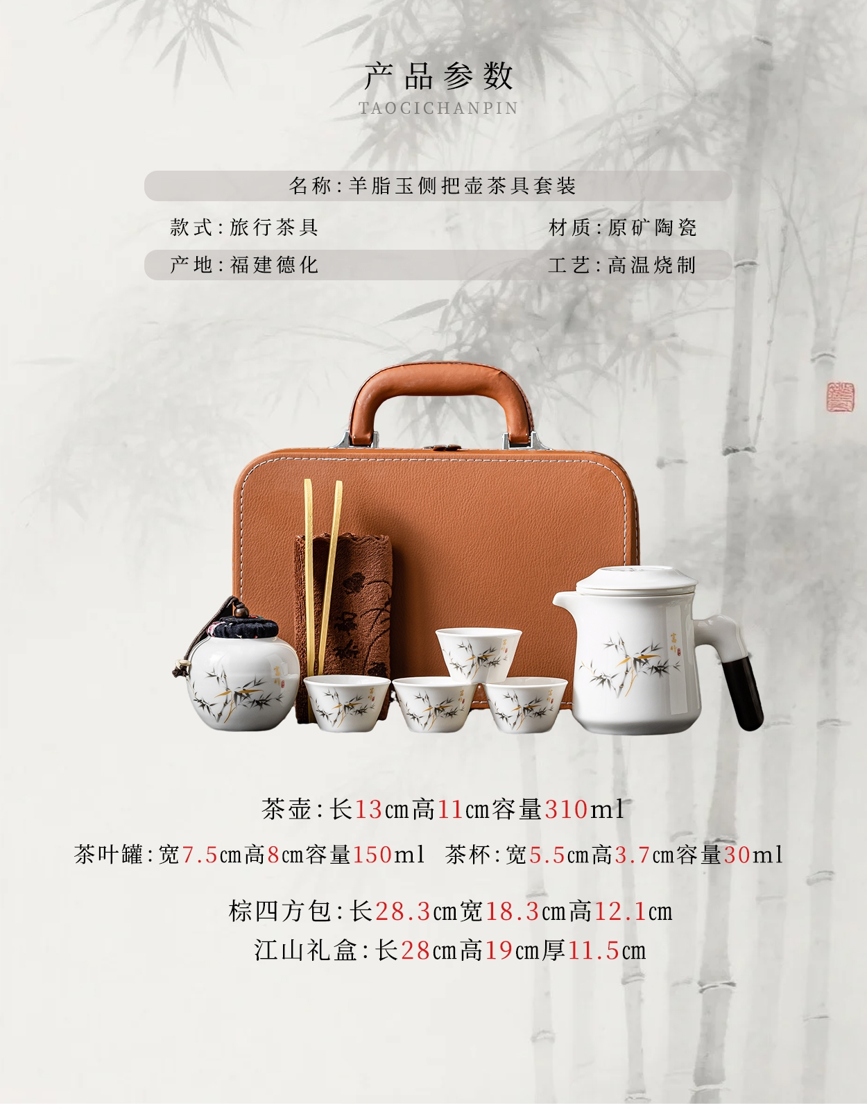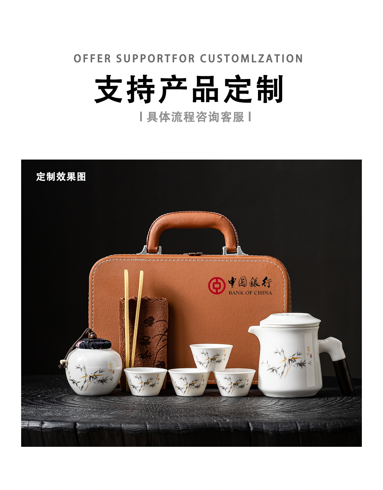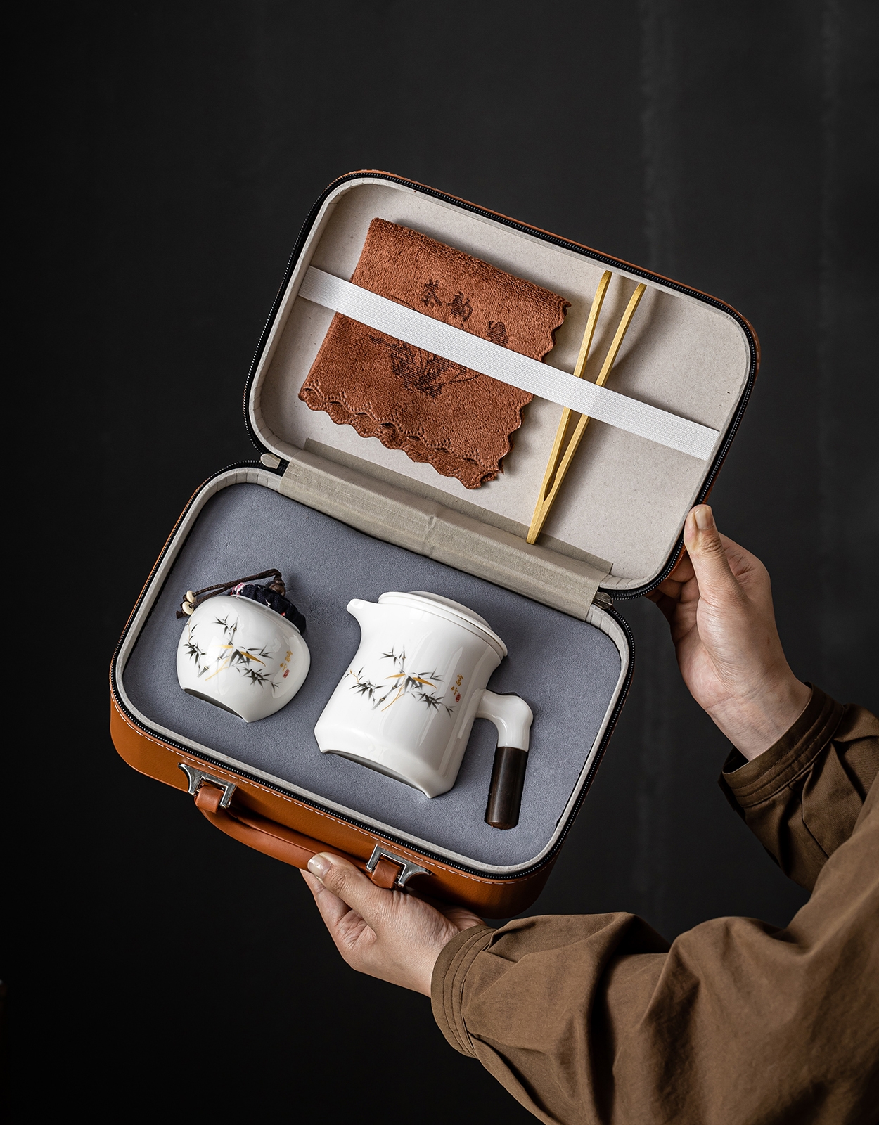 茶具表面贴山水图案,富有艺术感和文化内涵;一壶四杯加茶叶罐的组合,满足日常品茶或待客的需求;江山主题礼盒包装,设计大气典雅,手提设计便于携带