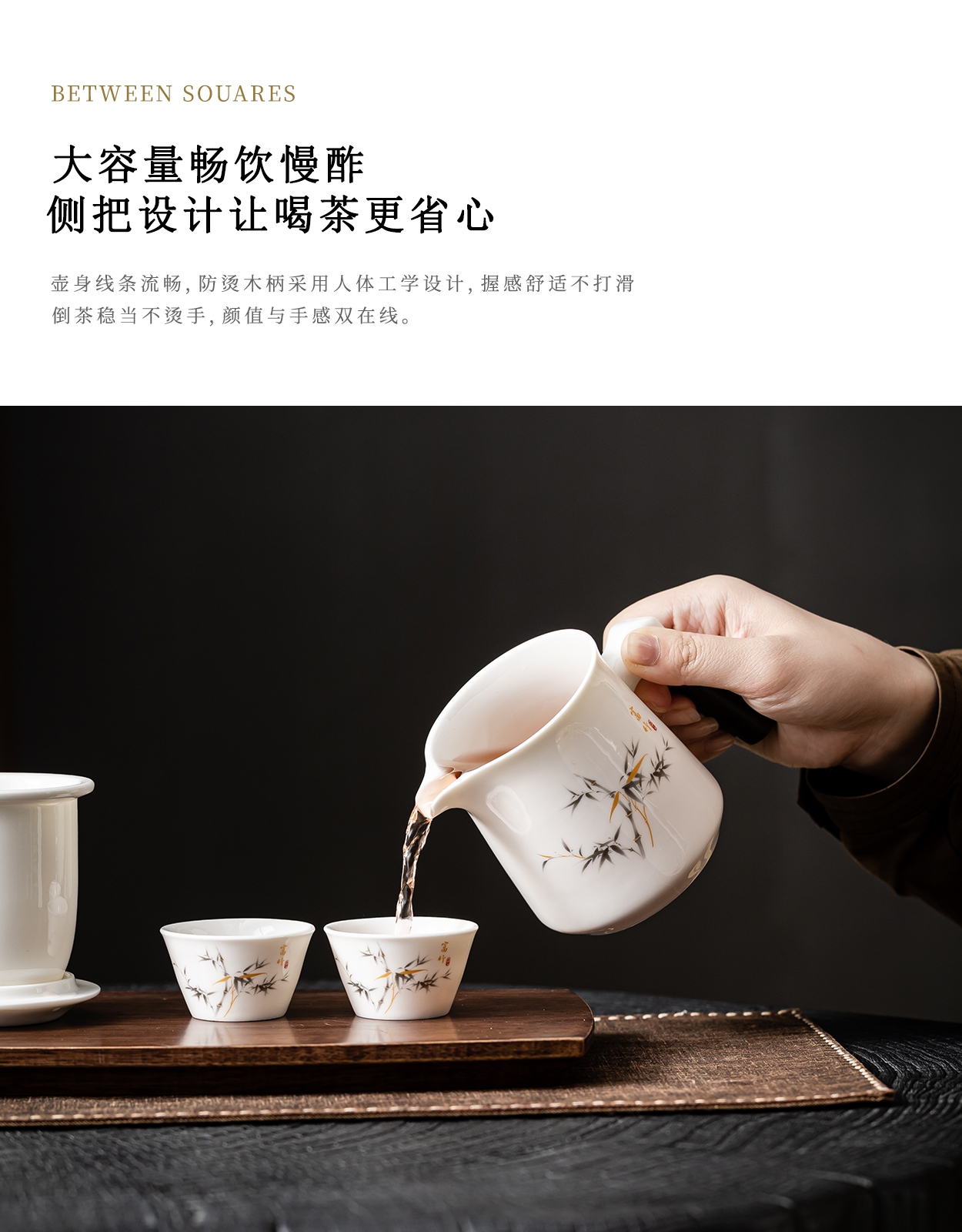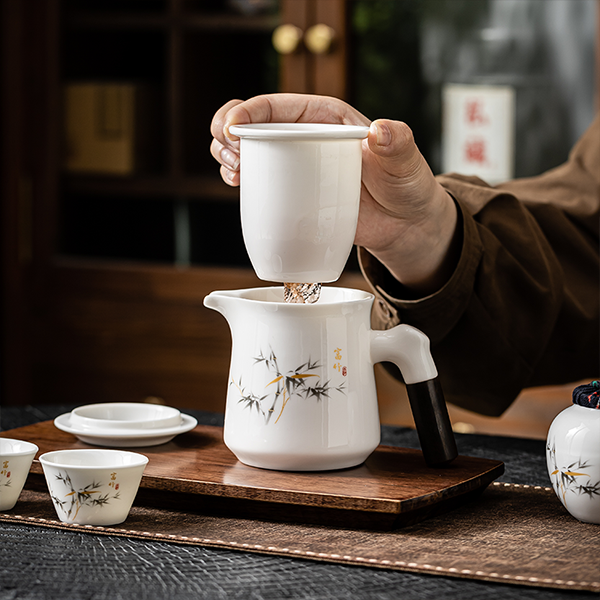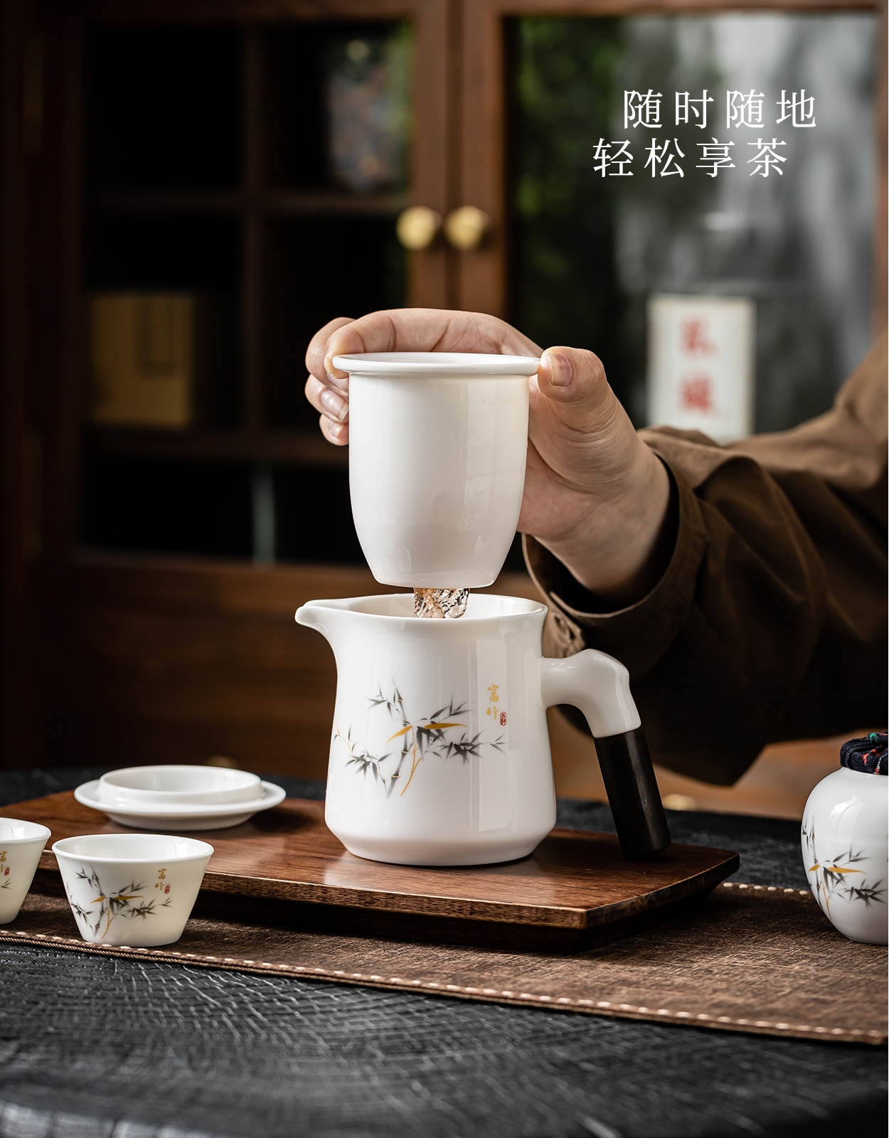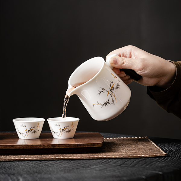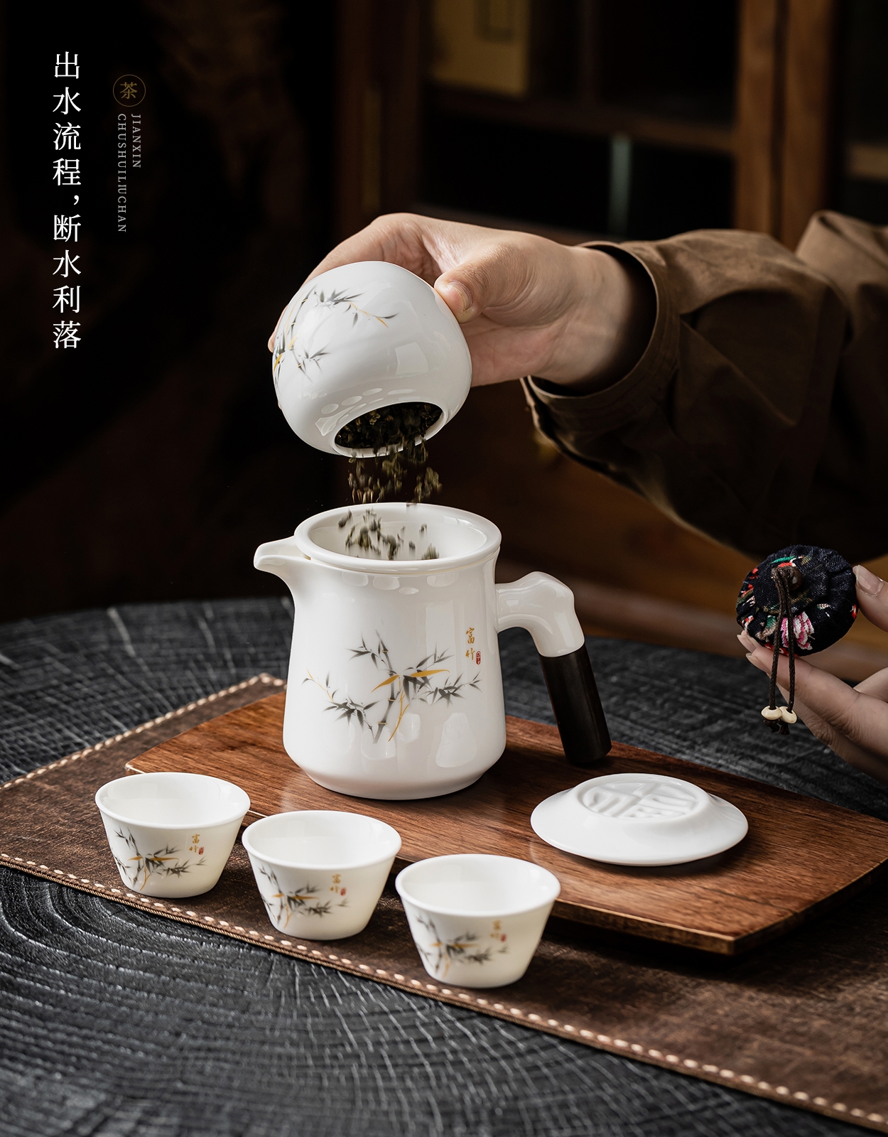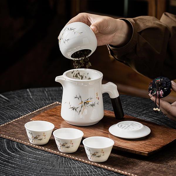 茶具表面贴山水图案,富有艺术感和文化内涵;一壶四杯加茶叶罐的组合,满足日常品茶或待客的需求;江山主题礼盒包装,设计大气典雅,手提设计便于携带