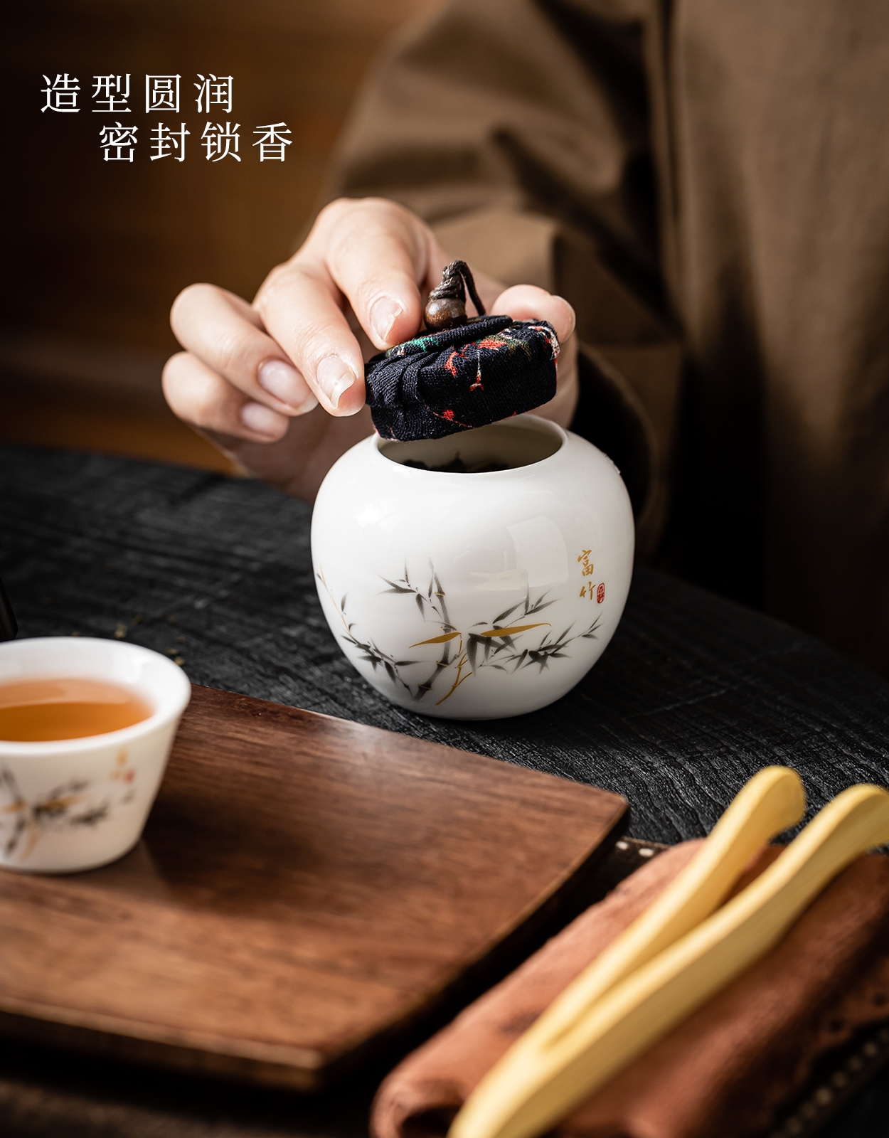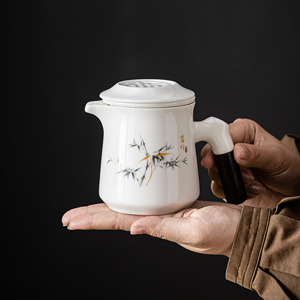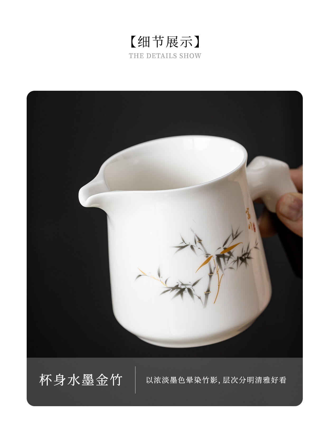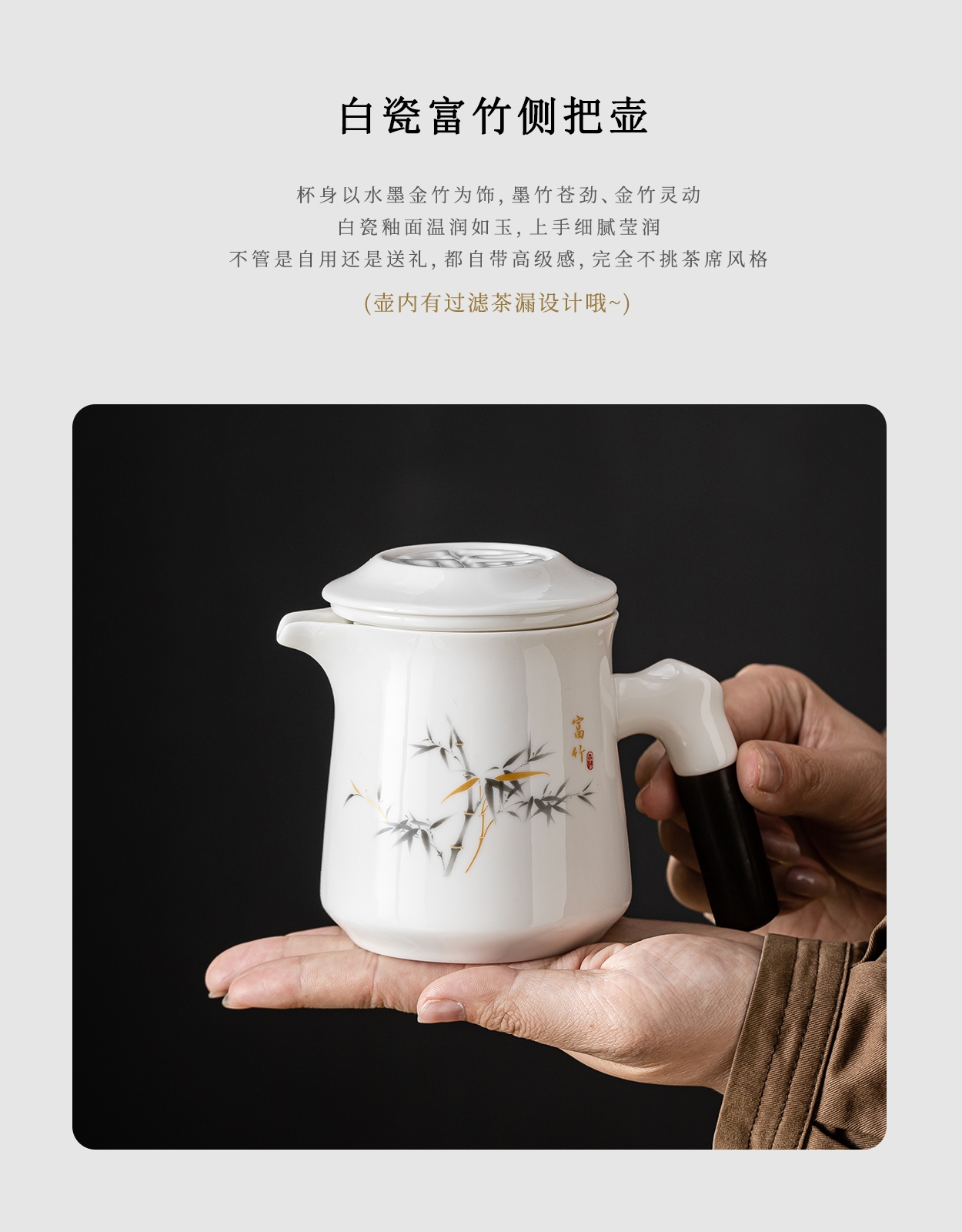 茶具表面贴山水图案,富有艺术感和文化内涵;一壶四杯加茶叶罐的组合,满足日常品茶或待客的需求;江山主题礼盒包装,设计大气典雅,手提设计便于携带