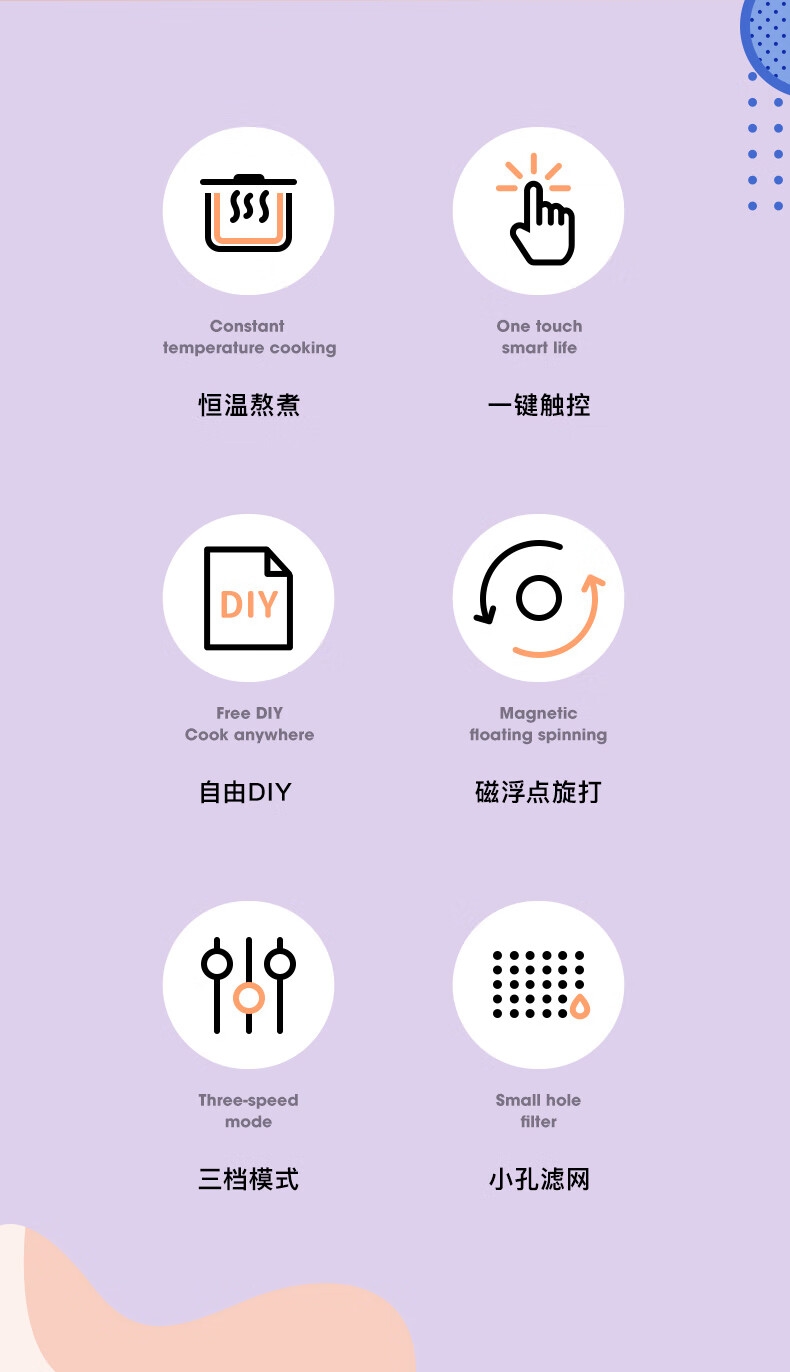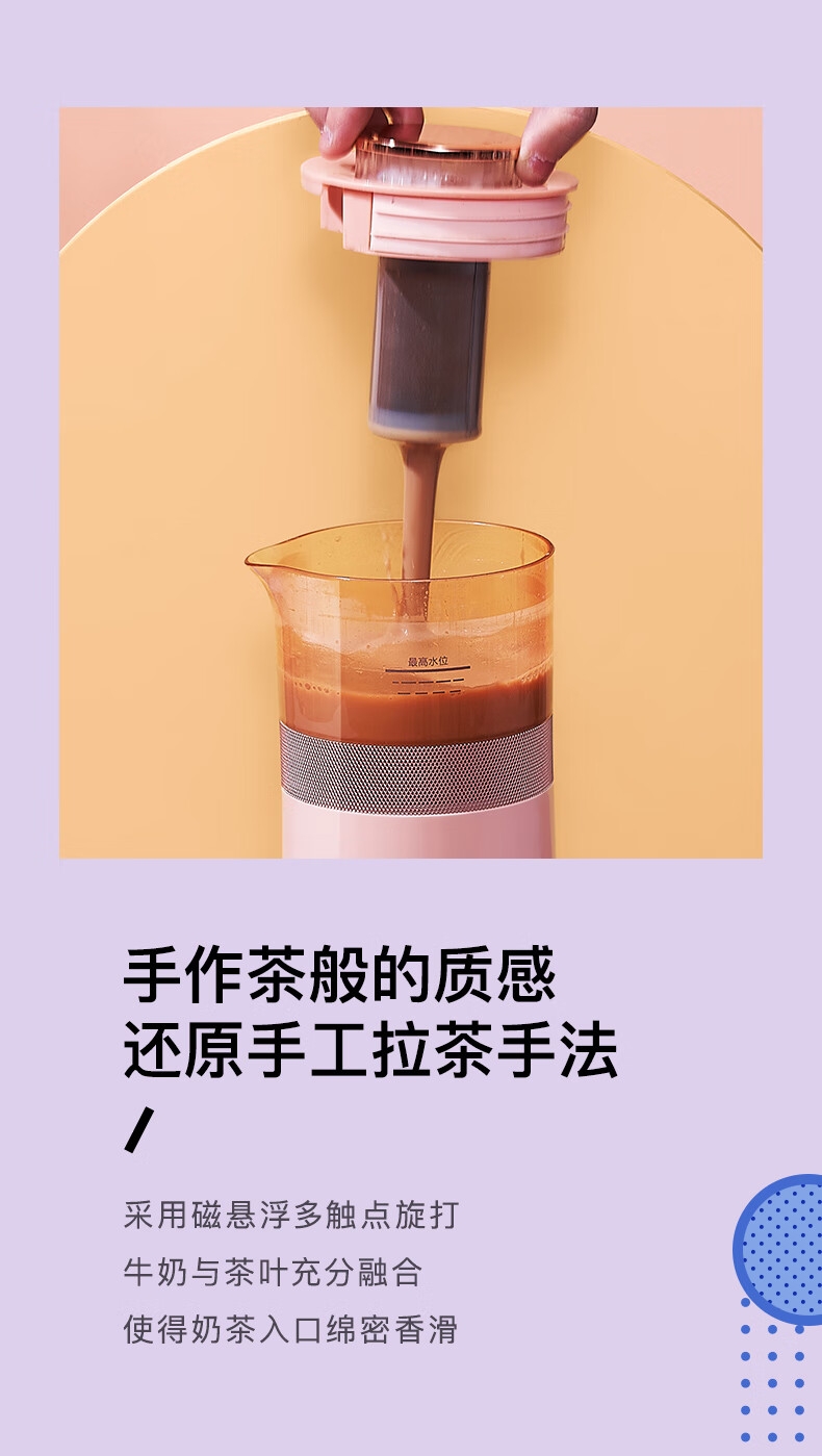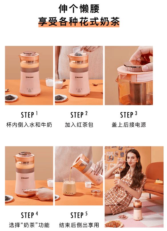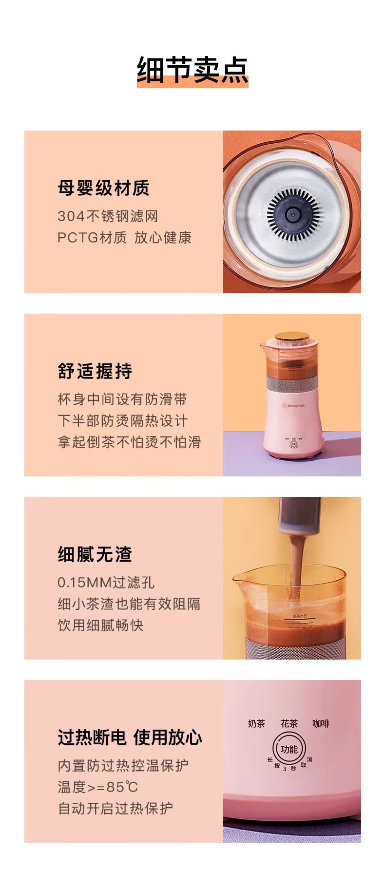母婴级材质 304不锈钢滤网PCTG材质放心健康;舒适握持 杯身中间设有防滑带下半部防烫隔热设计拿起;过热断电 使用放心 内置防过热控温保护温度>=85