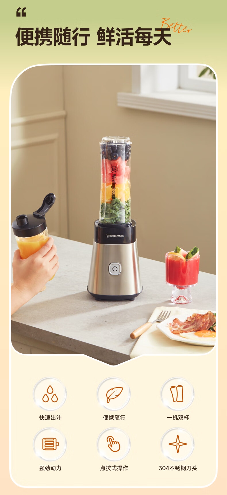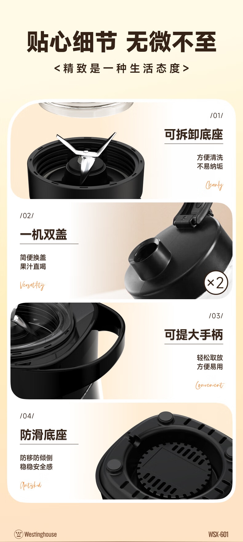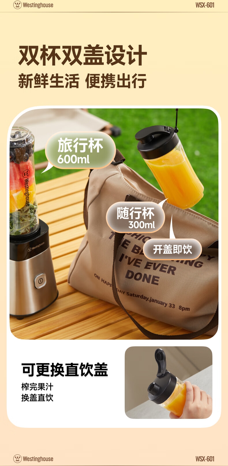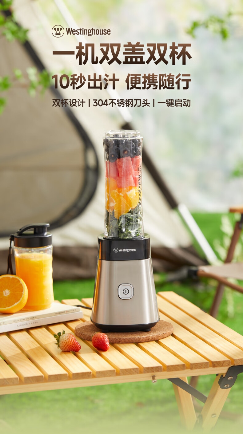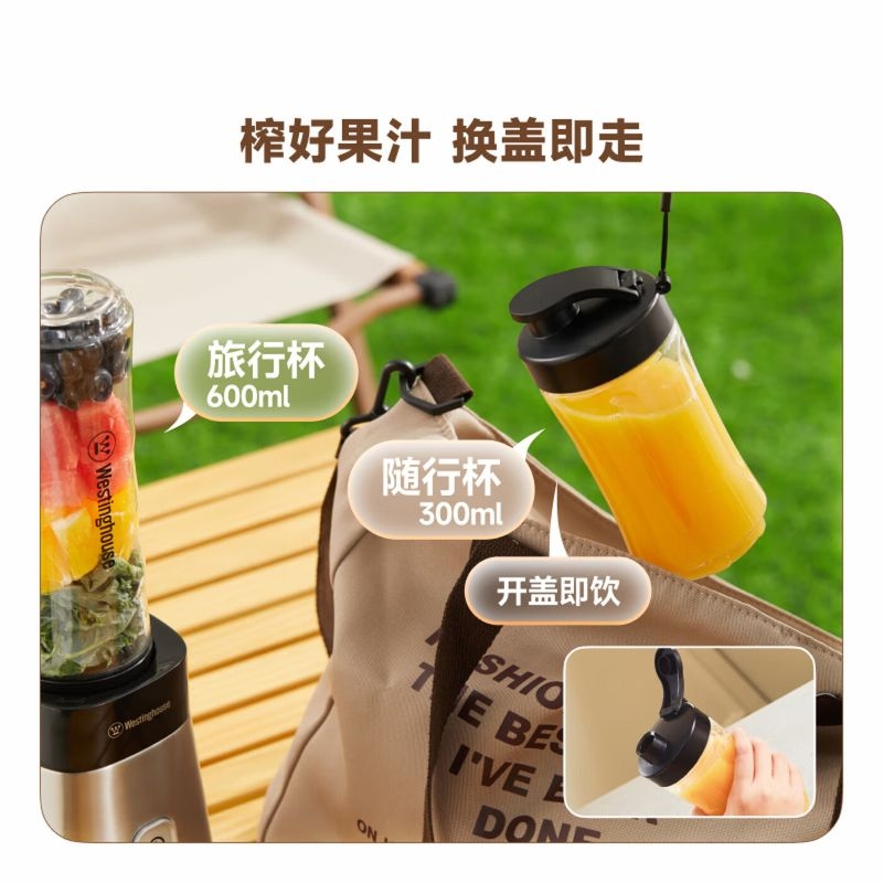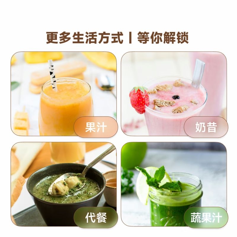 10秒快速即榨 美味无需等待 轻松搅拌、细腻榨汁,;双杯双盖设计新鲜生活便携出行;高转速电机冰块秒变冰沙