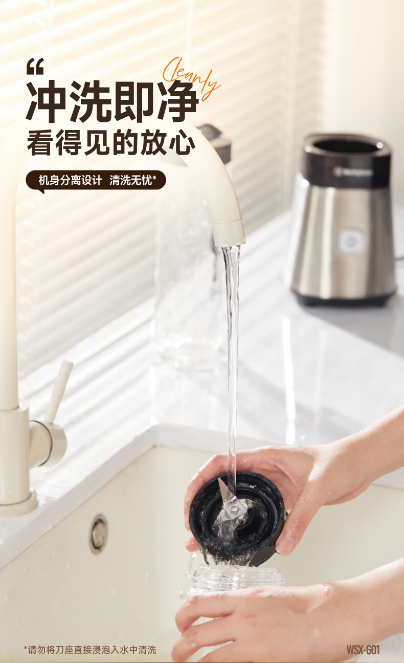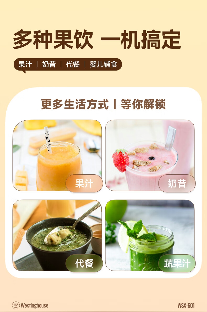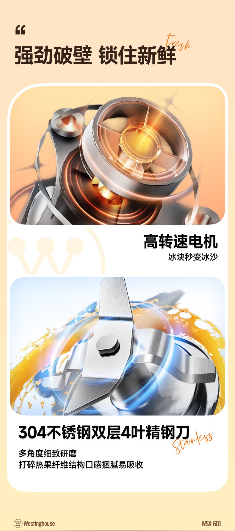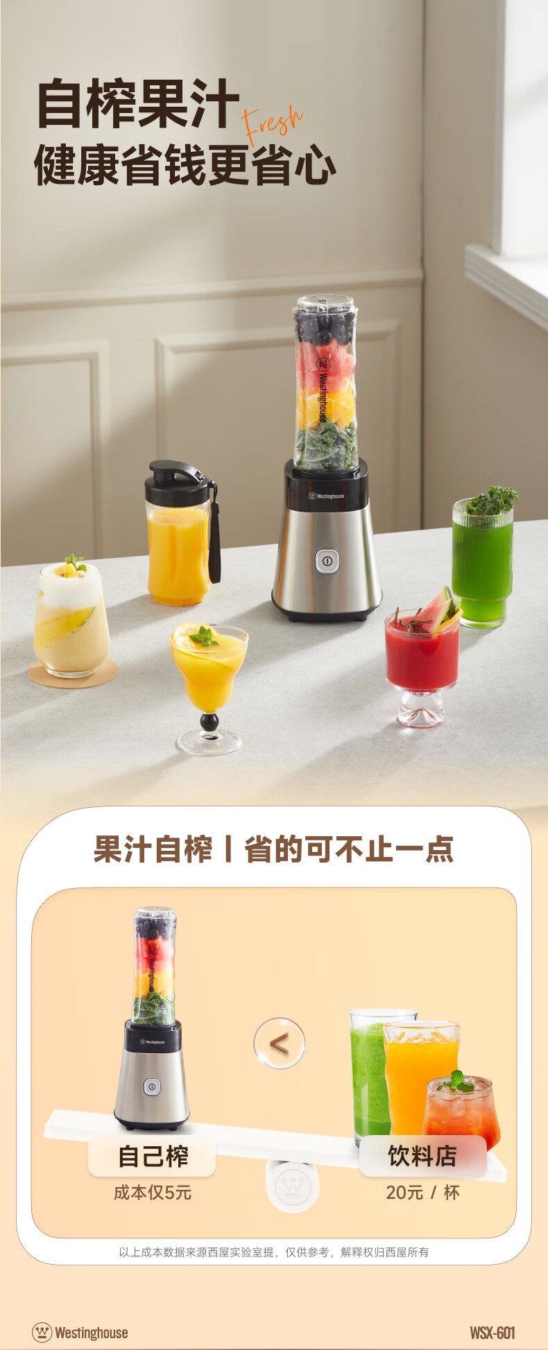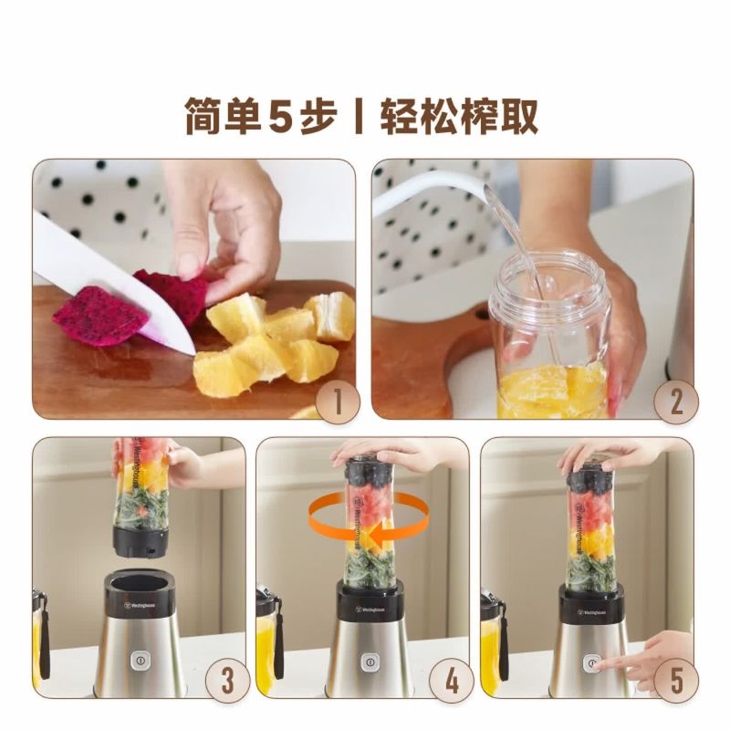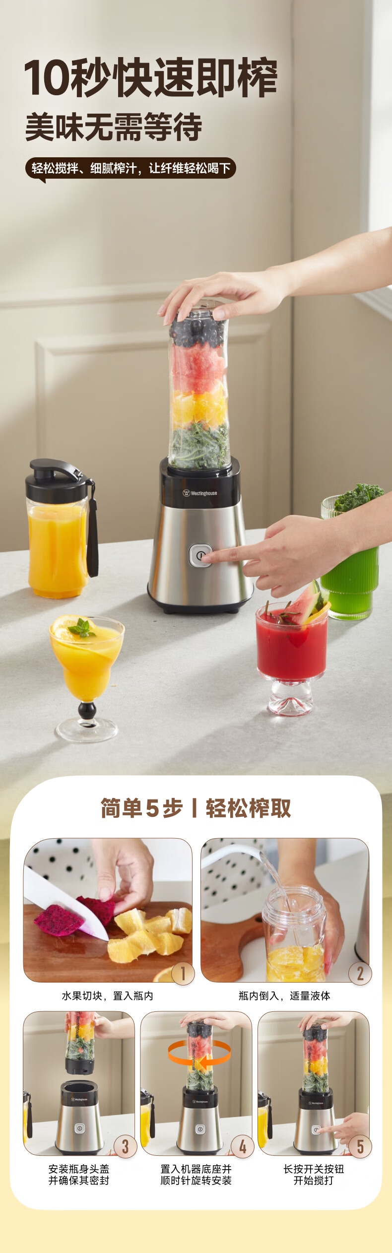 10秒快速即榨 美味无需等待 轻松搅拌、细腻榨汁,;双杯双盖设计新鲜生活便携出行;高转速电机冰块秒变冰沙