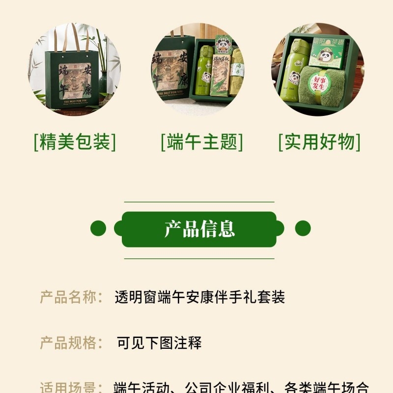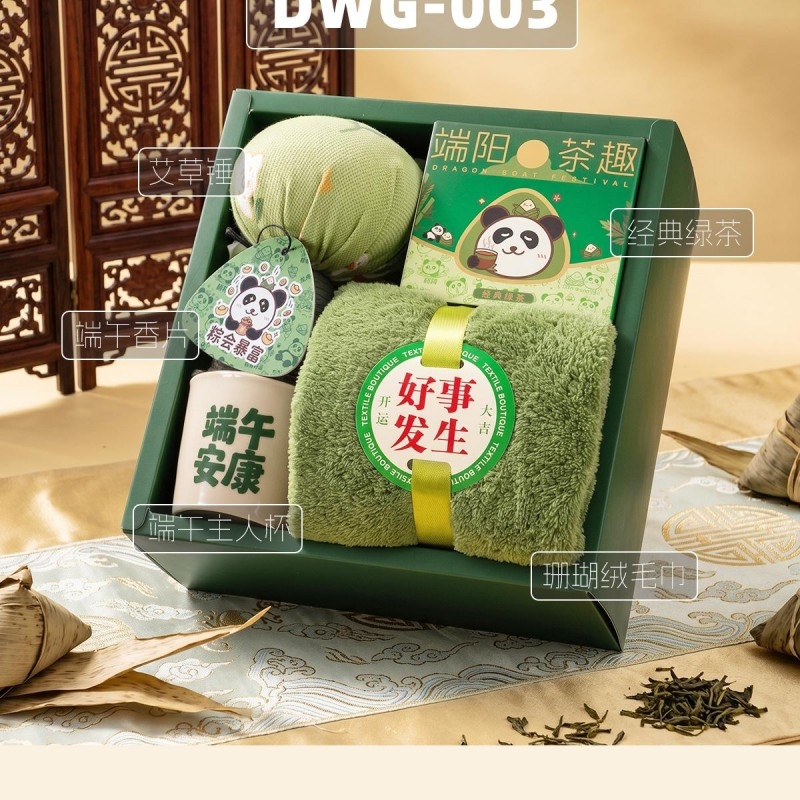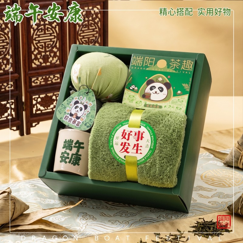 组合:艾草养生锤*1、端午安康主人杯*1、端午经典绿茶2g*2袋、好事发生毛巾35*74CM、端午香片(白茶香)*1
