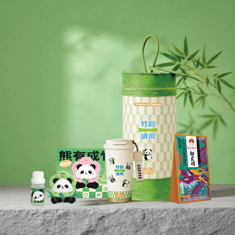 礼盒配置:手提毛毡竹节桶*1、熊有成竹香薰车挂*1 竹韵咖啡杯*1 御庄园粽子*1