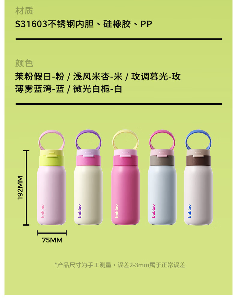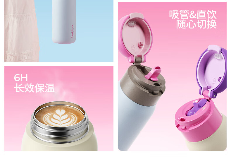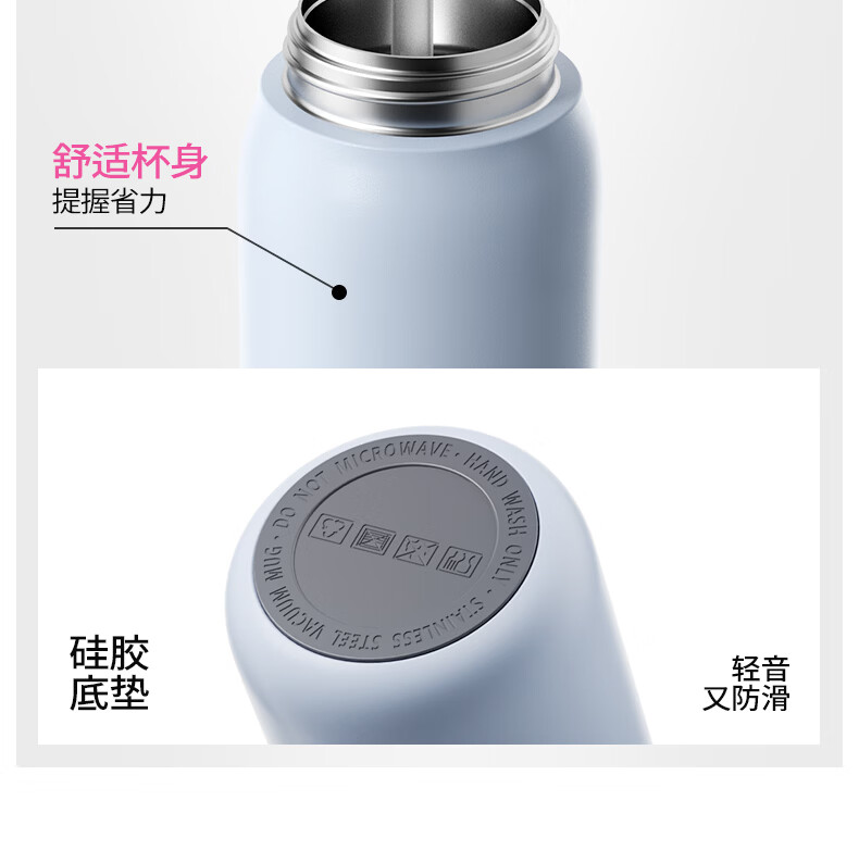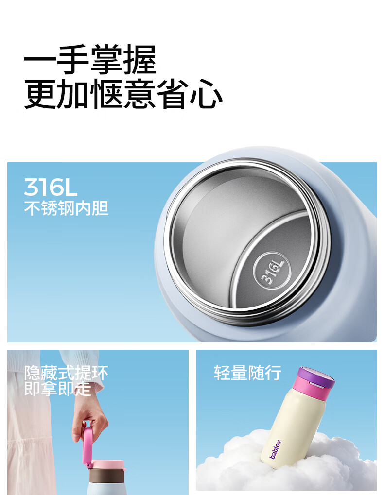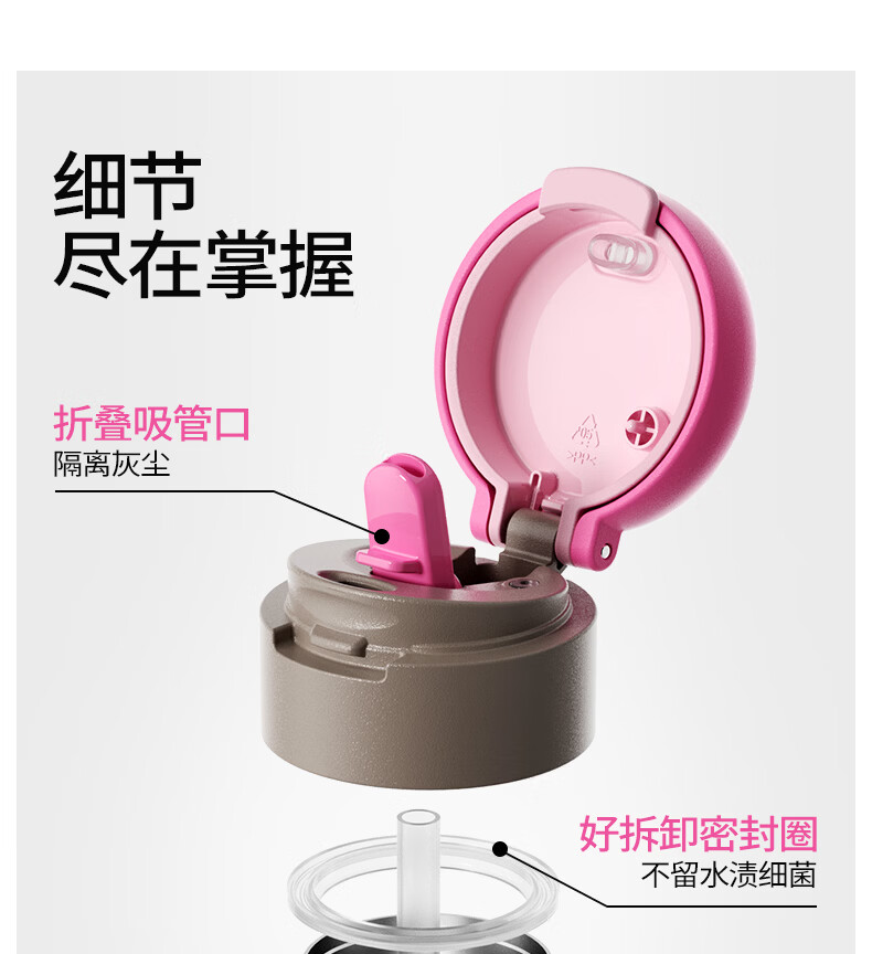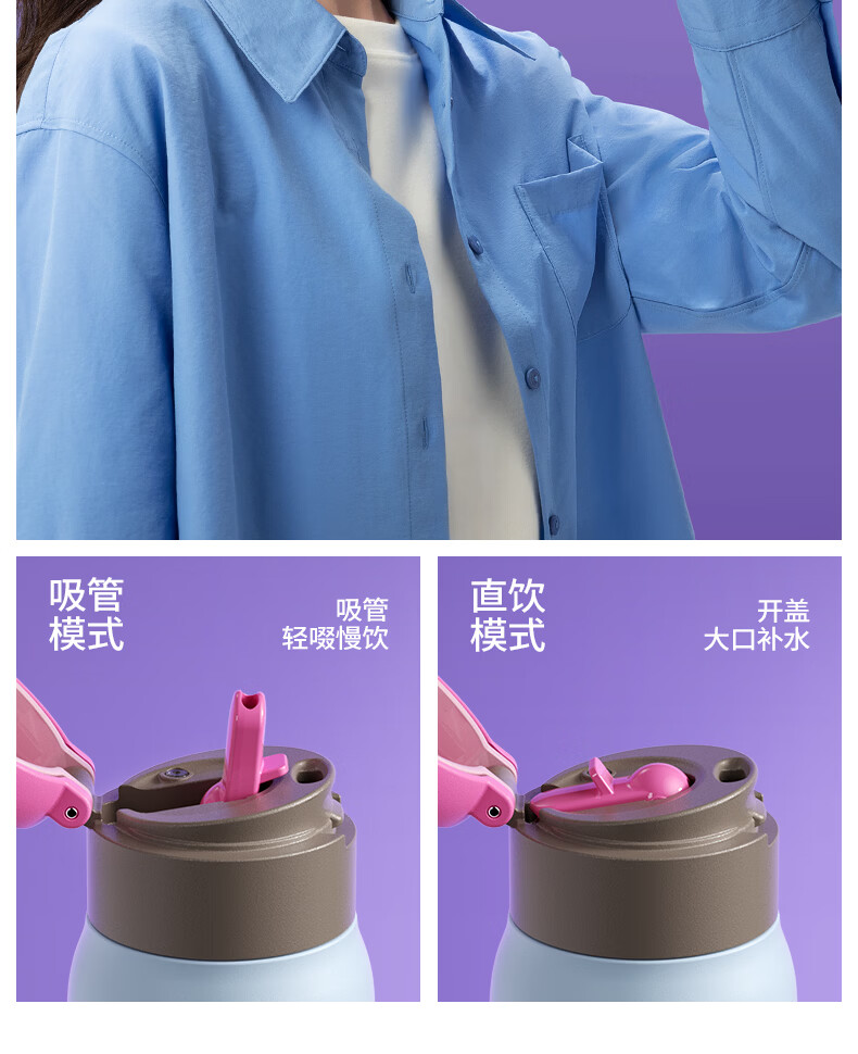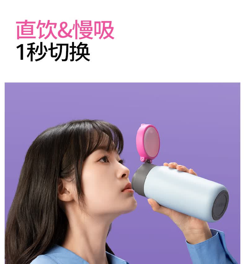 食品级316不锈钢内胆,守护饮水健康;隐藏式提环设计,单手一拎即走;双模式饮水口,隐藏吸管与直饮自由切换