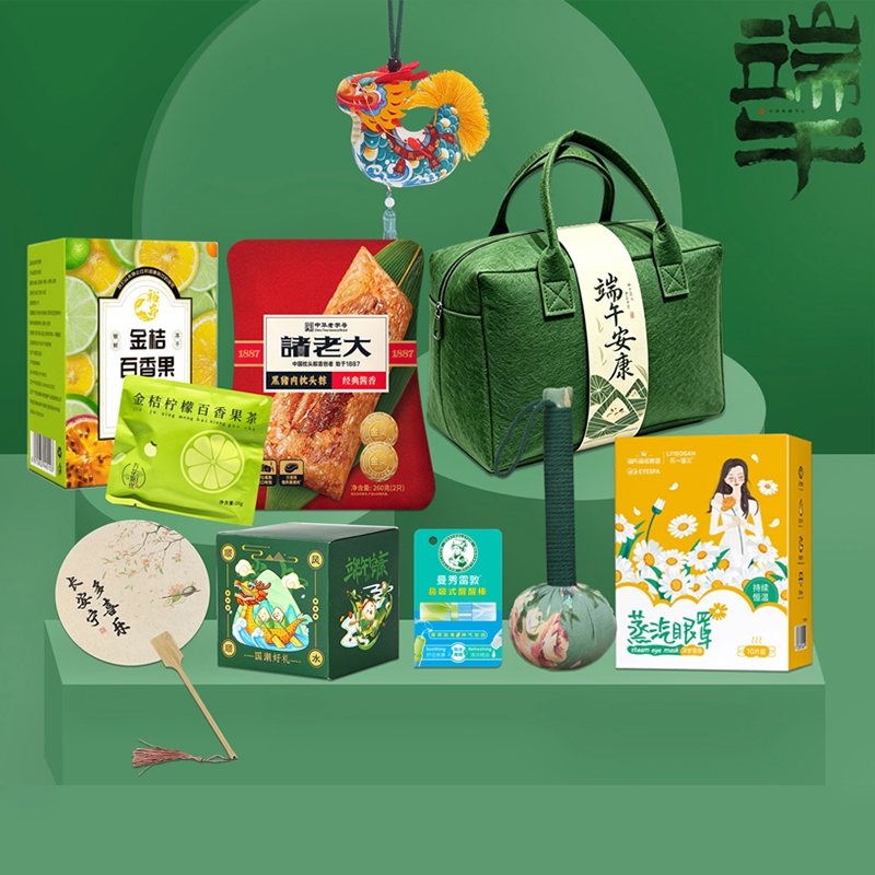 配置清单:1.诸老大黑猪肉枕头粽子260g*1 (2只) 2.金桔柠檬百香果茶100g*1(20g*5袋) 3.曼秀雷敦鼻吸式醒醒棒1.3ml*1 4.海氏海诺蒸汽眼罩10片 装*1 5.艾草养生锤*1 6.龙舟香囊小挂件*1 (彩盒包装) 7.长安宁多喜乐团扇*1 8.端午安康收纳包*1(图片色)