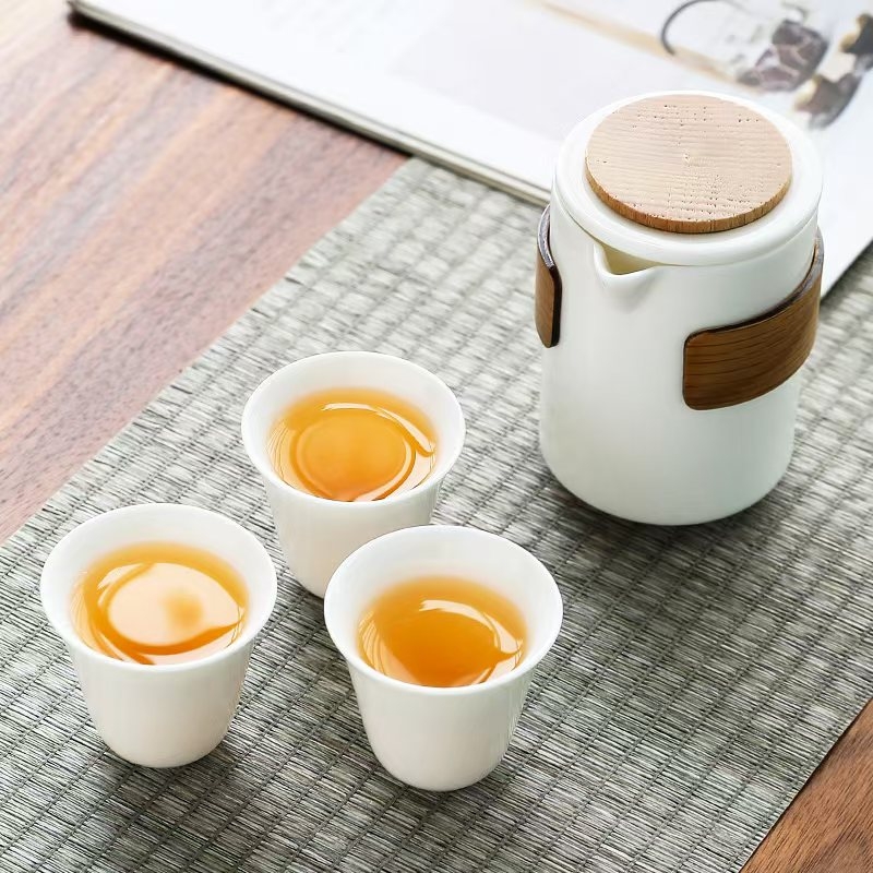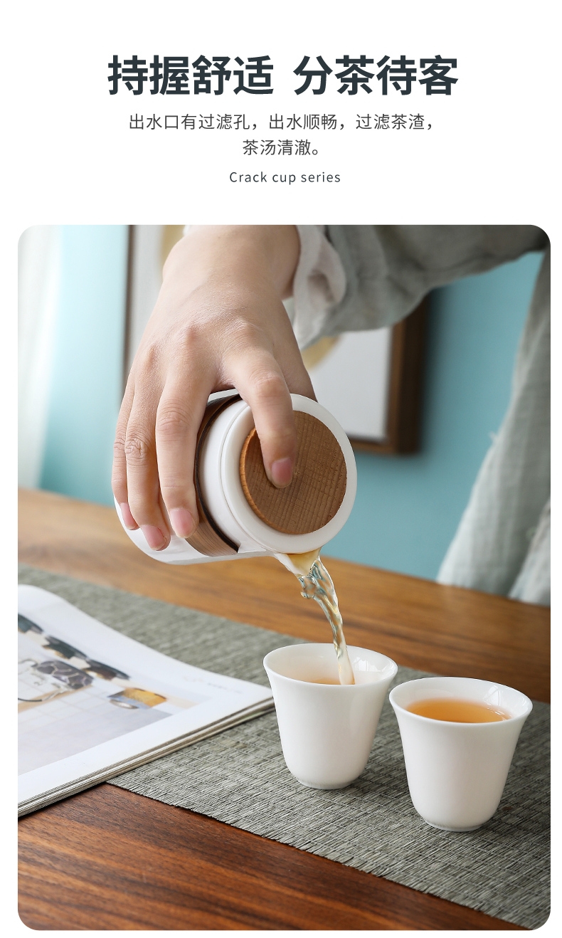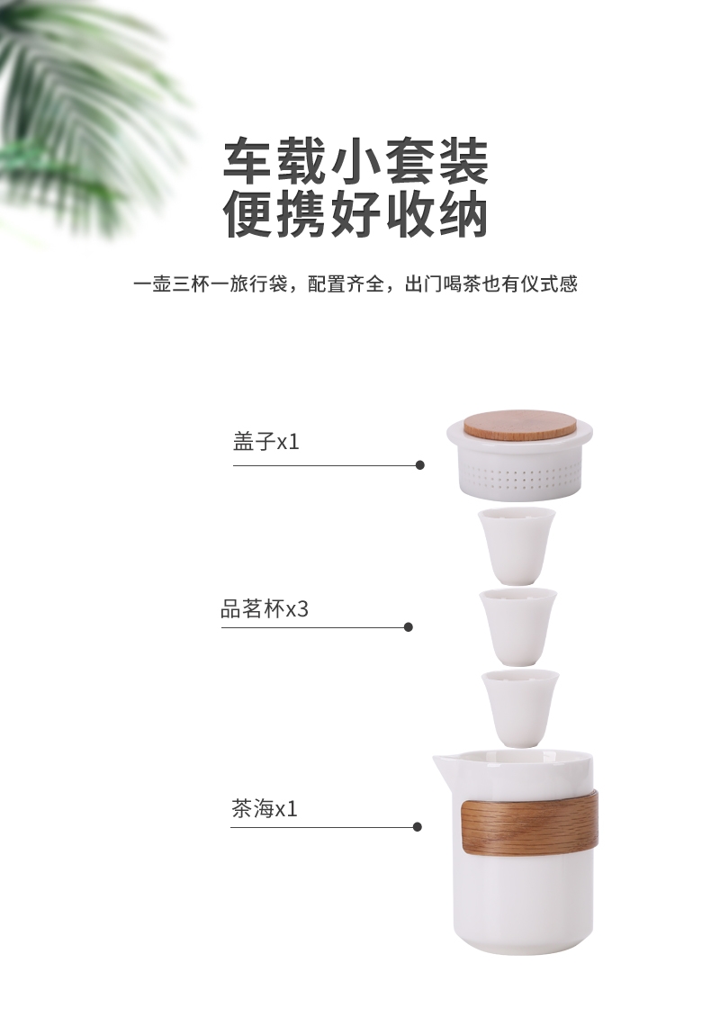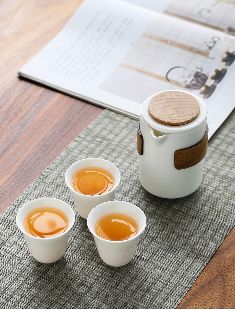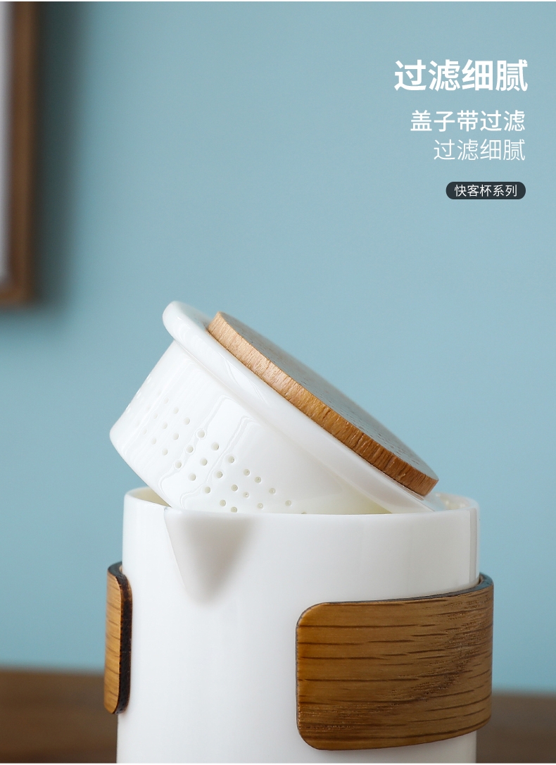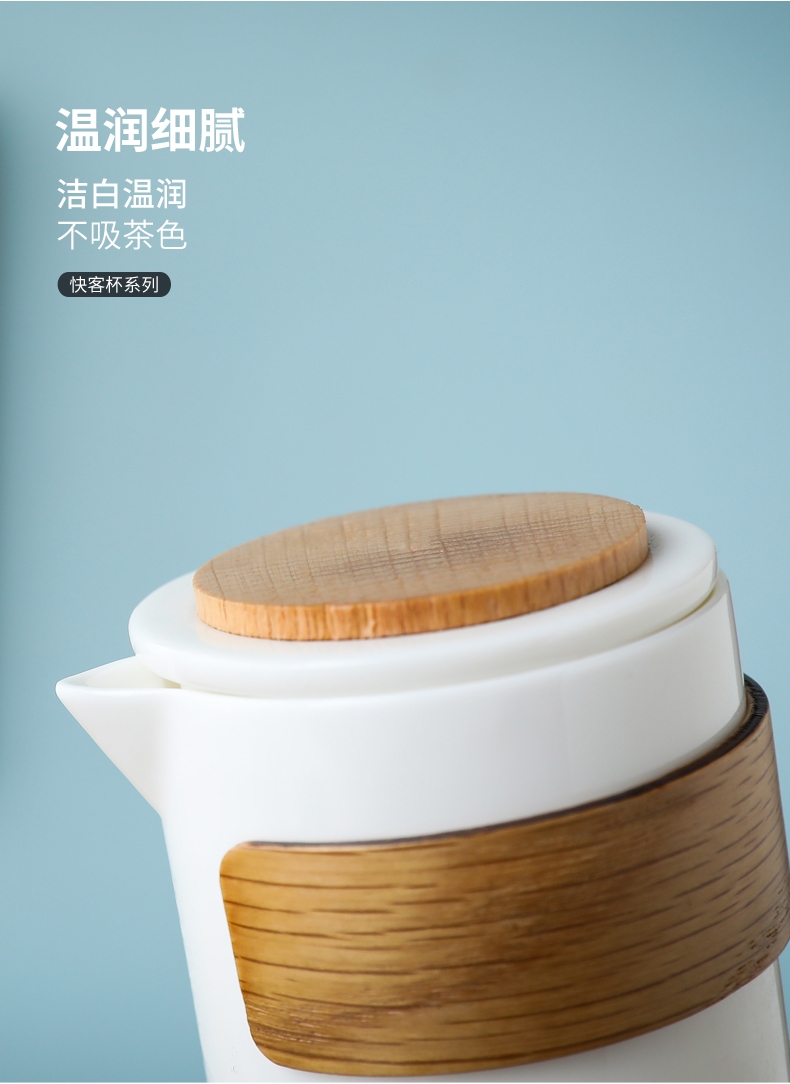 三个杯子可与壶上下重叠组合。实木盖子手柄,隔热防烫;壶盖自带过滤孔,过滤茶渣,方便携带,简单实用。;高档羊脂玉瓷,瓷质细腻温润,触感舒适。似凝脂,