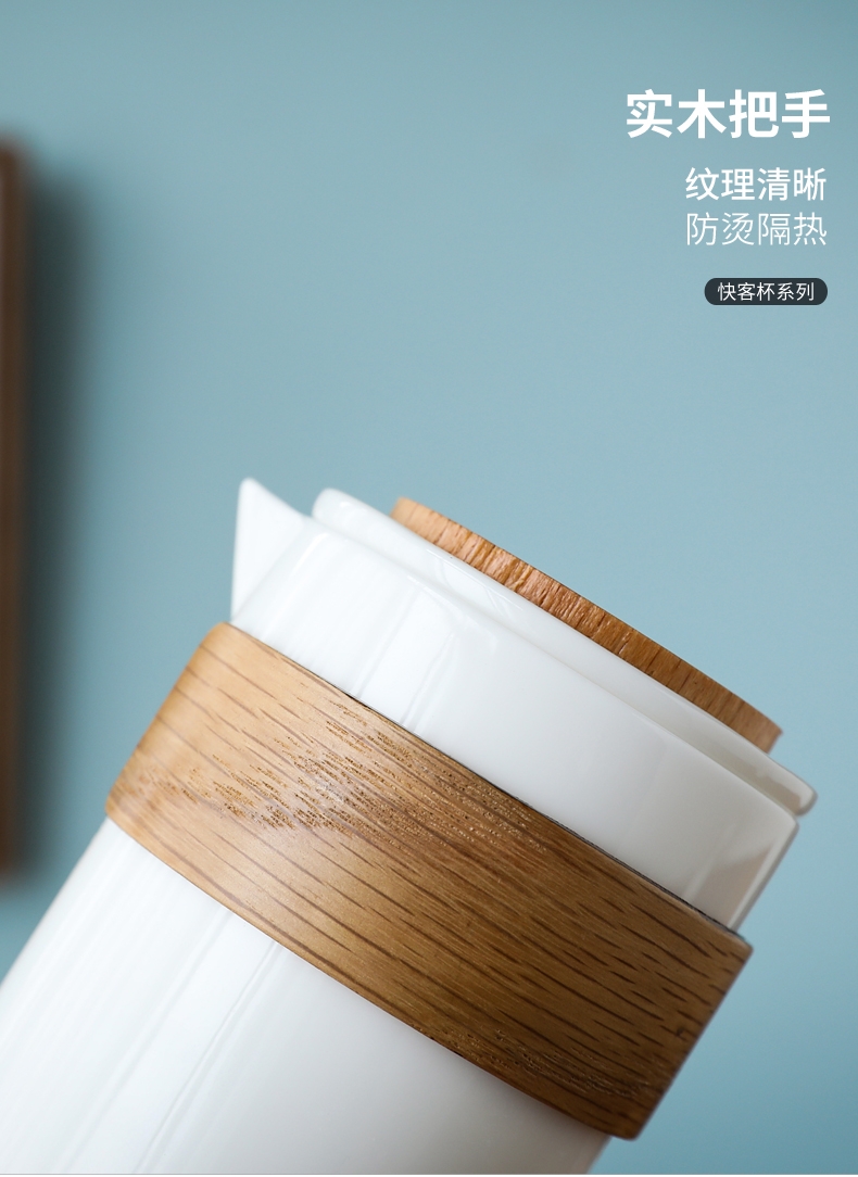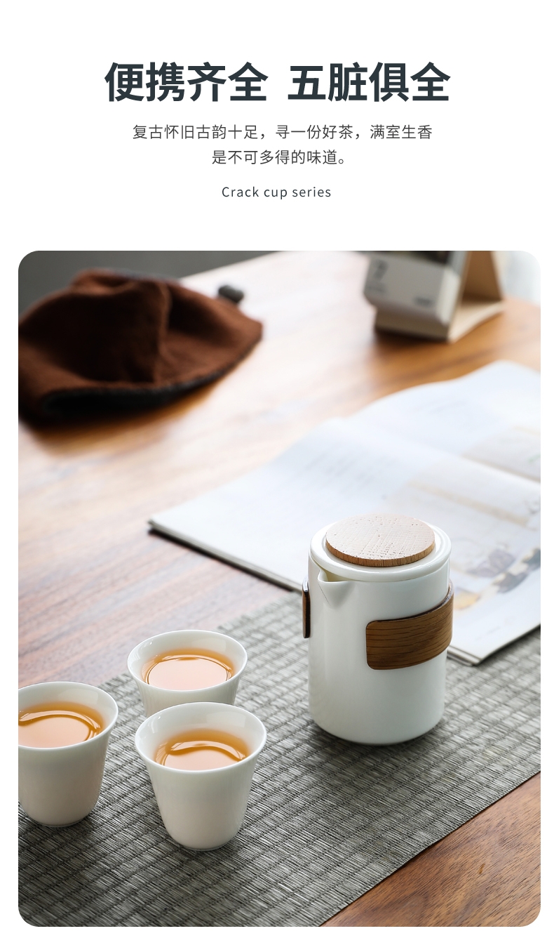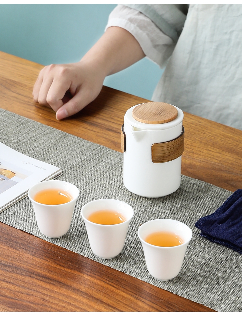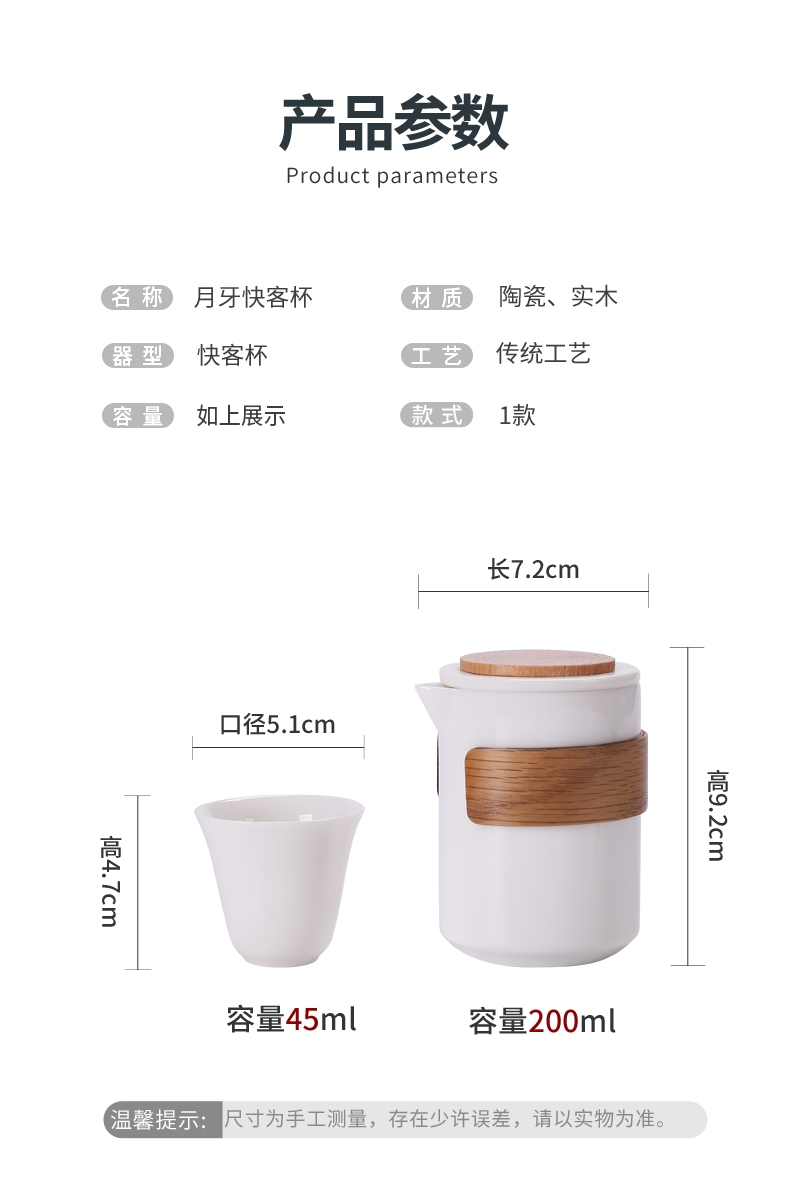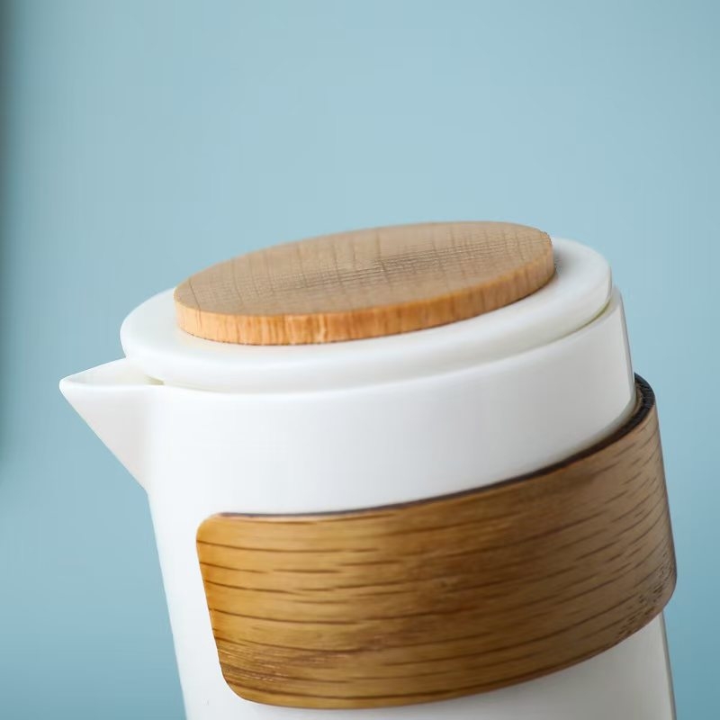 三个杯子可与壶上下重叠组合。实木盖子手柄,隔热防烫;壶盖自带过滤孔,过滤茶渣,方便携带,简单实用。;高档羊脂玉瓷,瓷质细腻温润,触感舒适。似凝脂,