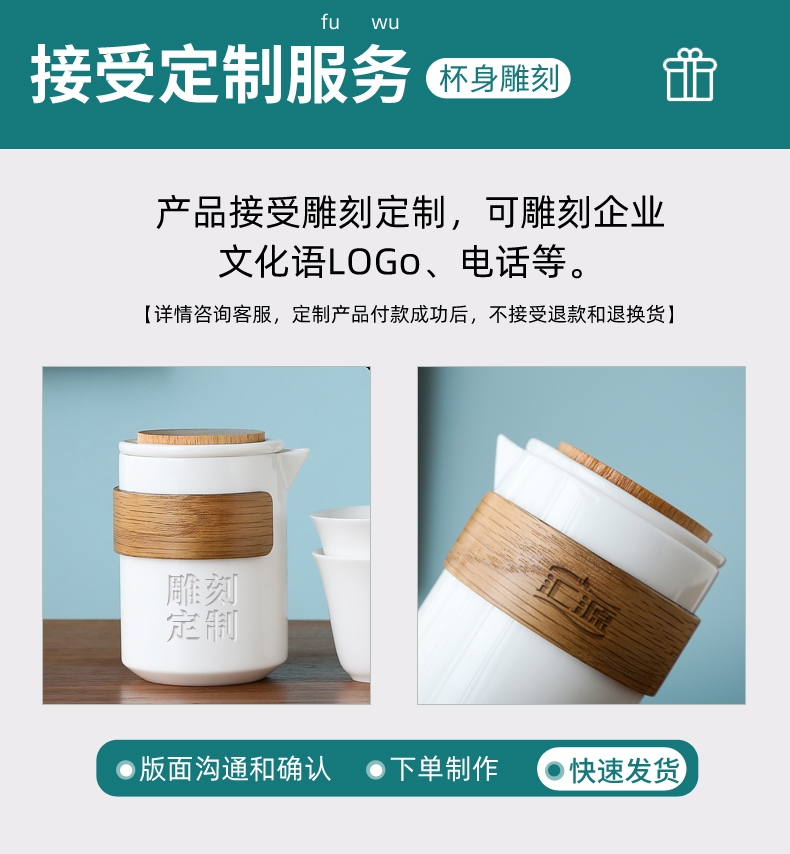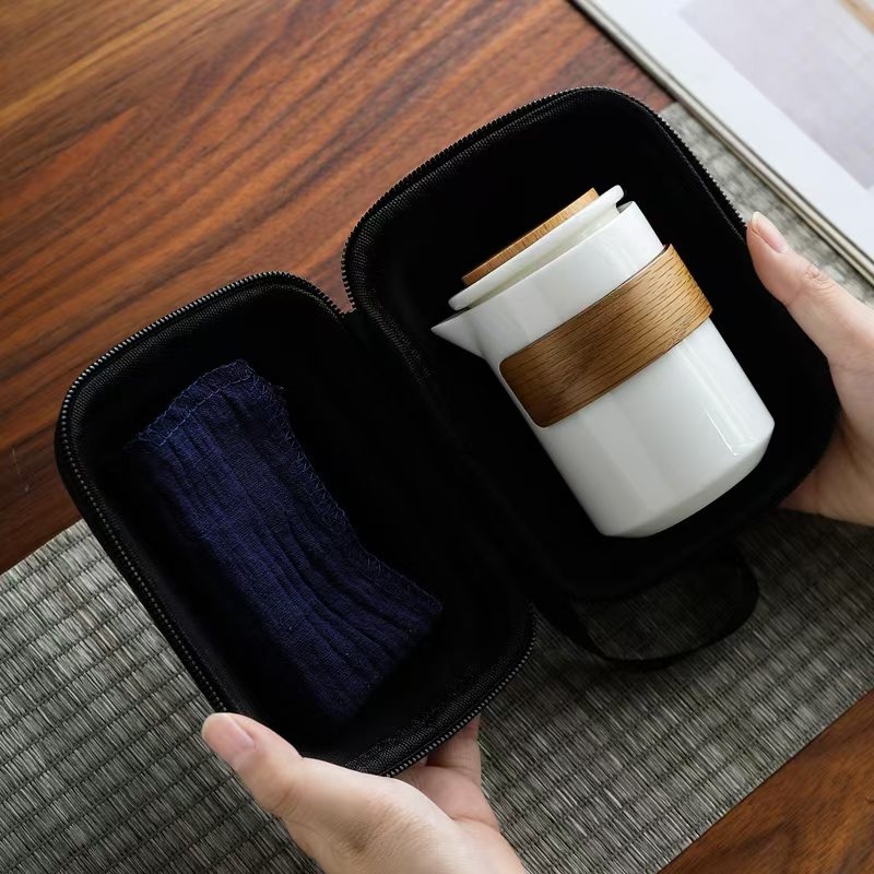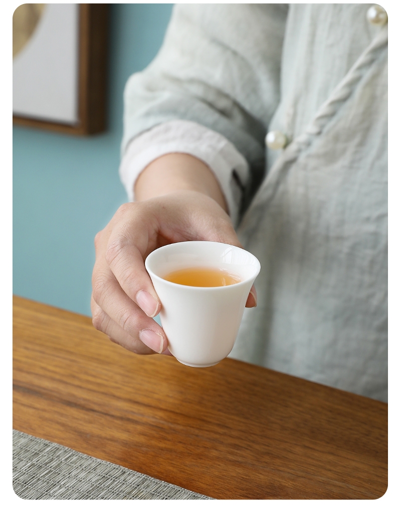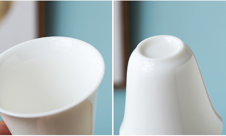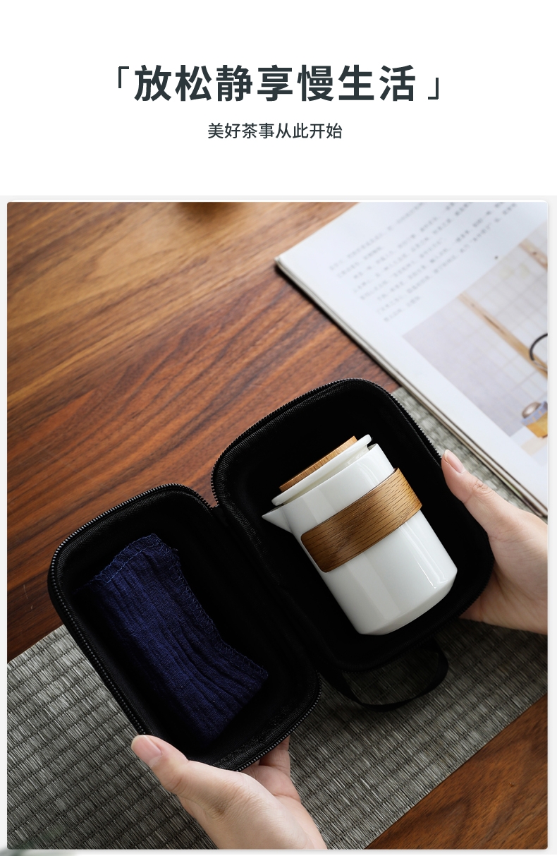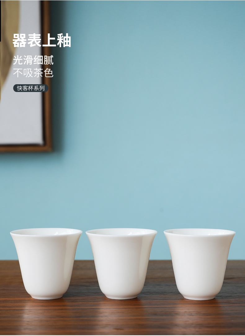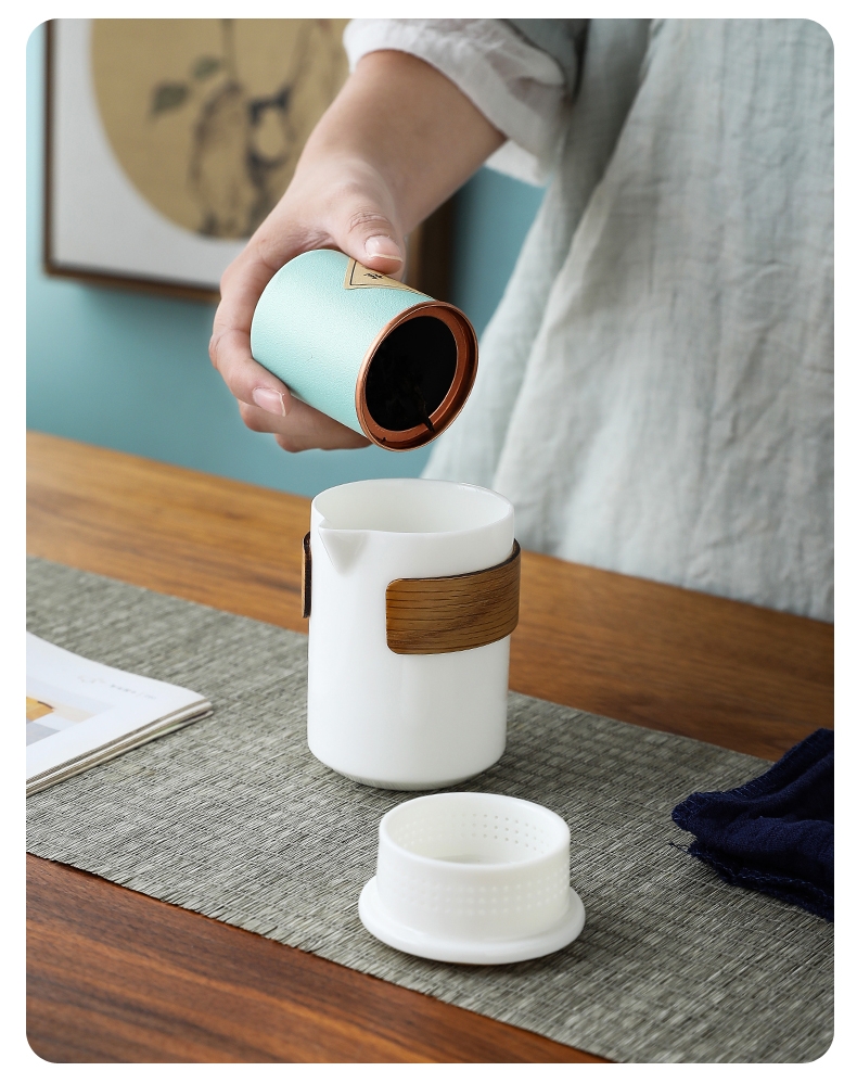 三个杯子可与壶上下重叠组合。实木盖子手柄,隔热防烫;壶盖自带过滤孔,过滤茶渣,方便携带,简单实用。;高档羊脂玉瓷,瓷质细腻温润,触感舒适。似凝脂,